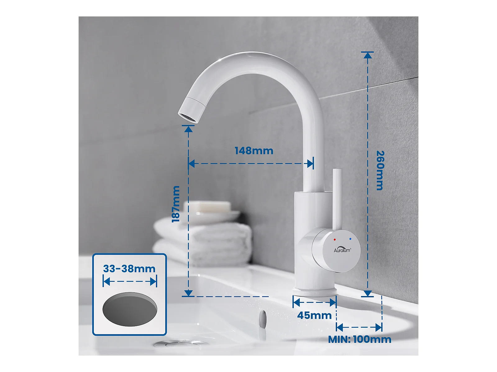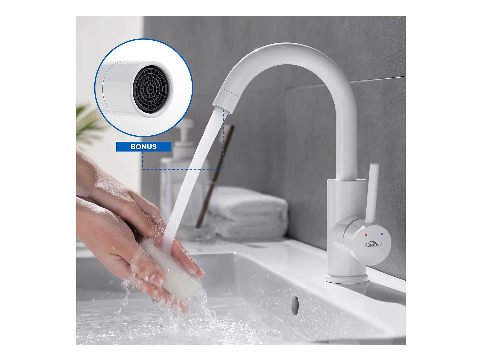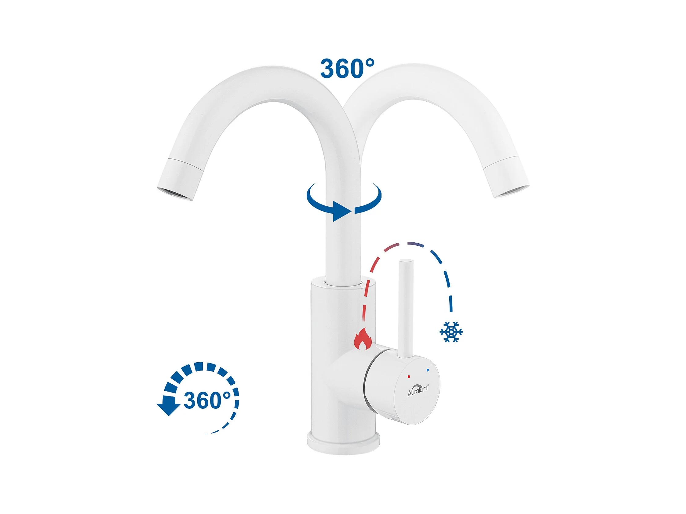 Mezclador de Lavabo, AuraLum Max Grifo Alto Giratorio de 360°, Grifo Monomando para Lavabo de Baño con Aireador Desmontable, Blanco,Modelo UE