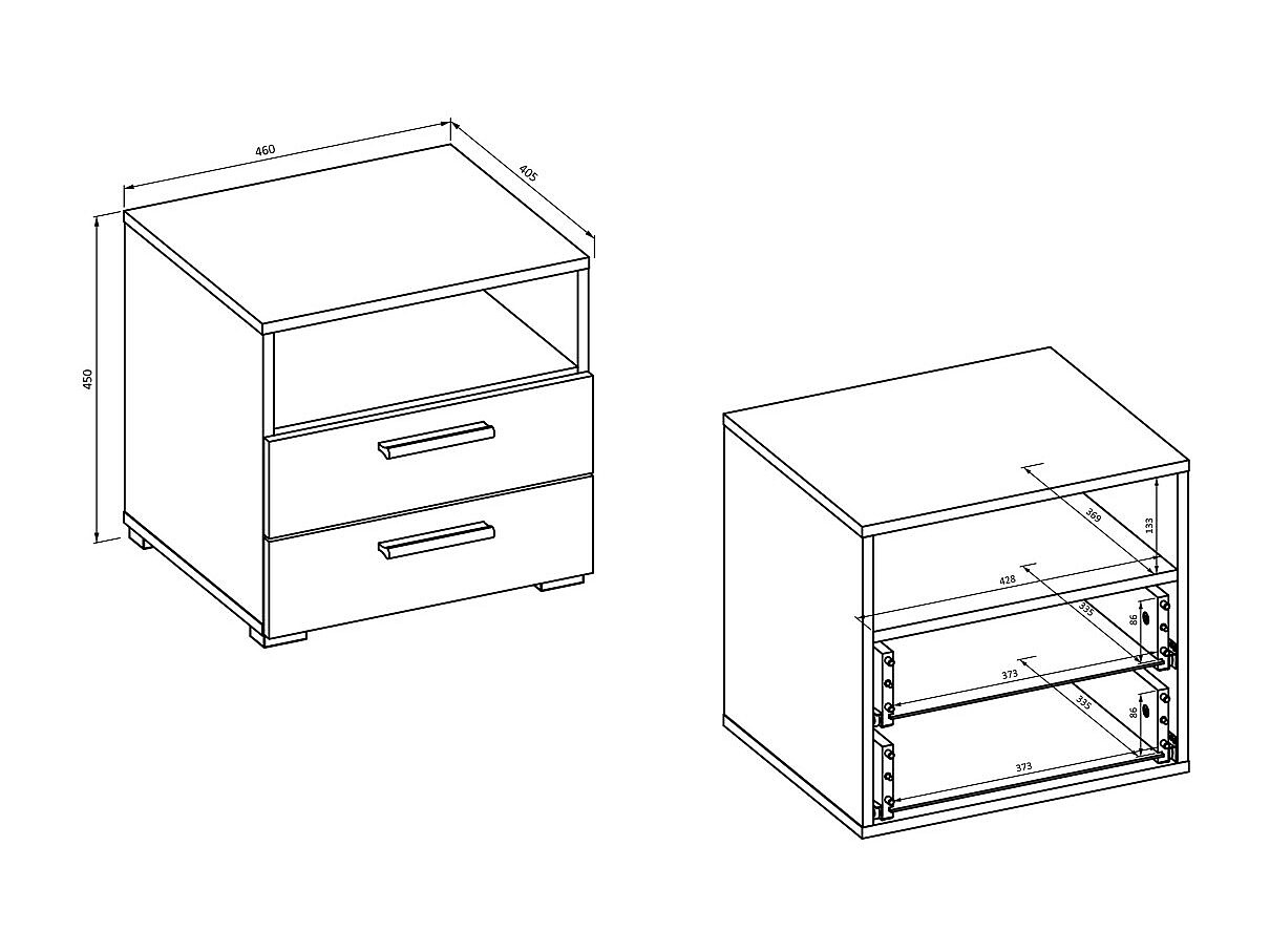 Dormitorio completo FOX: Armario de 200 cm, Cama de 180x200, cómoda, mesitas de noche. Color roble claro y negro.
