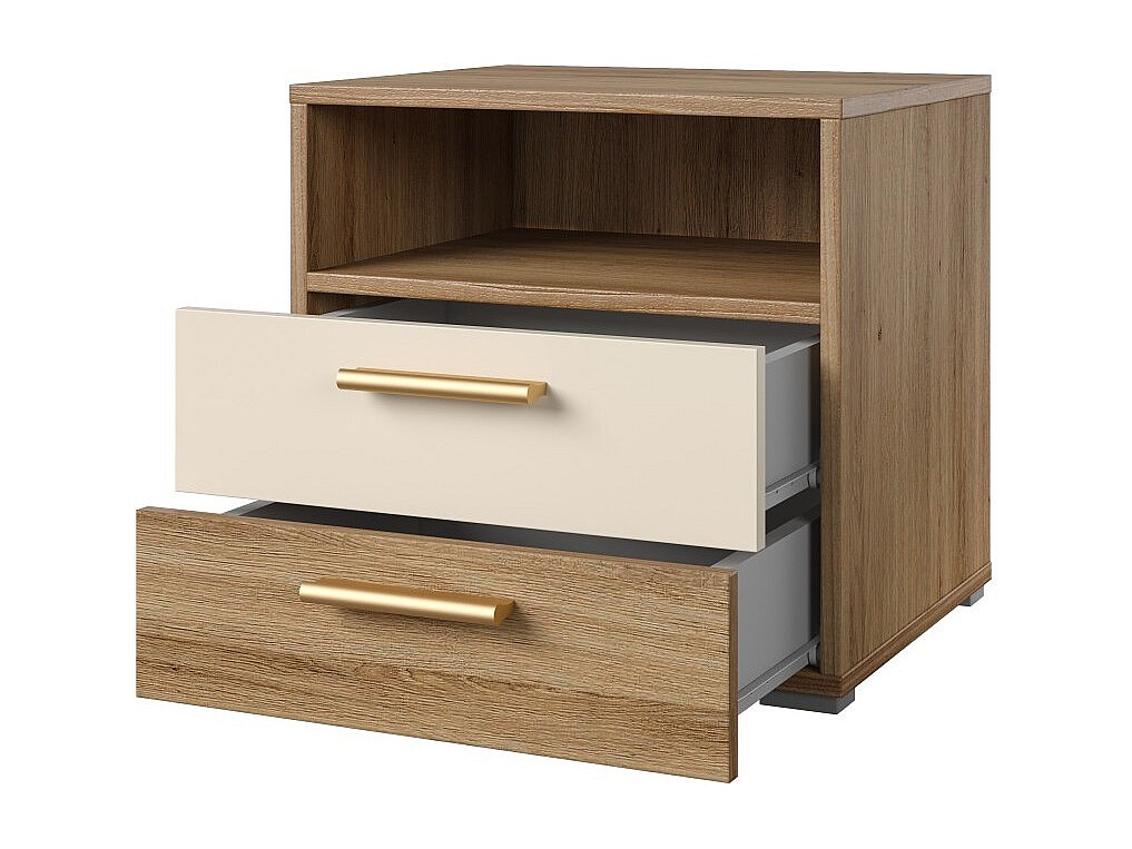 Dormitorio completo FOX: Armario de 200 cm, Cama de 180x200, cómoda, mesitas de noche. Color roble claro y negro.