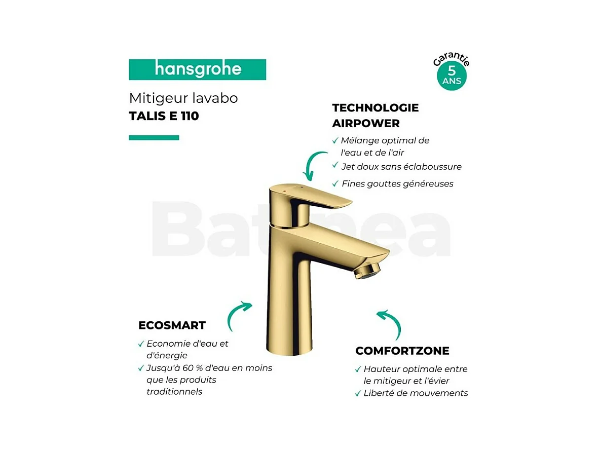 HANSGROHE Mezclador de lavabo Talis E 110, sin desagüe automático ni extraíble, aspecto dorado pulido