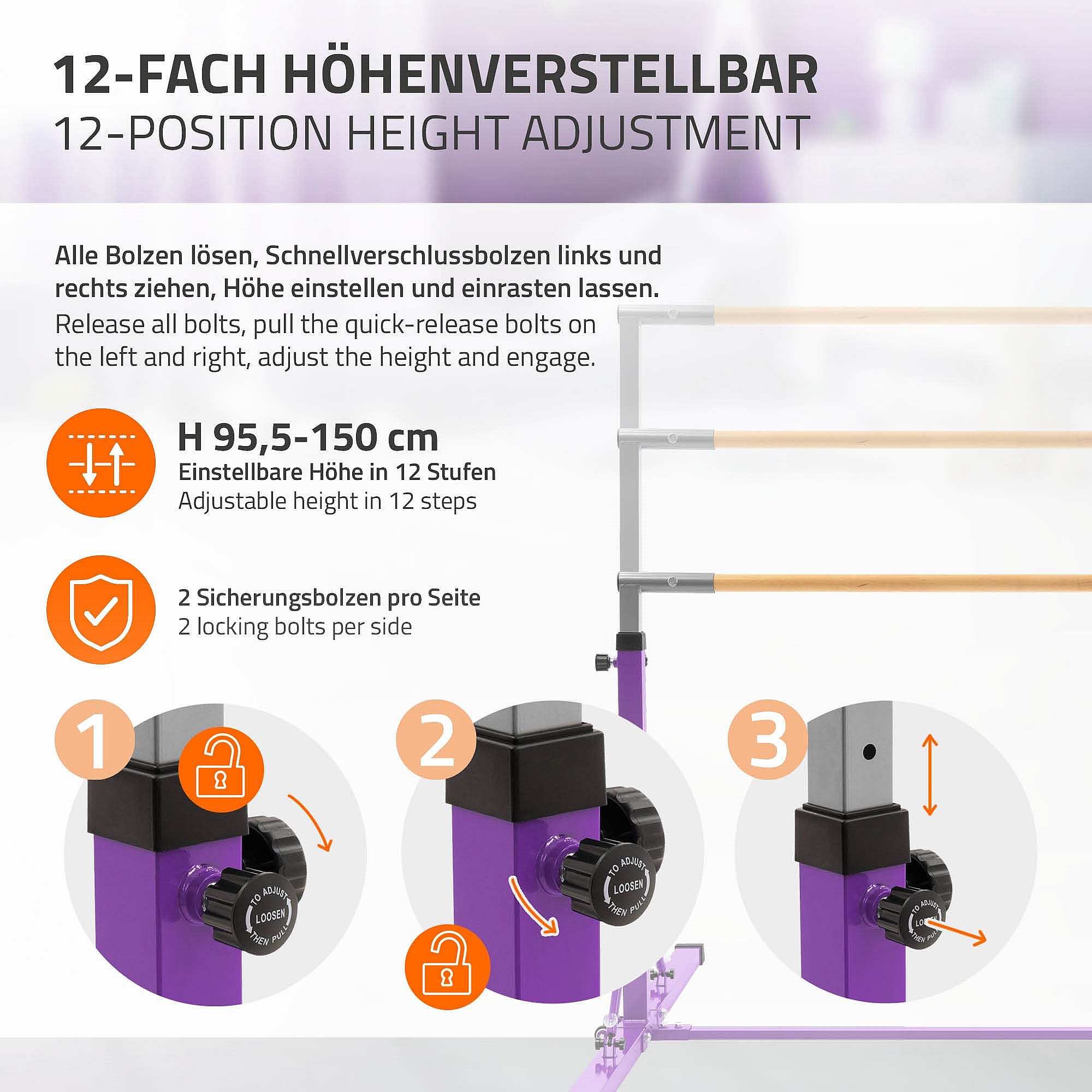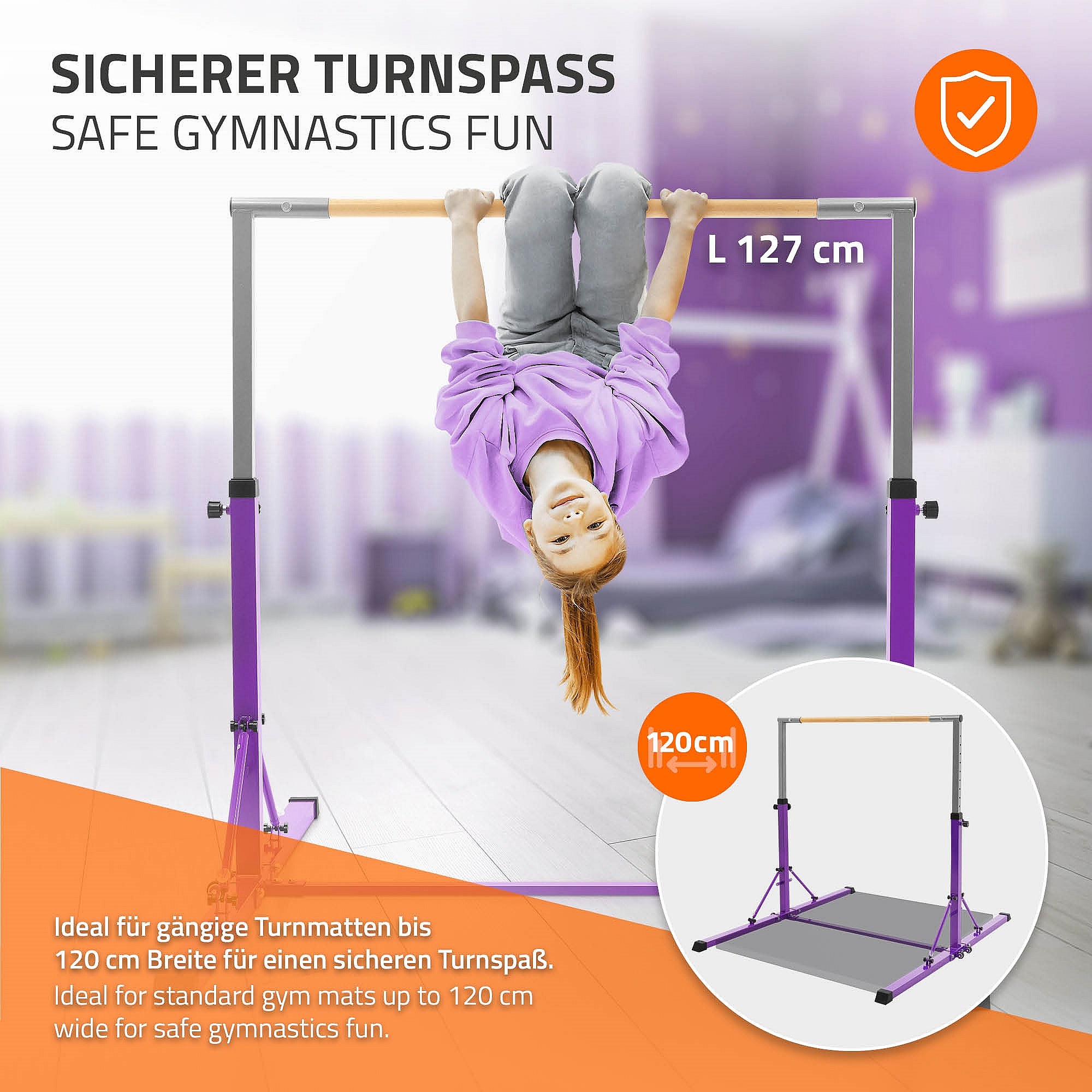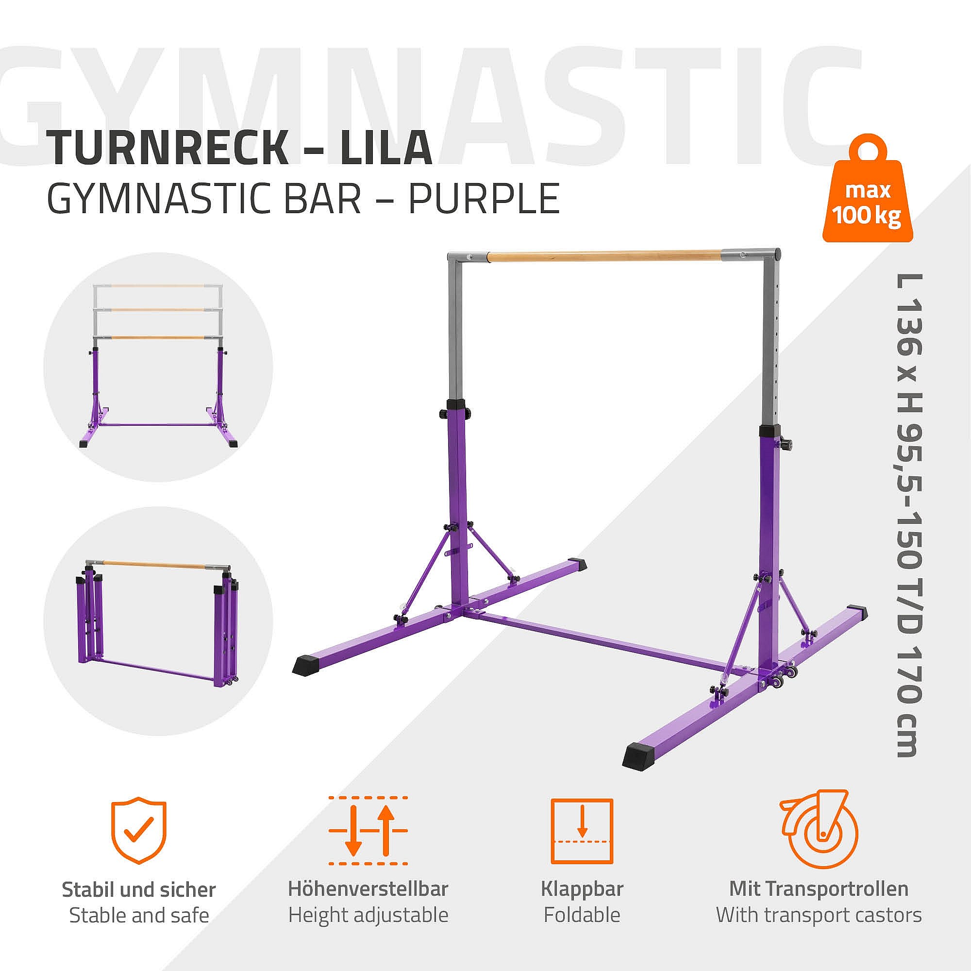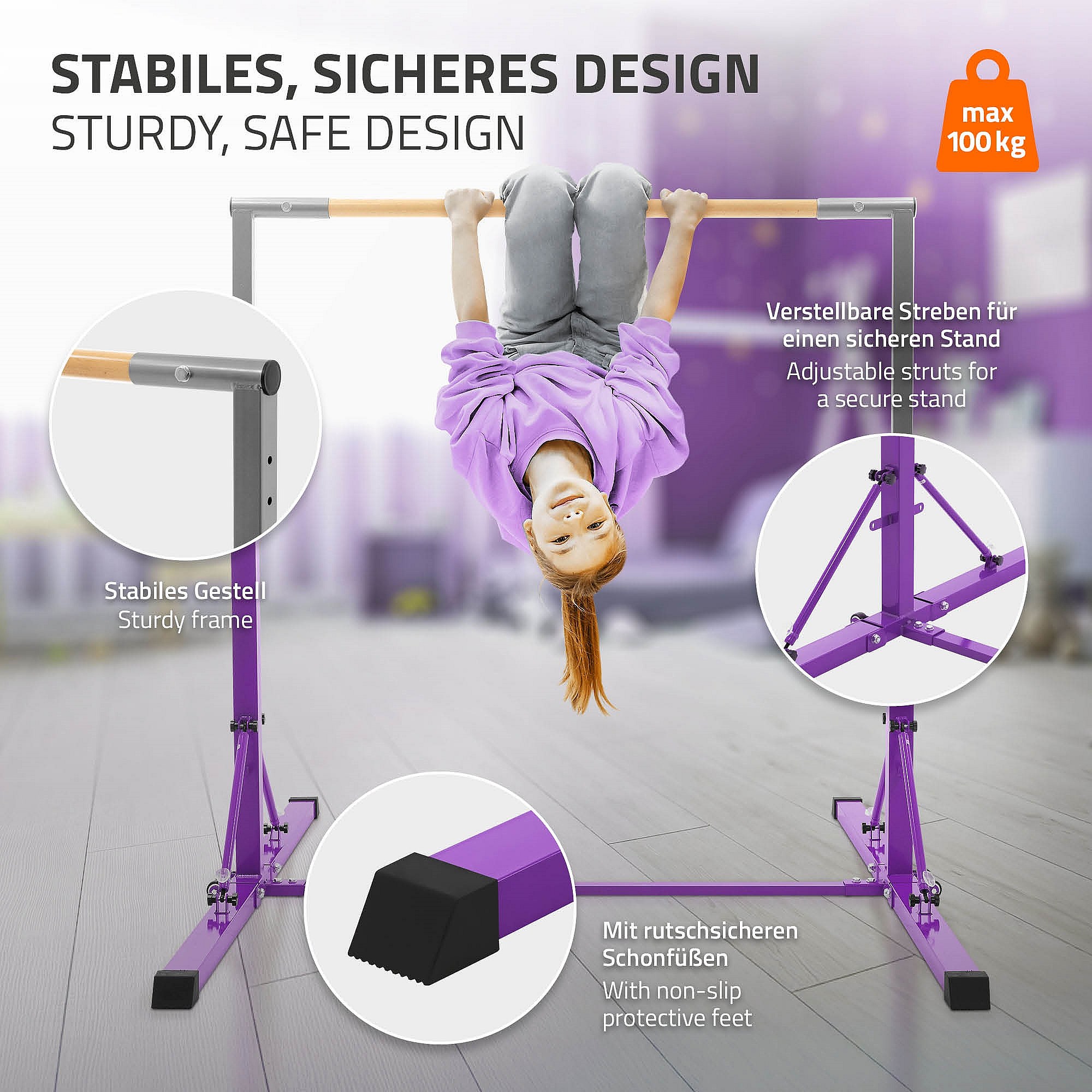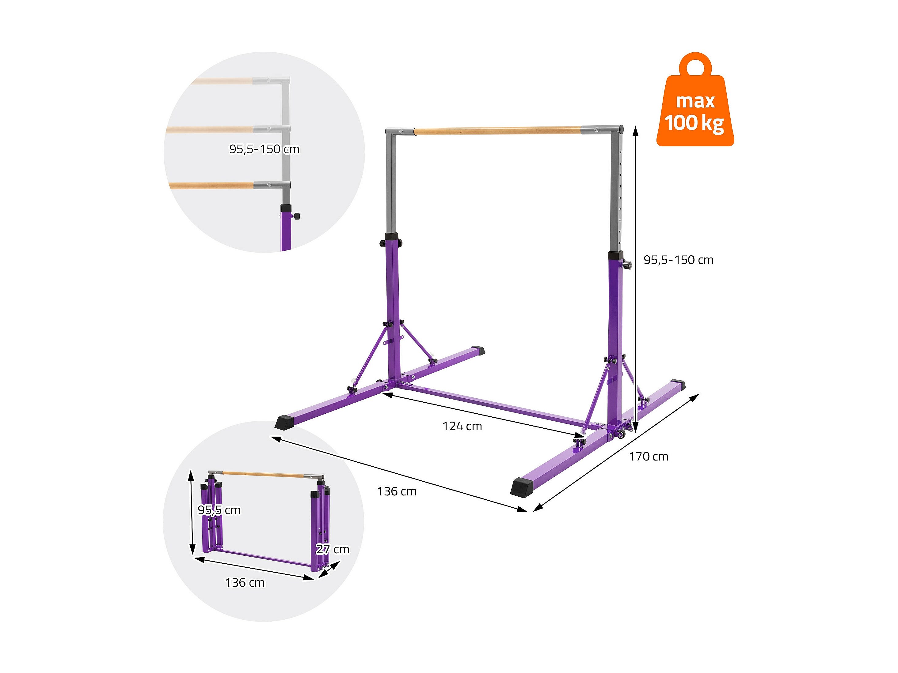 Hauki Barra de gimansia artística horizontal para niños, púrpura equipo de entrenamiento infantil plegable altura teléscopica 95,5-150cm madera/acero