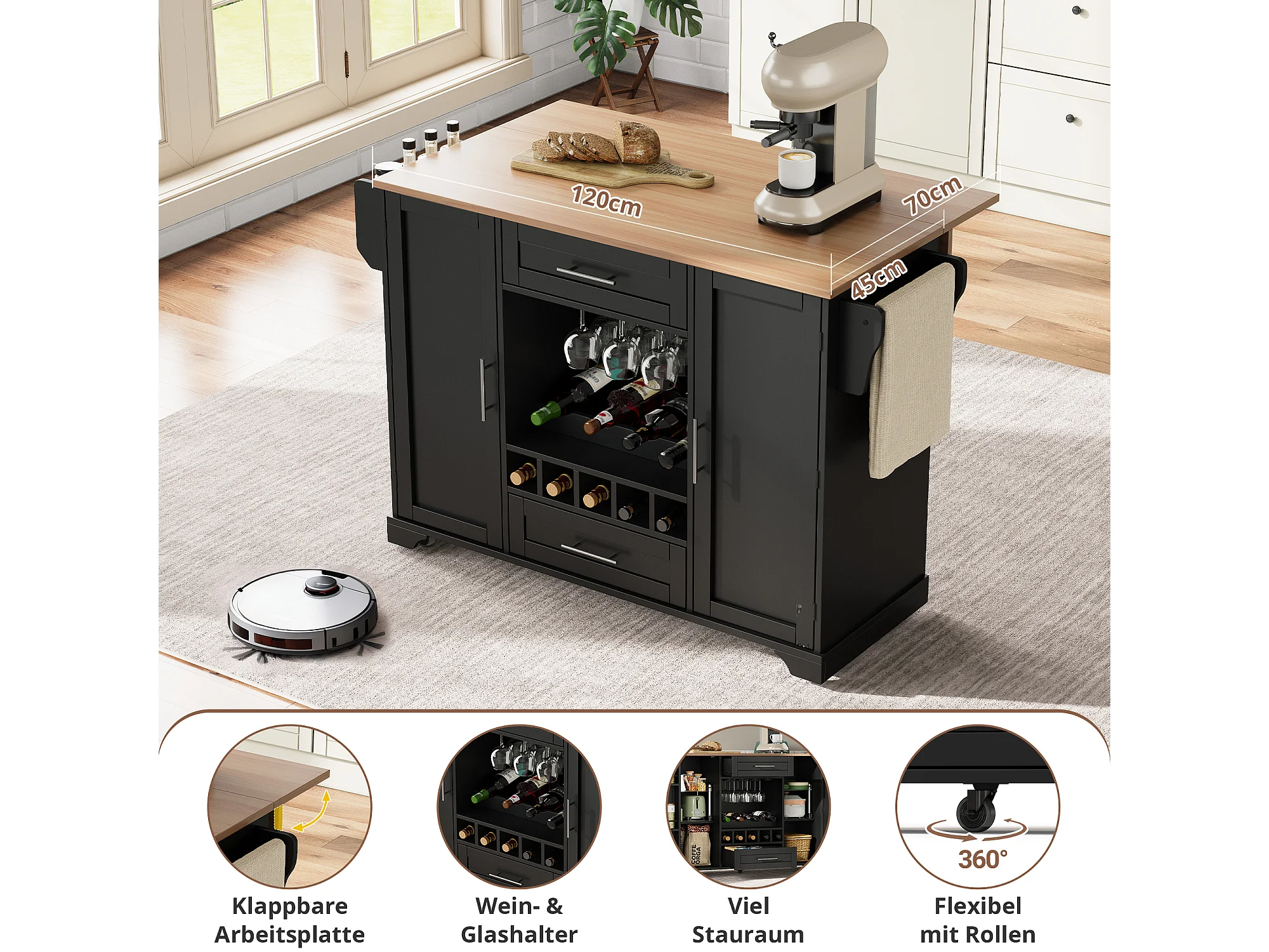 Isla de cocina móvil con encimera abatible - 120 x 45/70 x 89 cm - con 2 puertas + 2 cajones - MDF - negro