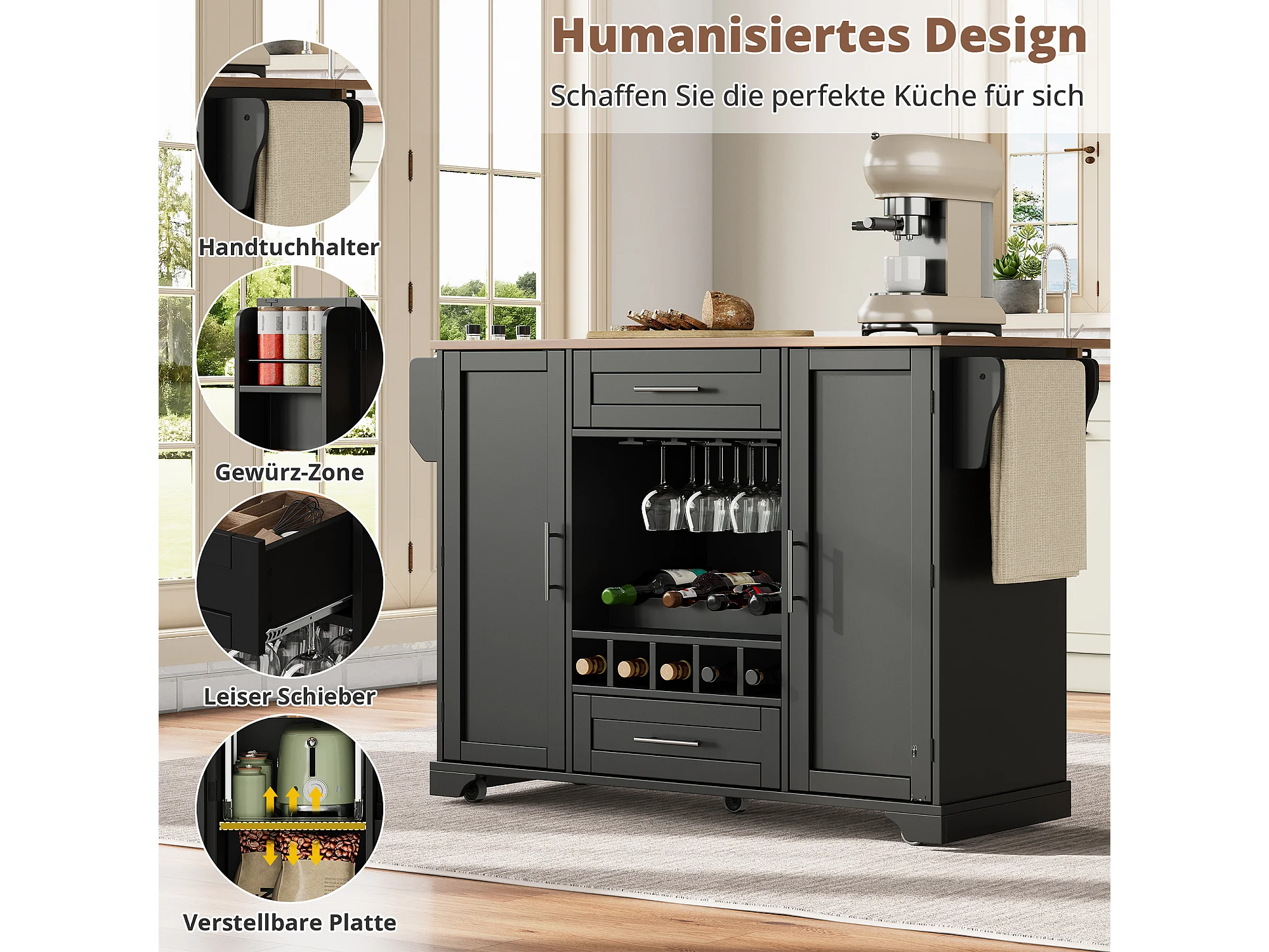 Isla central con ruedas - 129 x 46/71 x 91,5 cm - tapa abatible - con 3 puertas + 2 cajones - MDF - negro