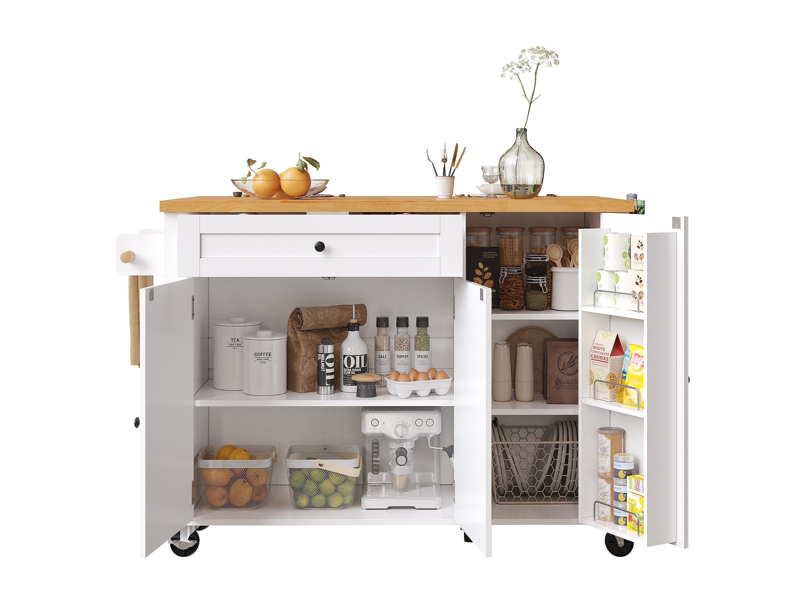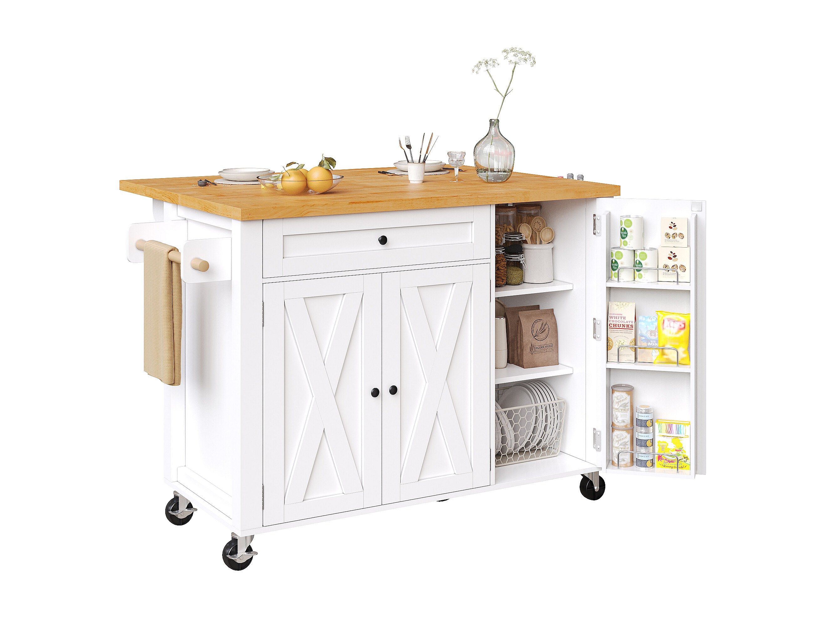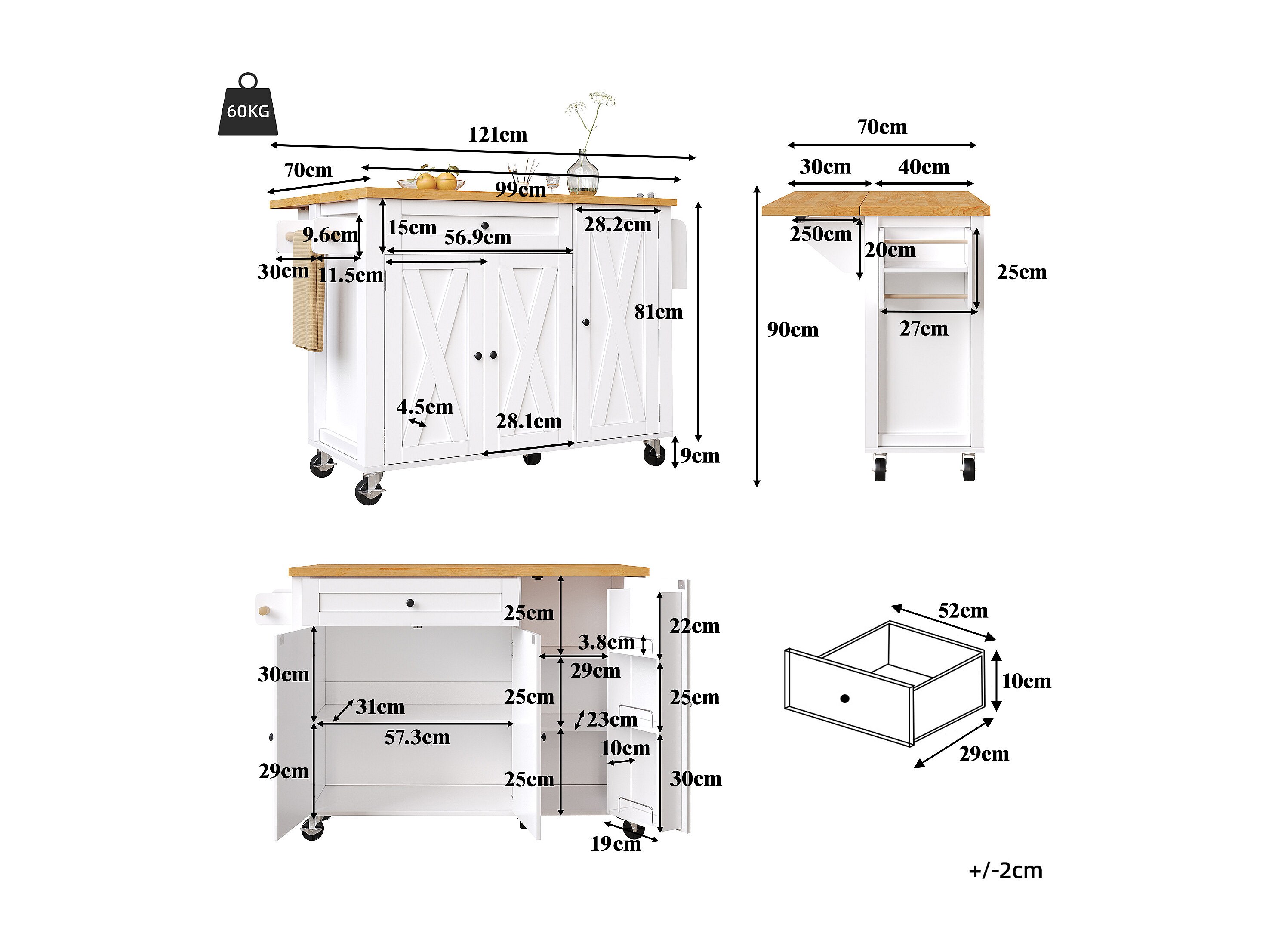 Isla de cocina central móvil - Tablero extensible - 121x70x90 cm - 1 cajón y 3 puertas - con toallero - MDF - Blanco