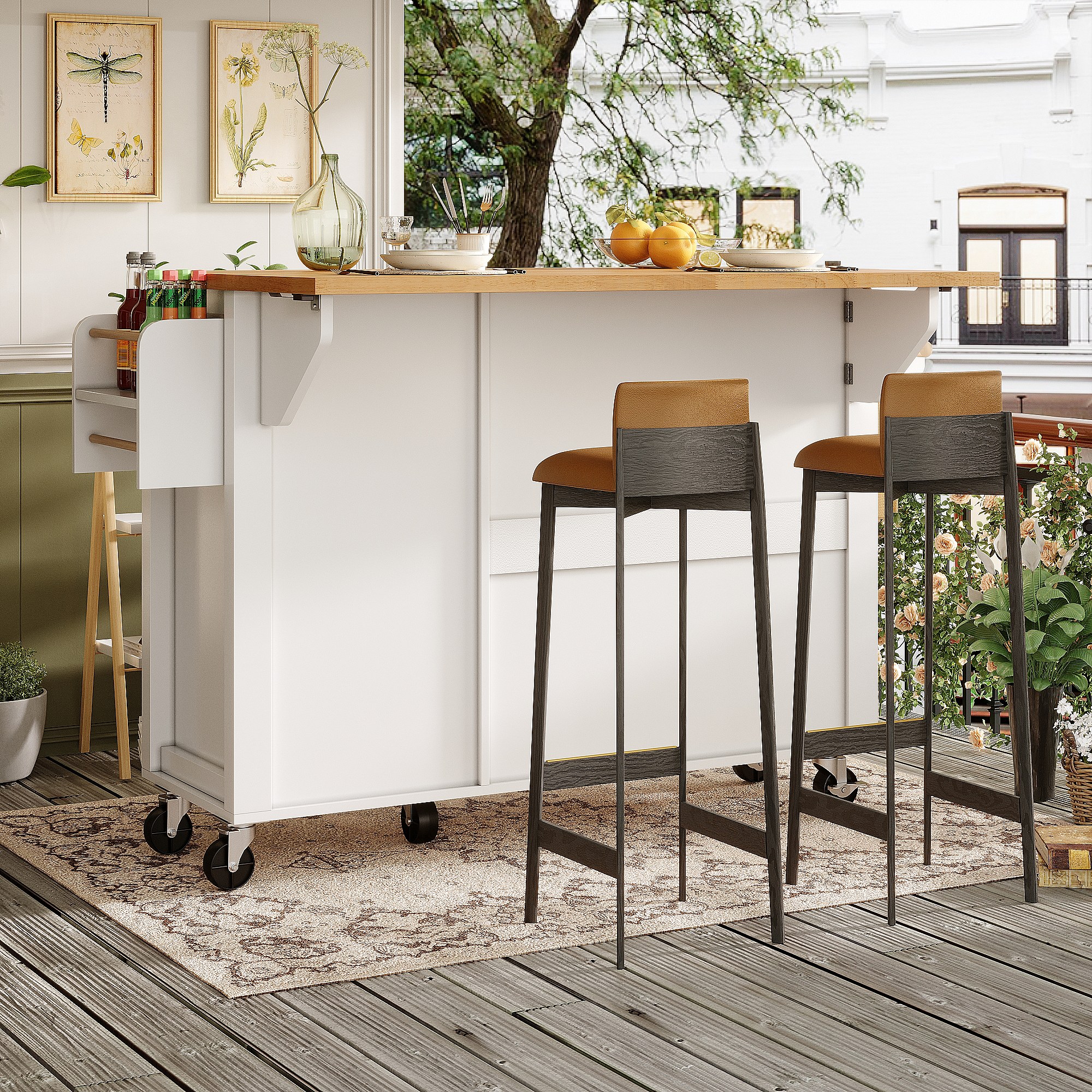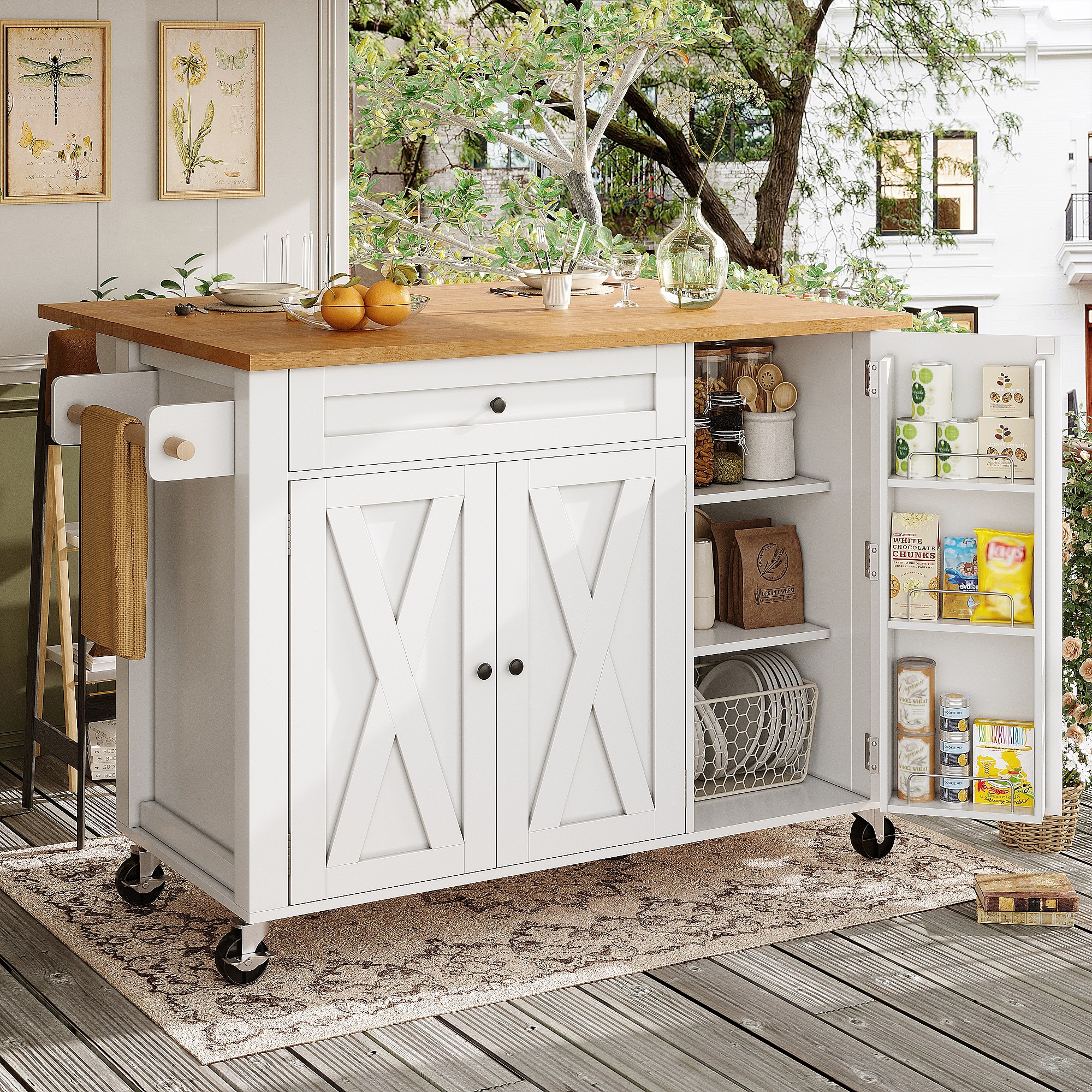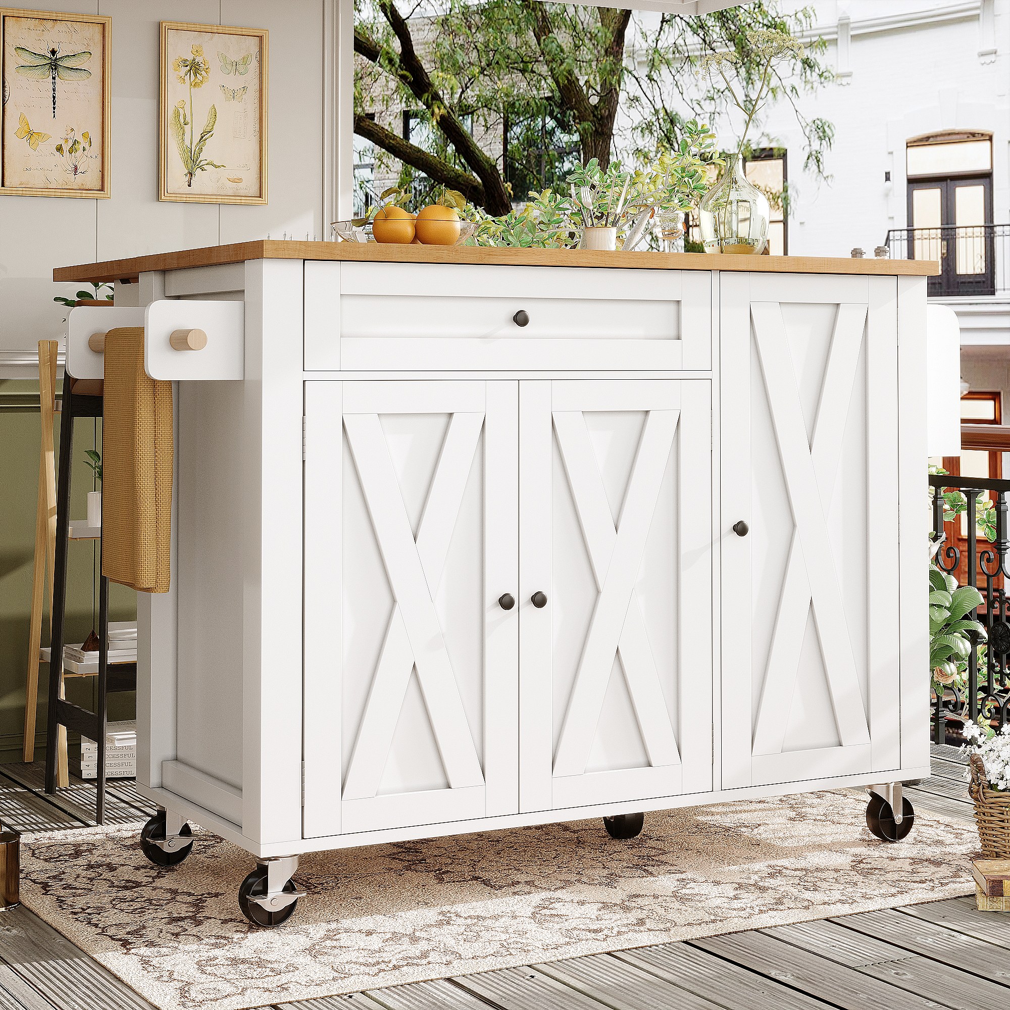 Isla de cocina central móvil - Tablero extensible - 121x70x90 cm - 1 cajón y 3 puertas - con toallero - MDF - Blanco