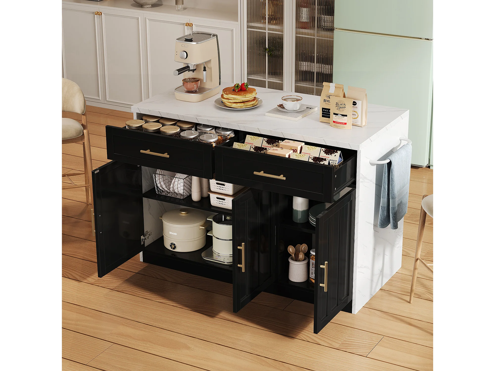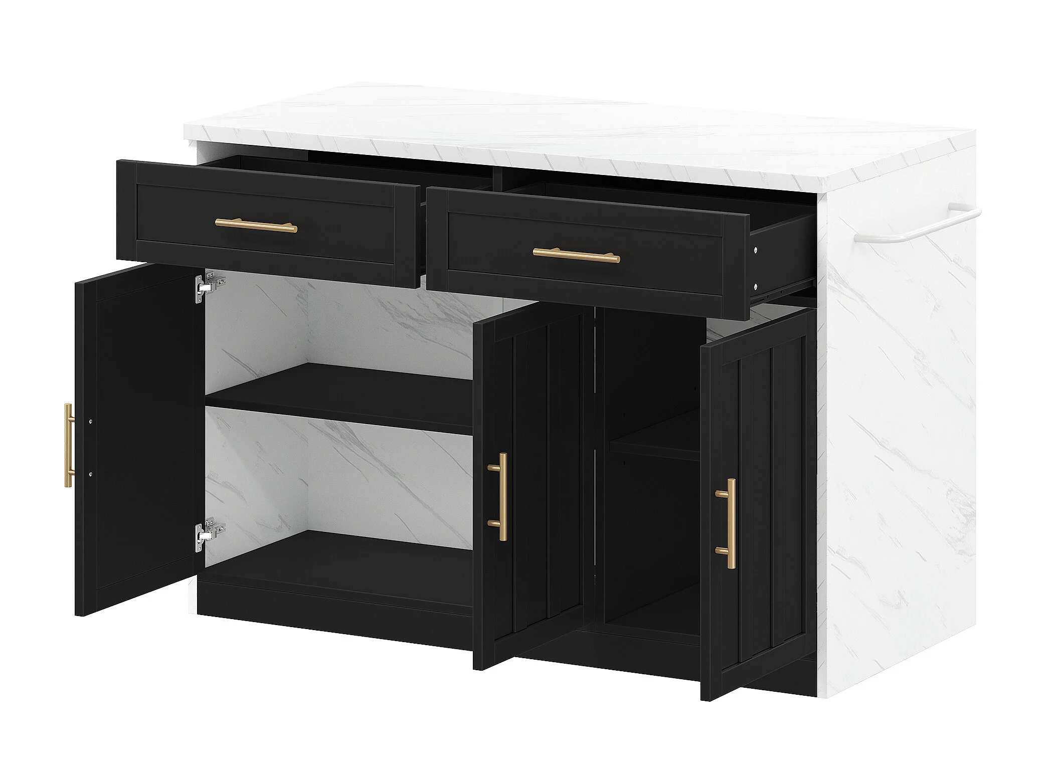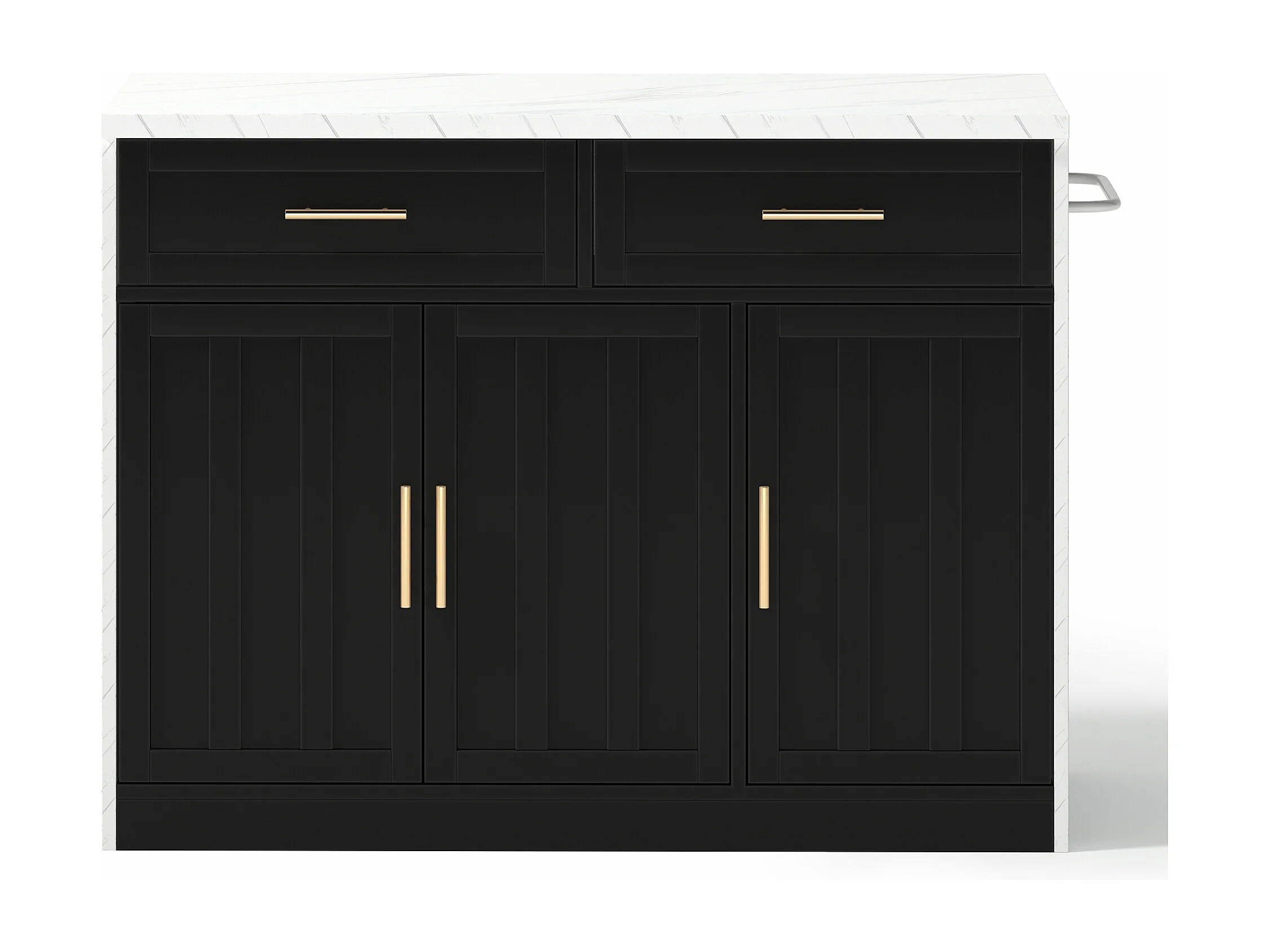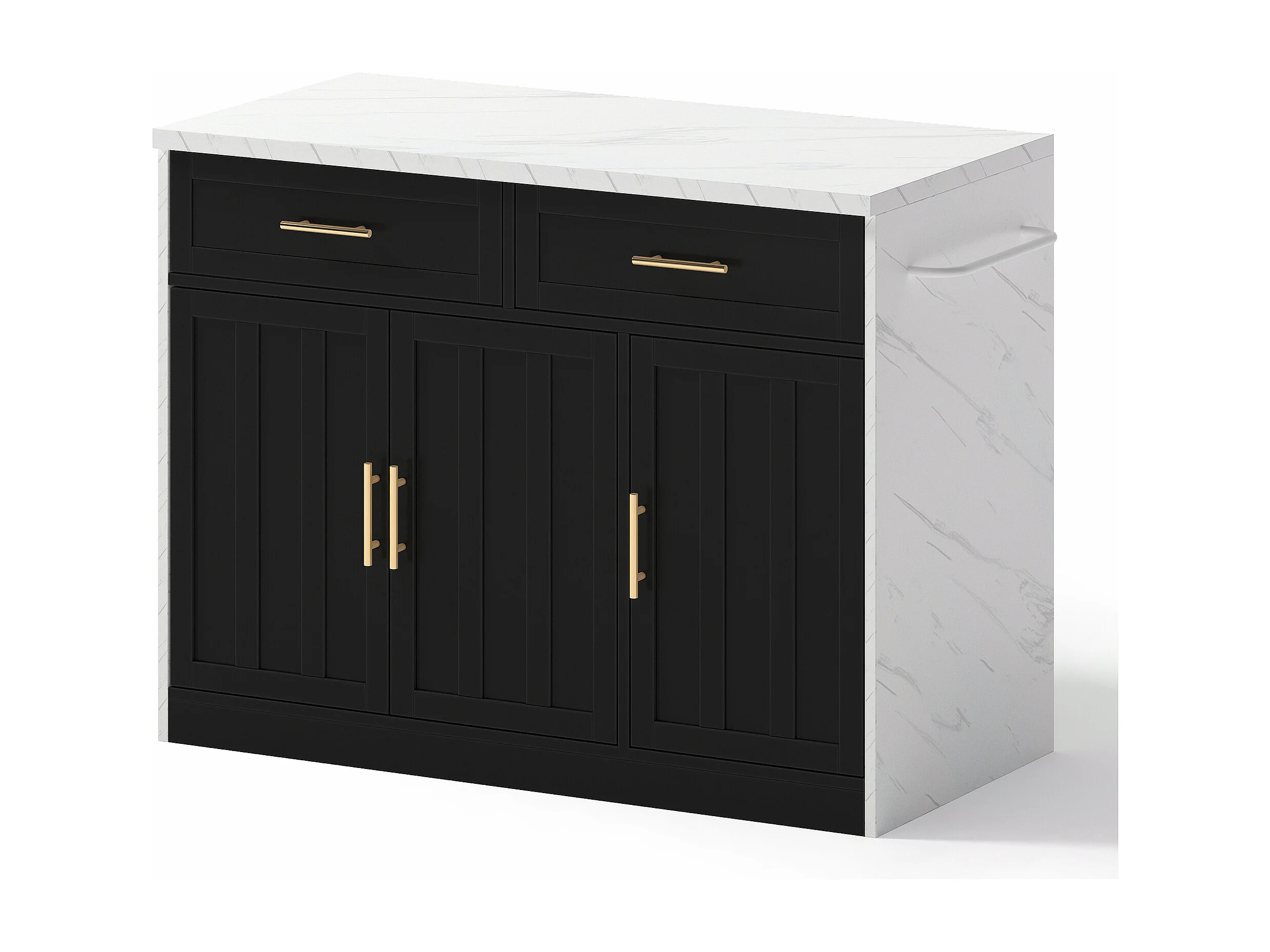 Isla de cocina con 2 cajones y 2 puertas, encimera chapada en mármol blanco, cuerpo negro - 100x90x90cm