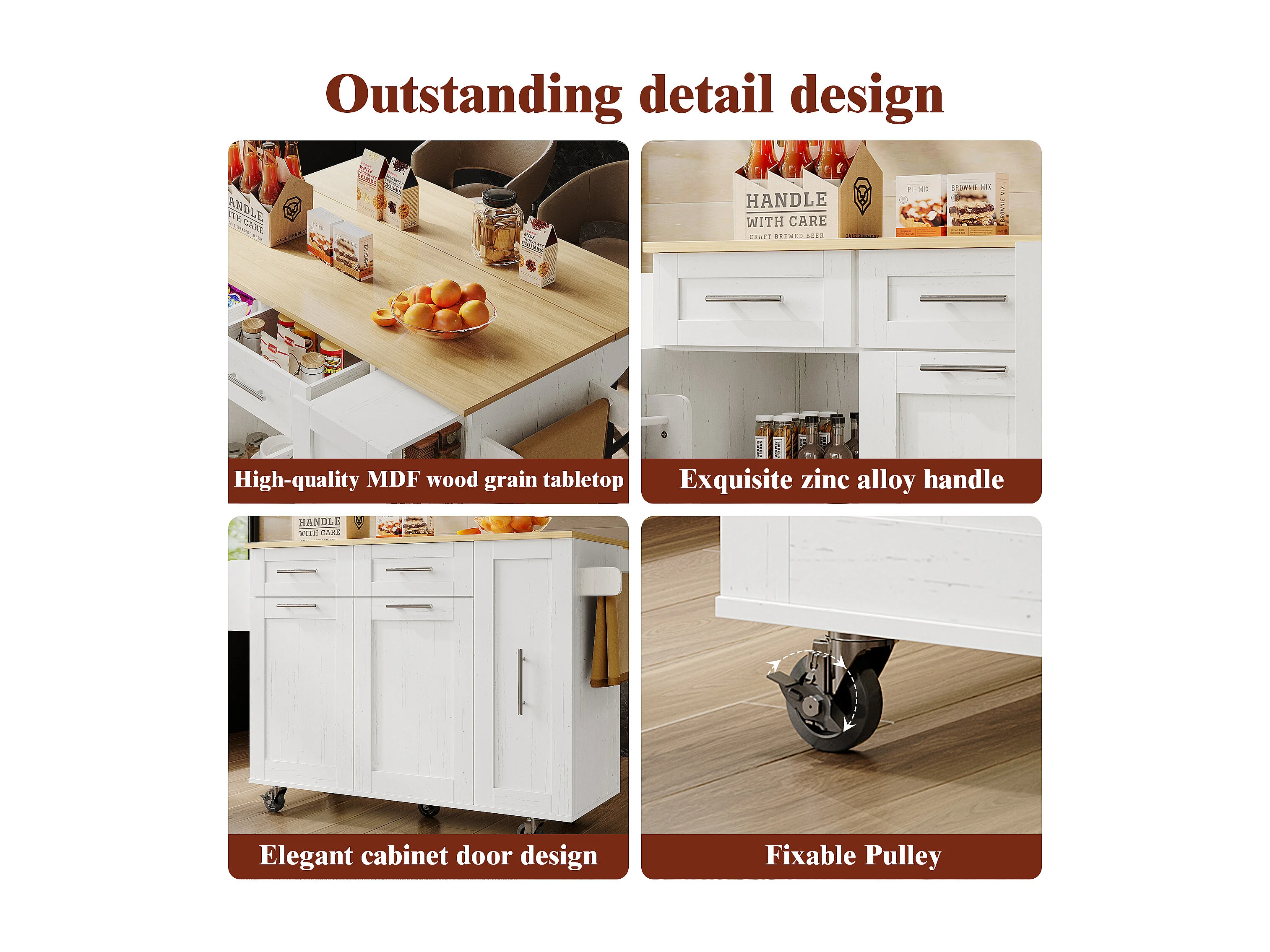 Isla de cocina con 3 puertas y 2 cajones - Encimera imitación madera - Madera MDF - Blanco y natural claro
