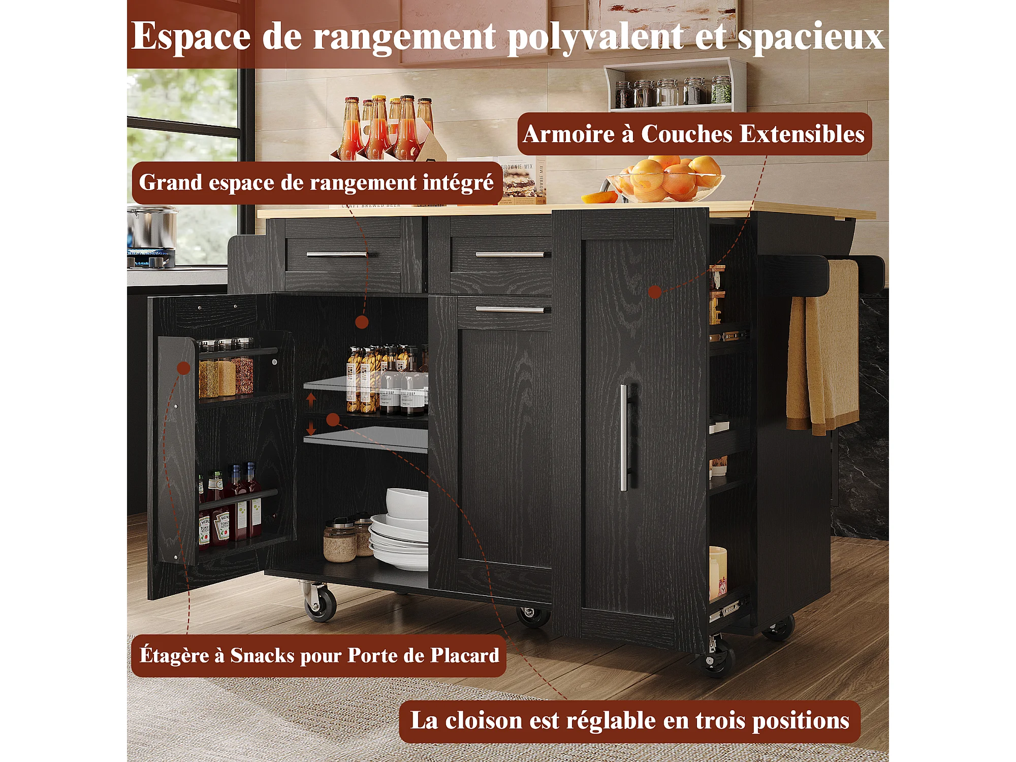 Isla de cocina con 3 puertas y 2 cajones - Encimera imitación madera - Madera MDF - Negro y natural claro