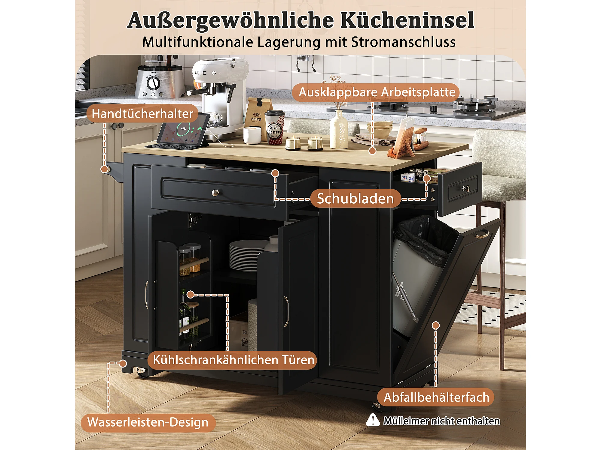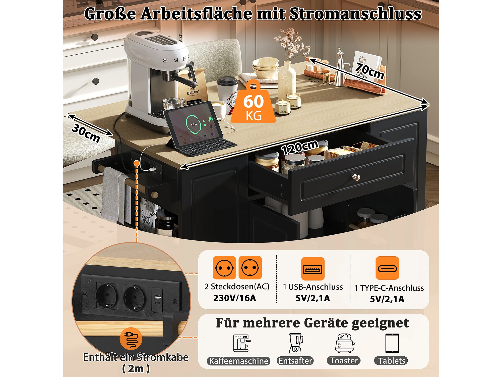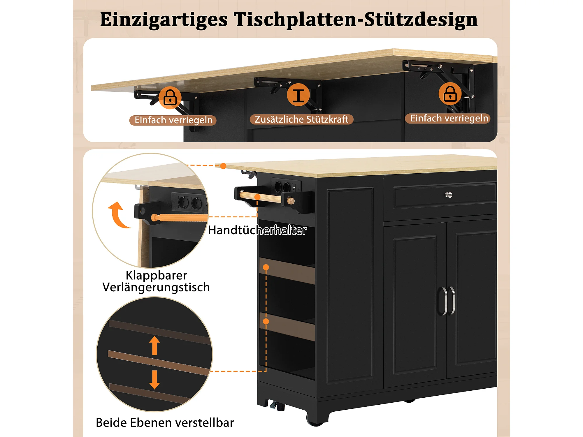 Isla central - 120 x 46 (70) x 91 cm - tablero plegable + ruedas Patas intercambiables - MDF - Negro