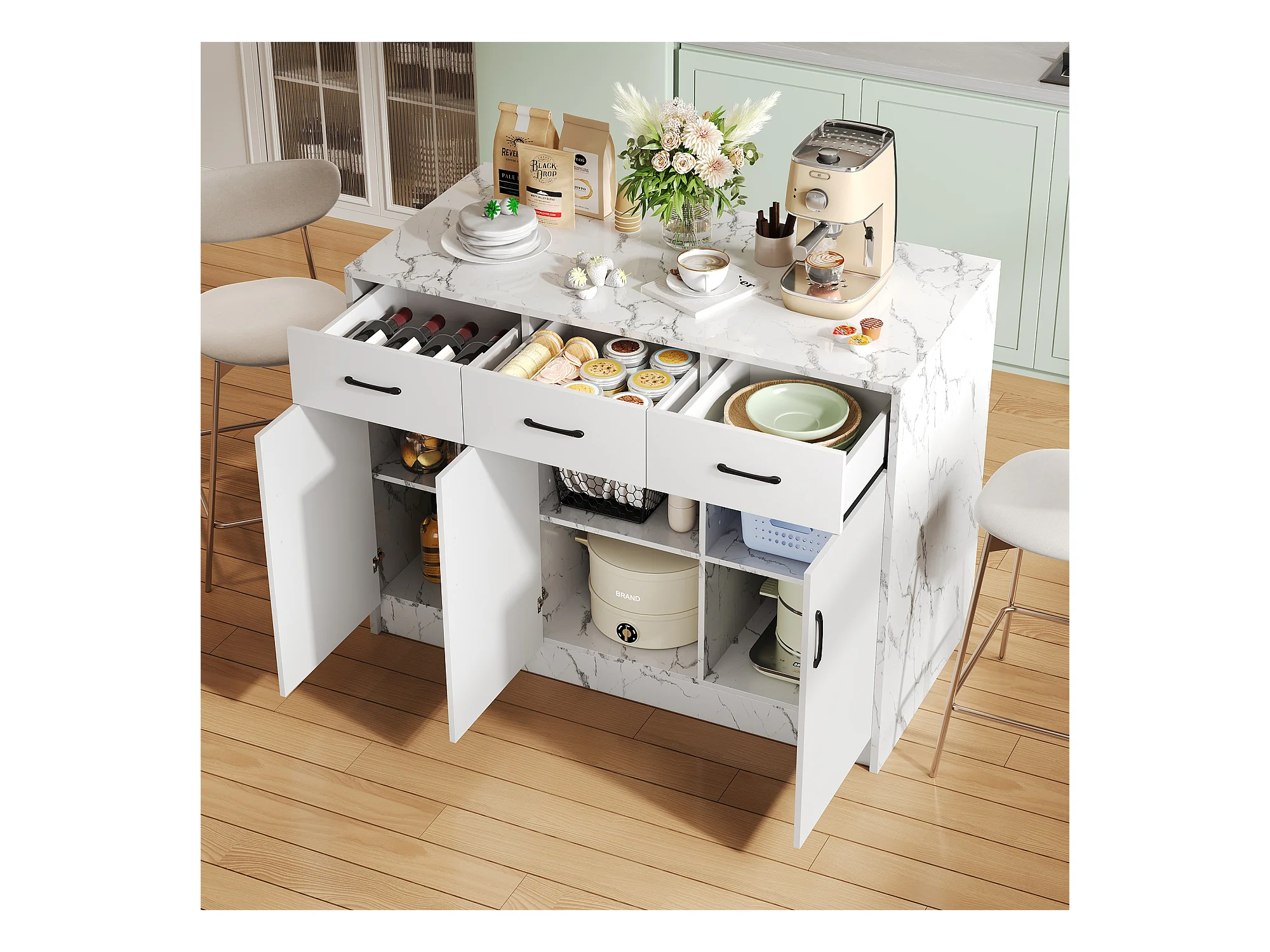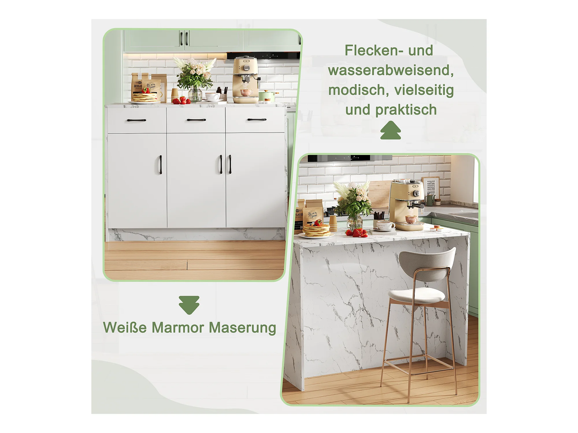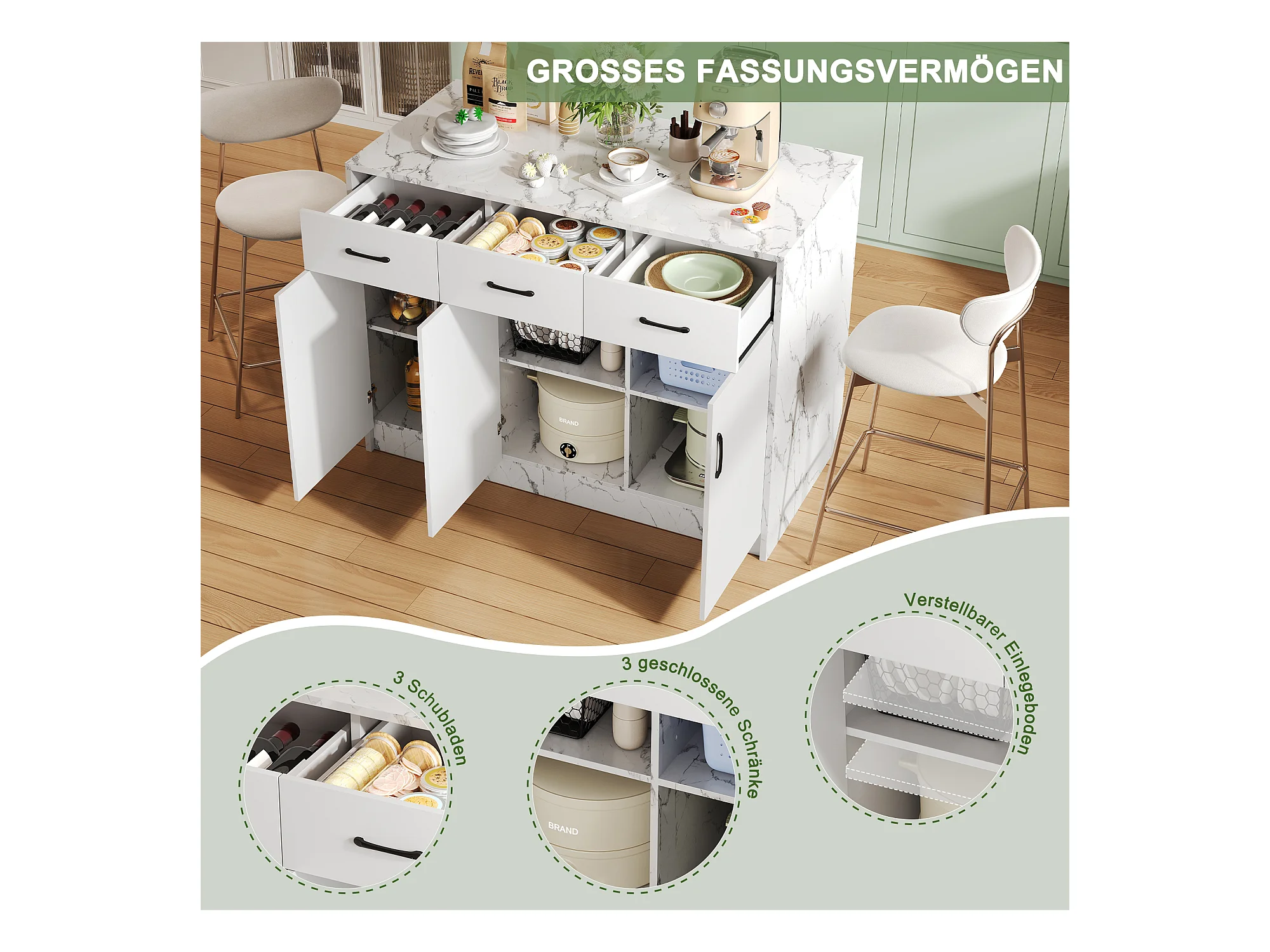 Isla de cocina moderna con encimera de imitación mármol, 3 cajones, almacenamiento multifuncional y cesta de pino, color blanco (120 x 45 x 90 cm)