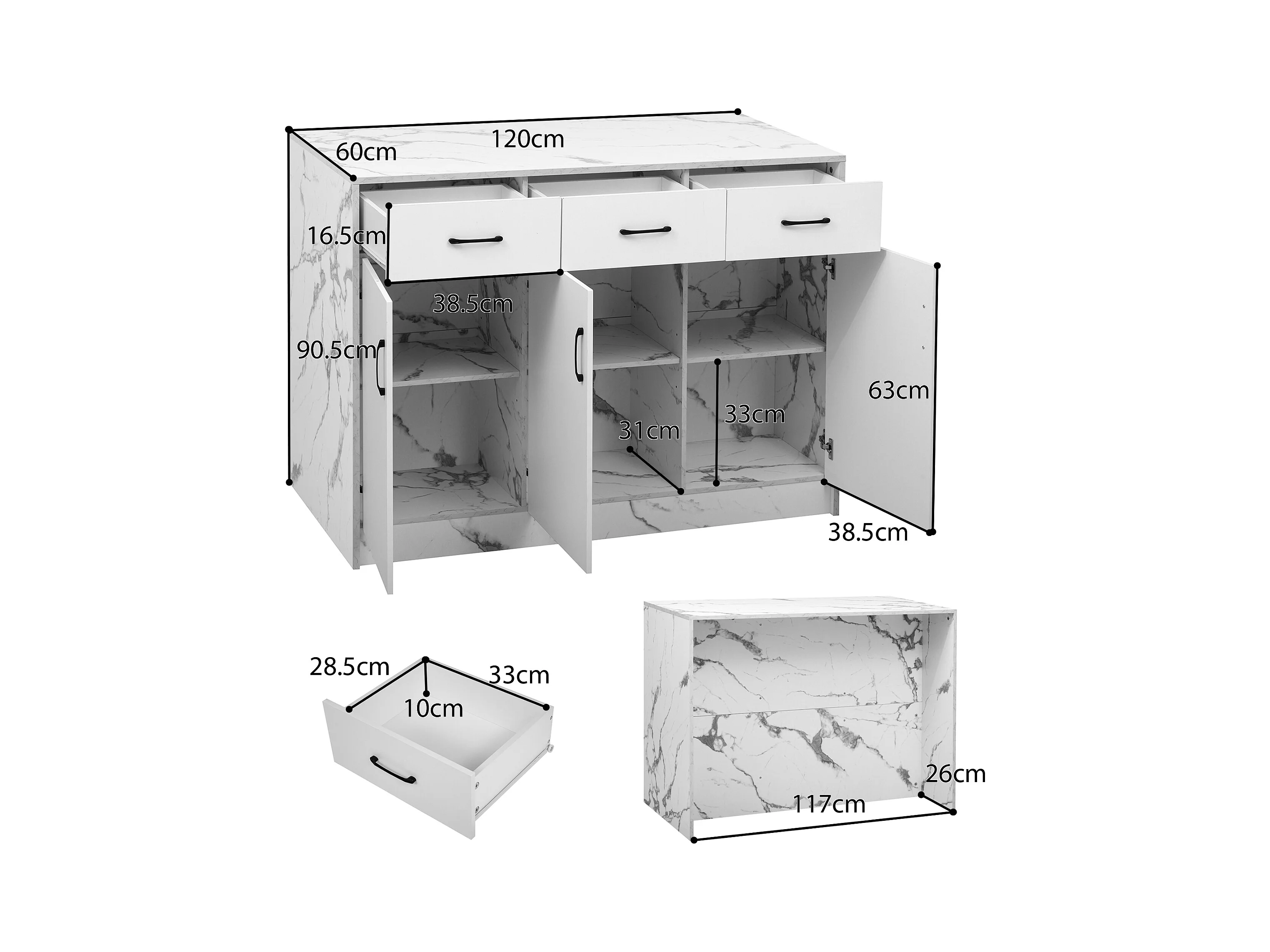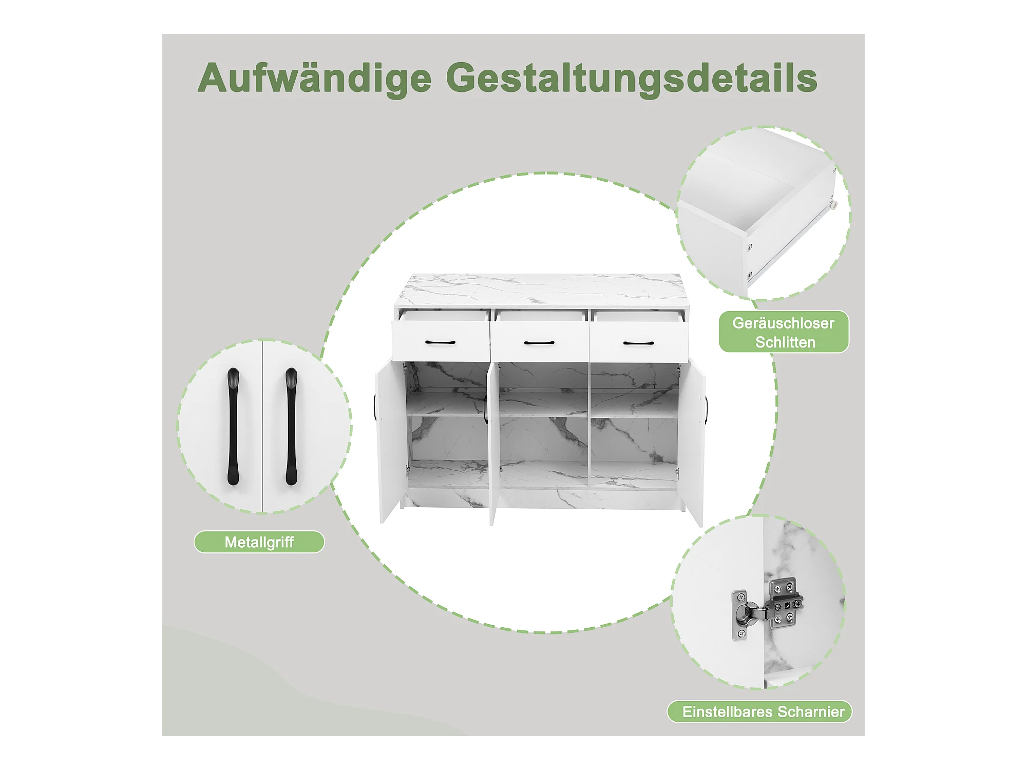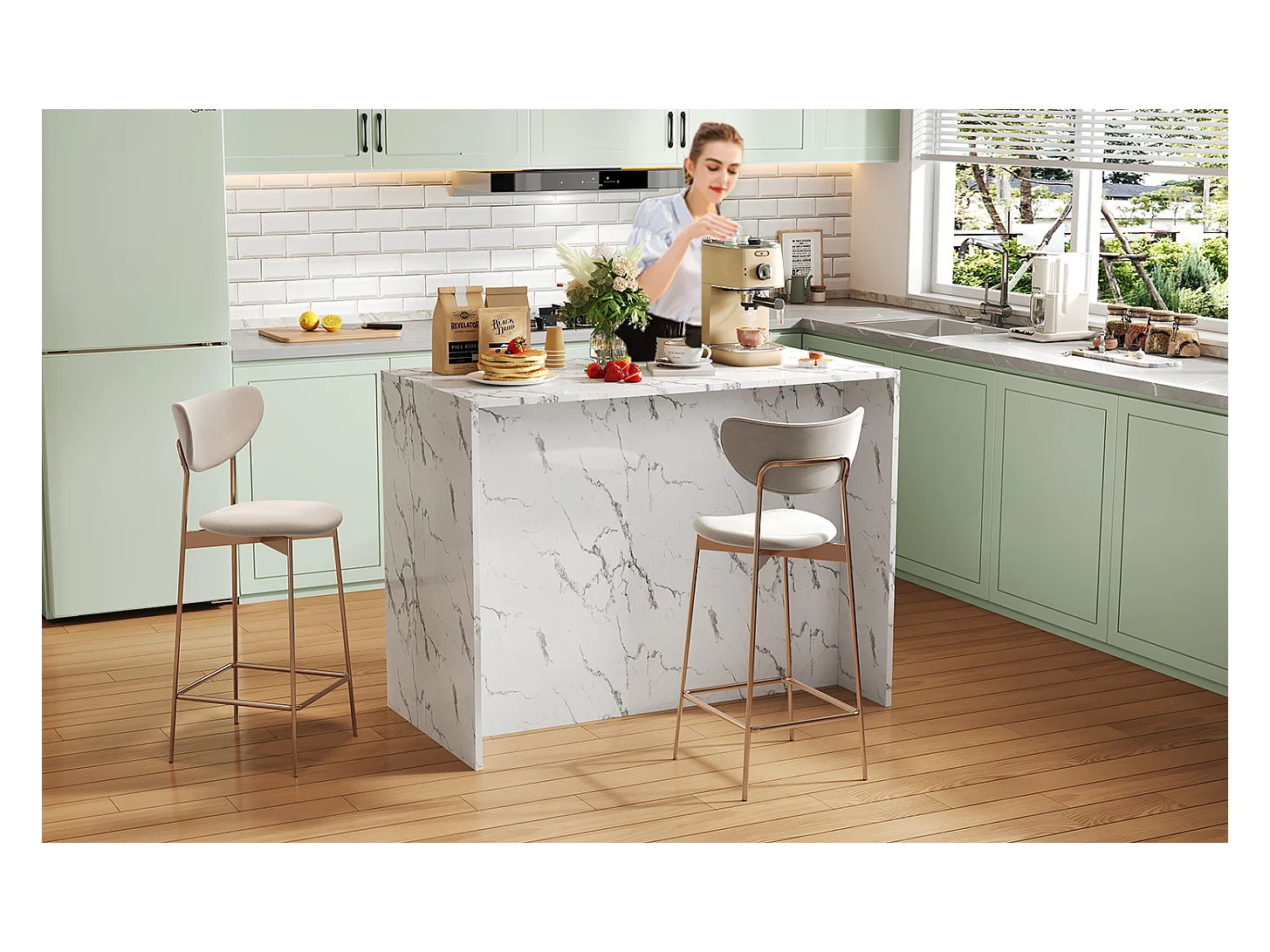 Isla de cocina moderna con encimera de imitación mármol, 3 cajones, almacenamiento multifuncional y cesta de pino, color blanco (120 x 45 x 90 cm)