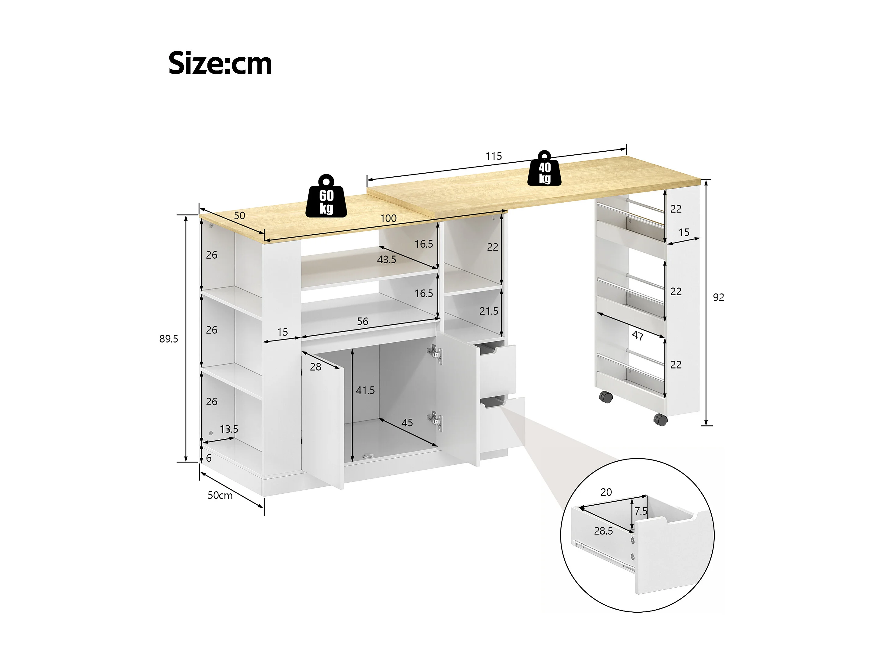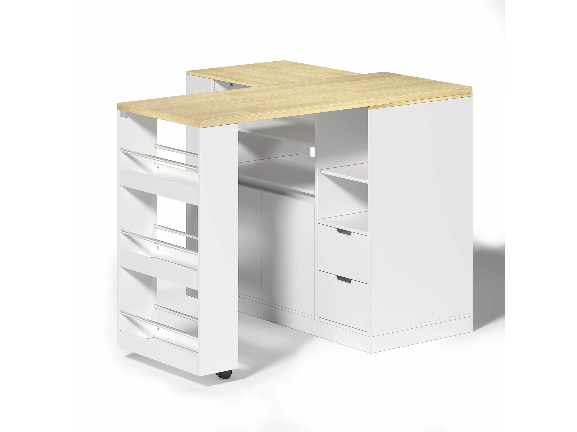 Isla de cocina con encimera extensible, 2 cajones y 2 puertas - Blanco y madera