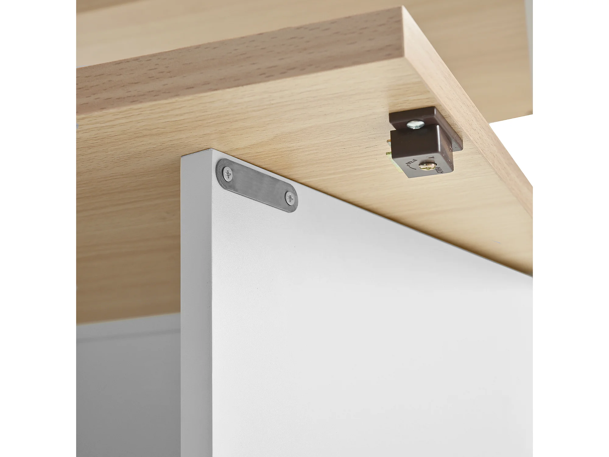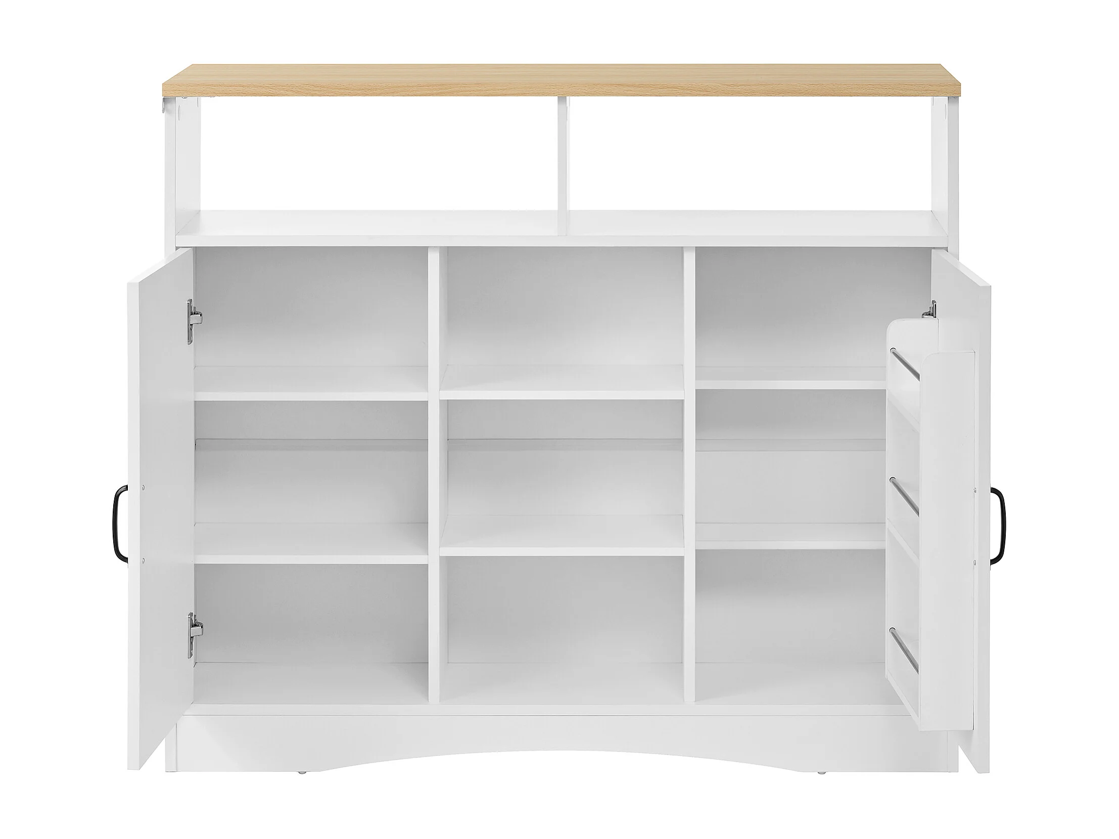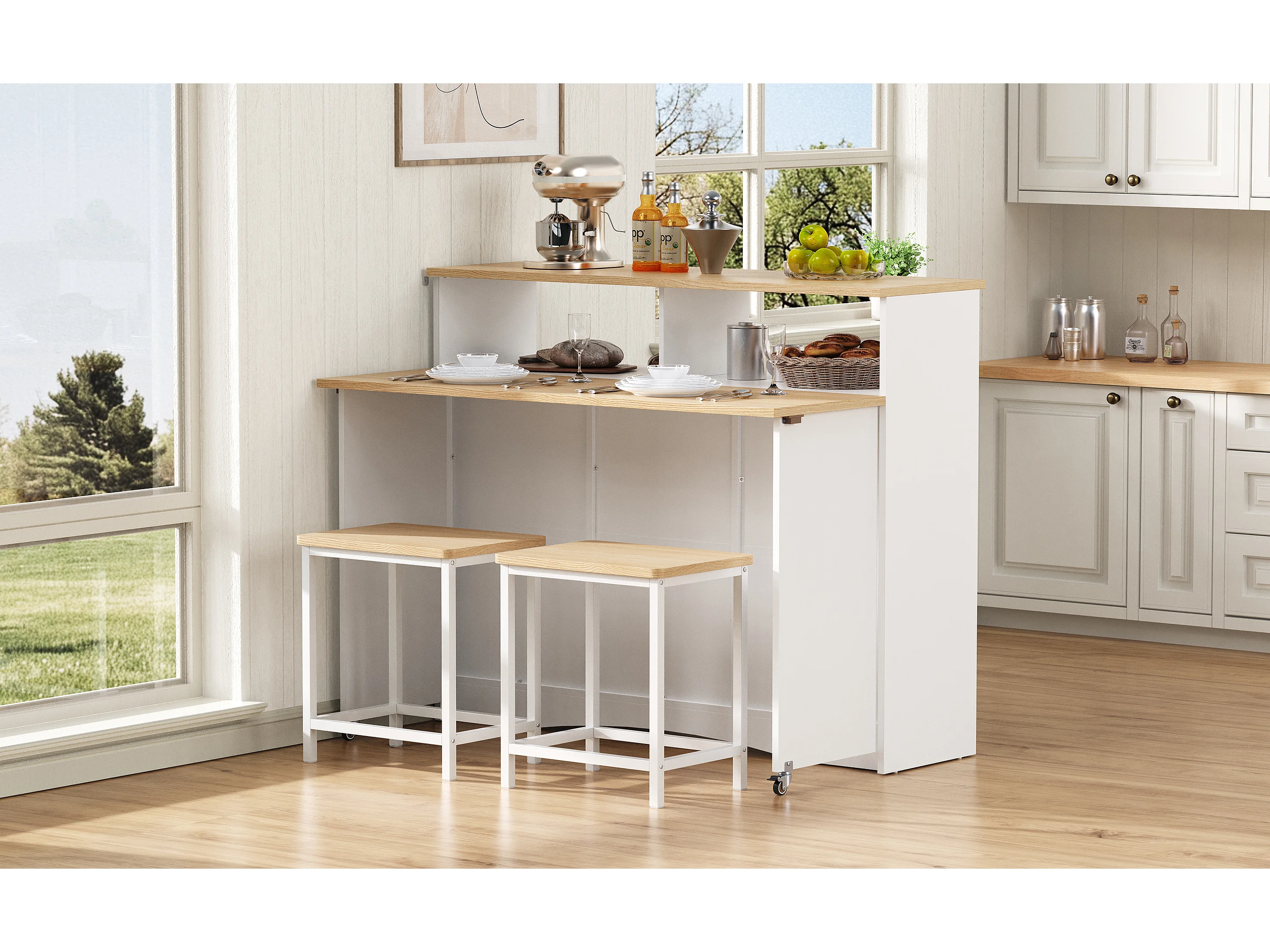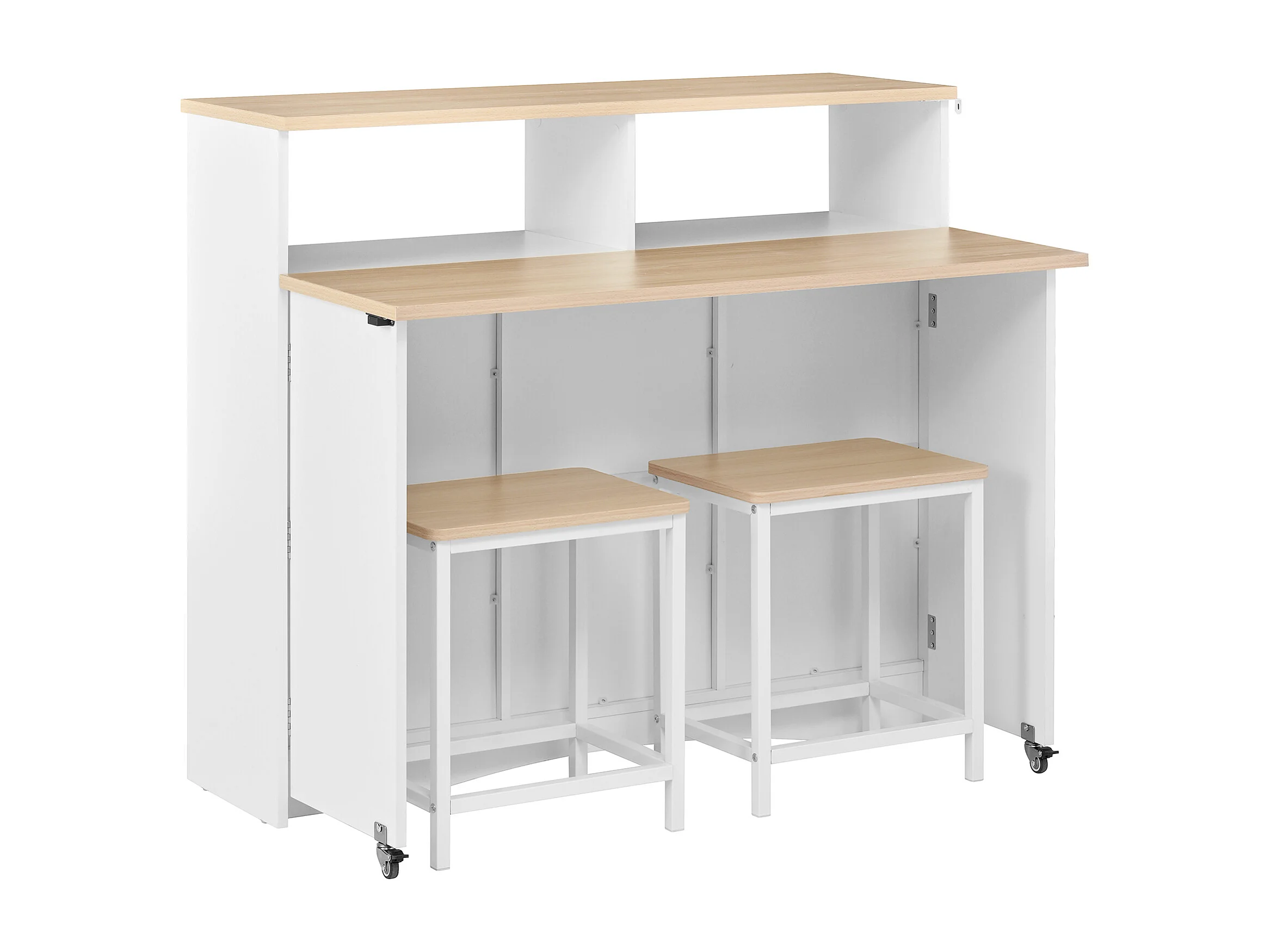 Isla de cocina con ruedas con 2 puertas y 2 sillas - Zona de comedor extensible - Blanco y natural claro