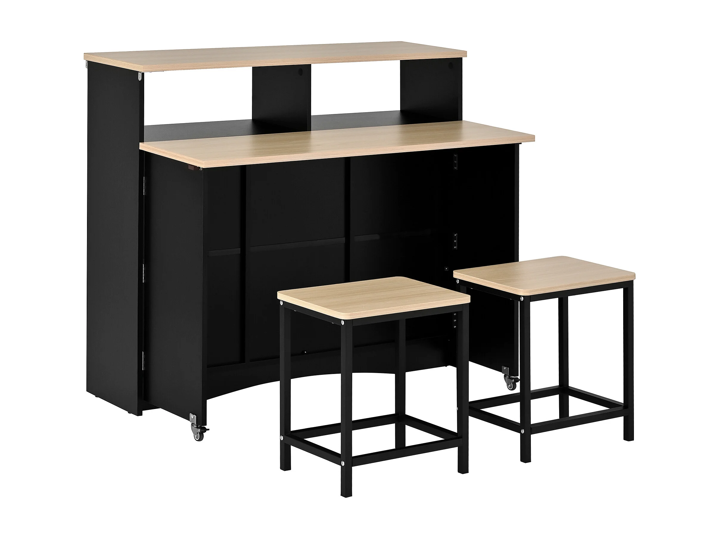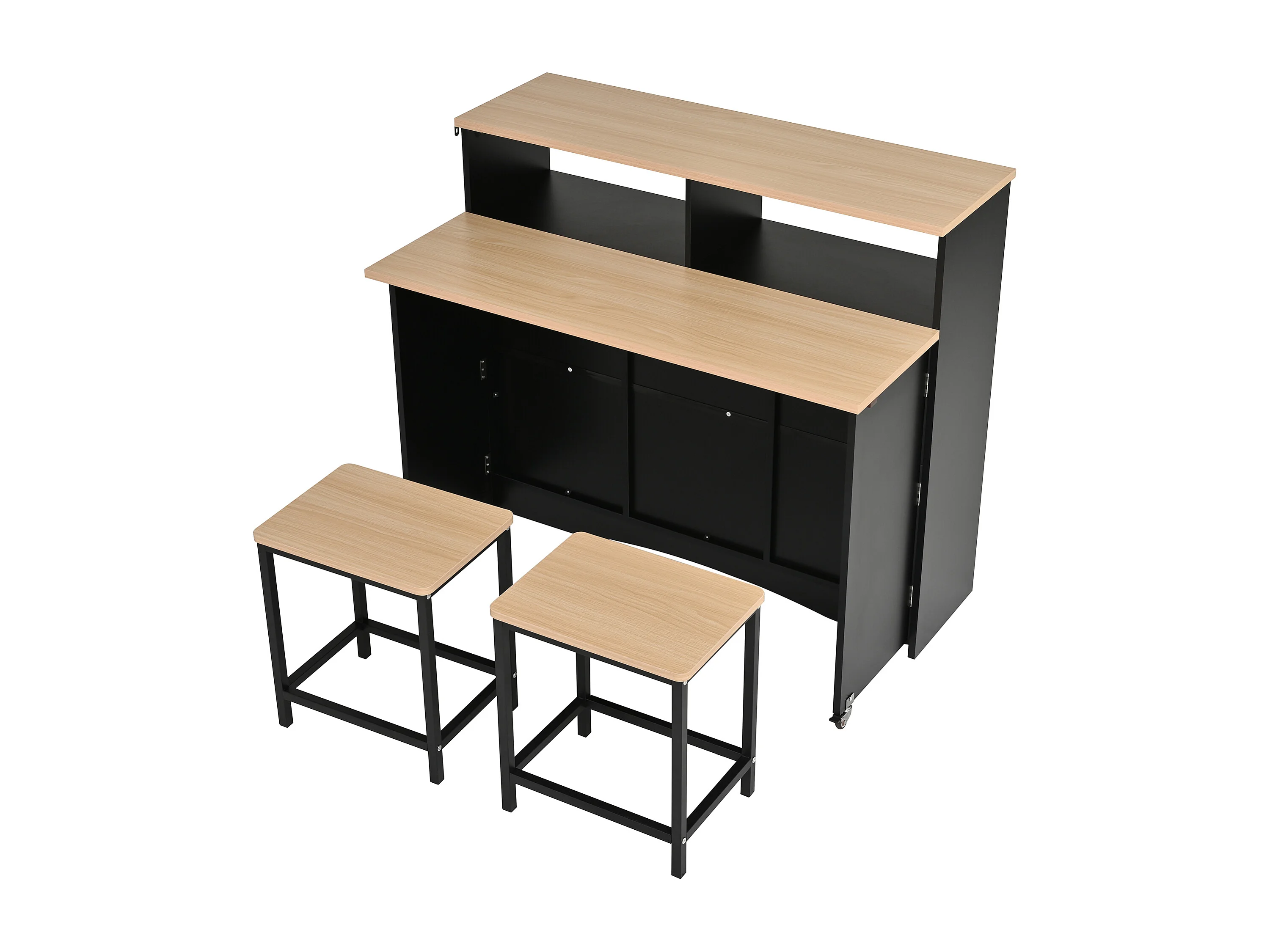 Isla de cocina con ruedas con 2 puertas y 2 sillas - Zona de comedor extensible - Negro y natural claro