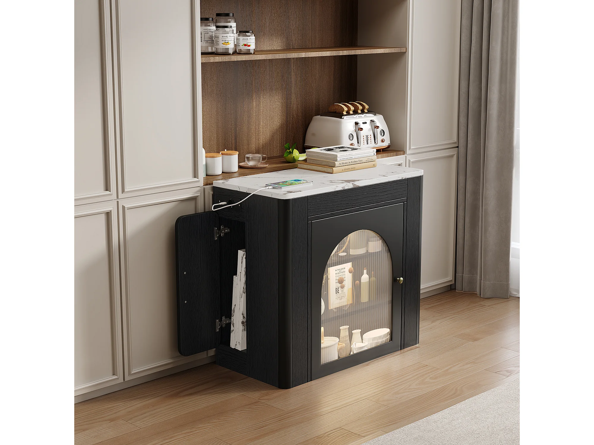 Isla de cocina con 3 puertas, 2 cajones y puerto USB - Efecto mármol blanco - Negro