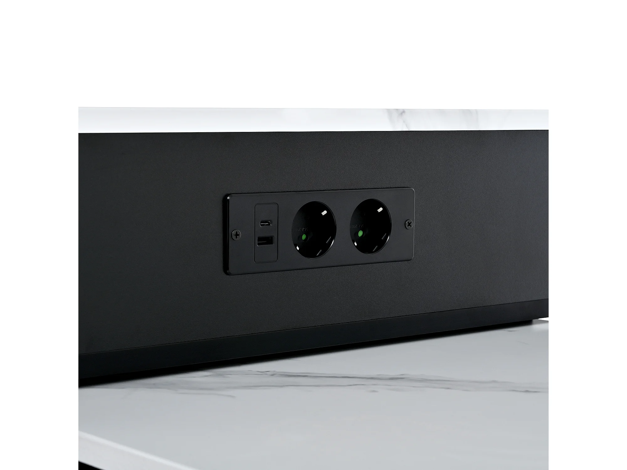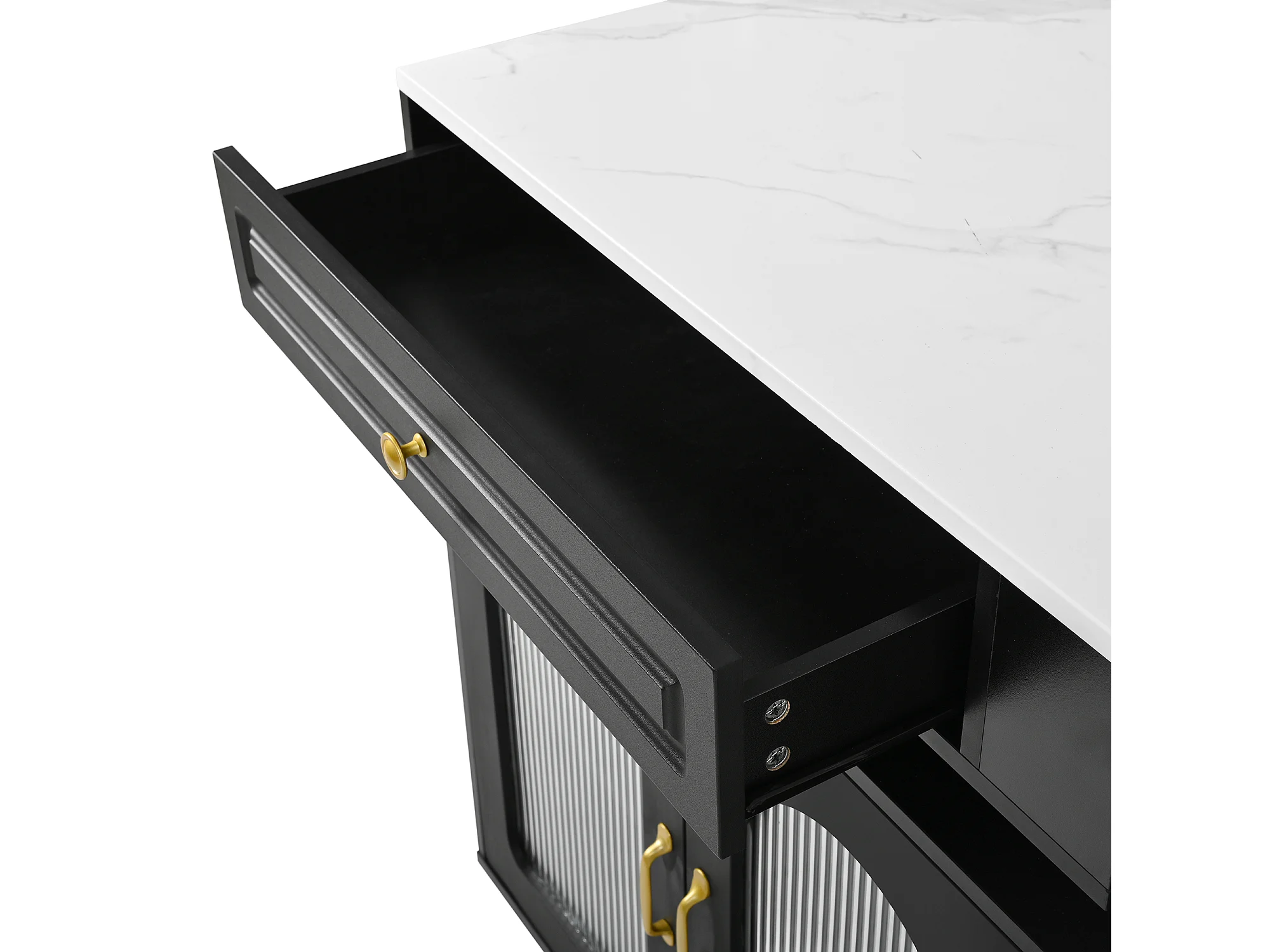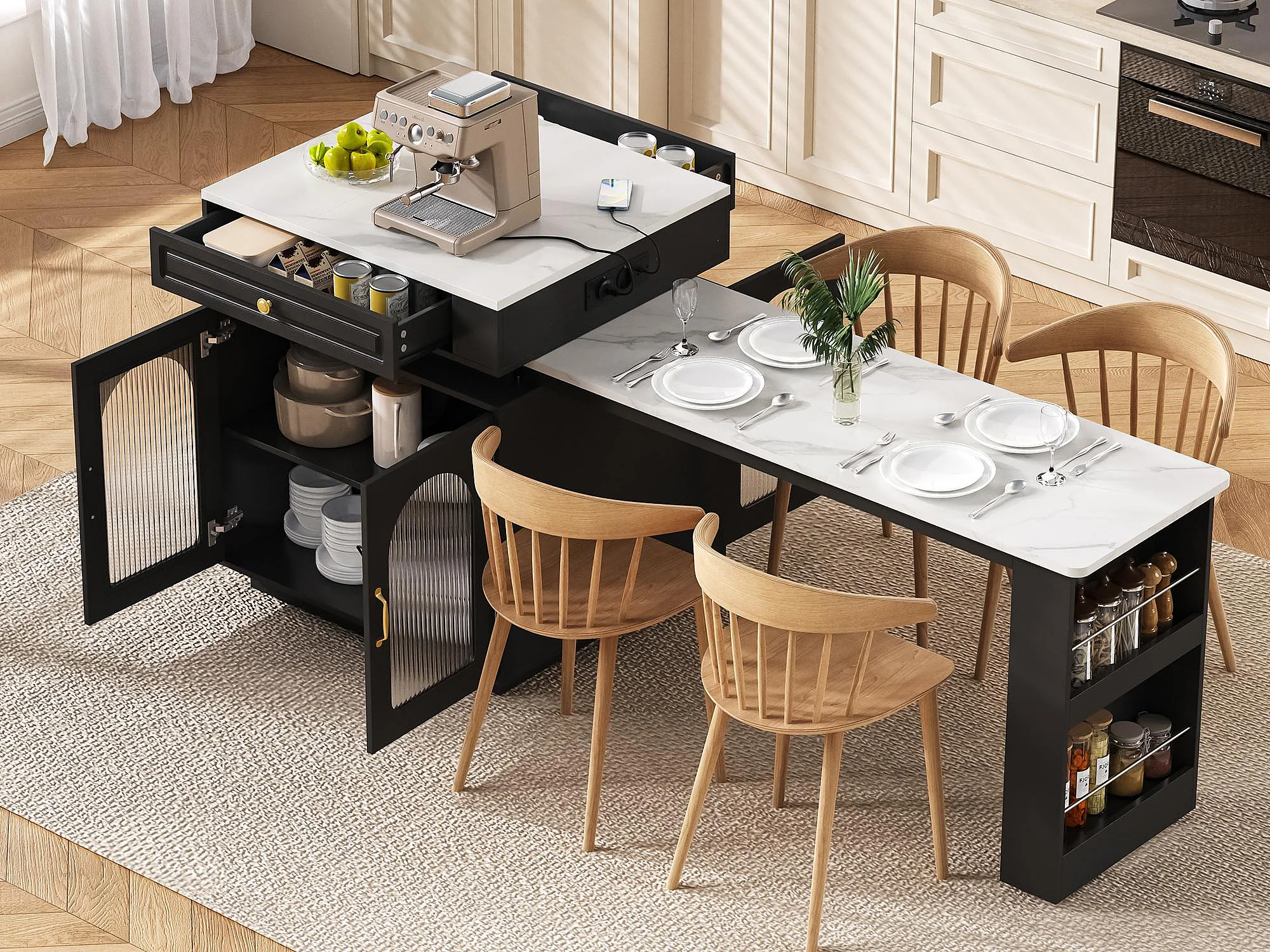 Isla de cocina - mesa de comedor extensible - con iluminación LED - con toma de corriente - con ruedas y espacio de almacenamiento - negro + blanco