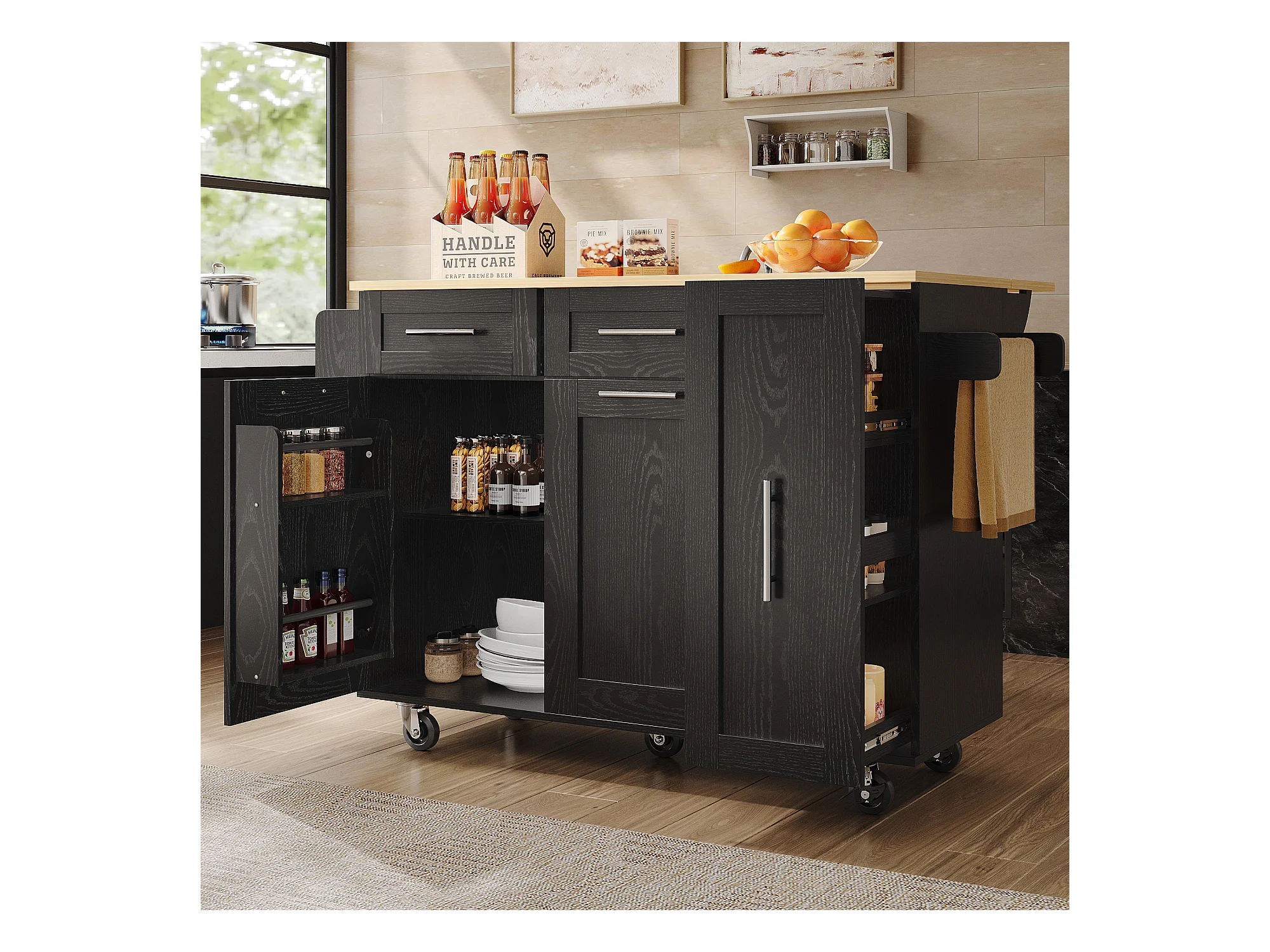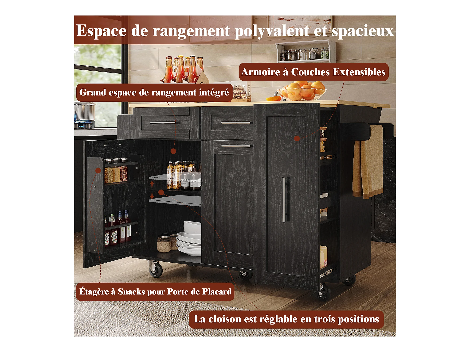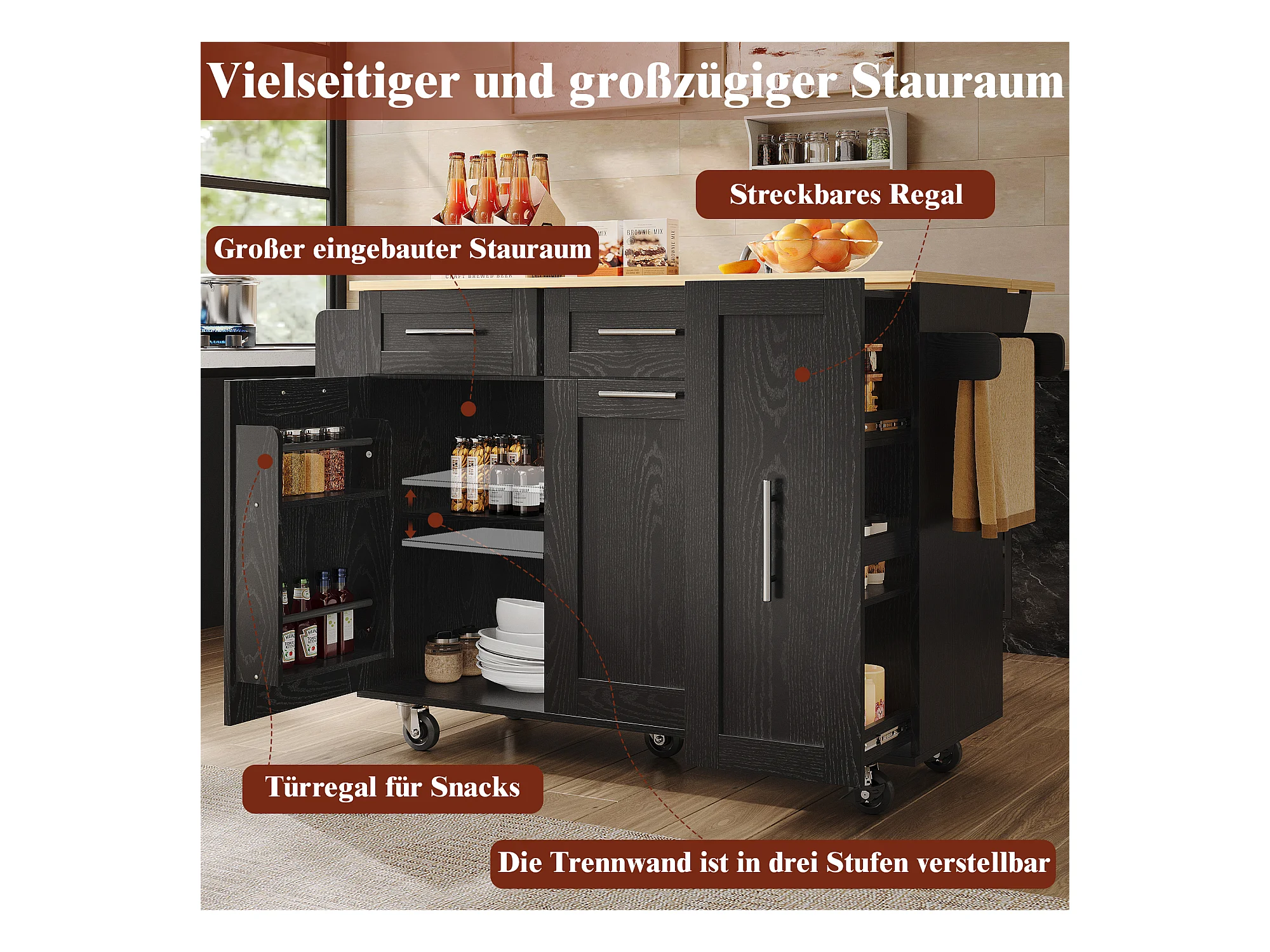Isla de cocina moderna con almacenaje y encimera abatible, mueble de cocina negro con estantes y cajones (140 x 40 x 90 cm)