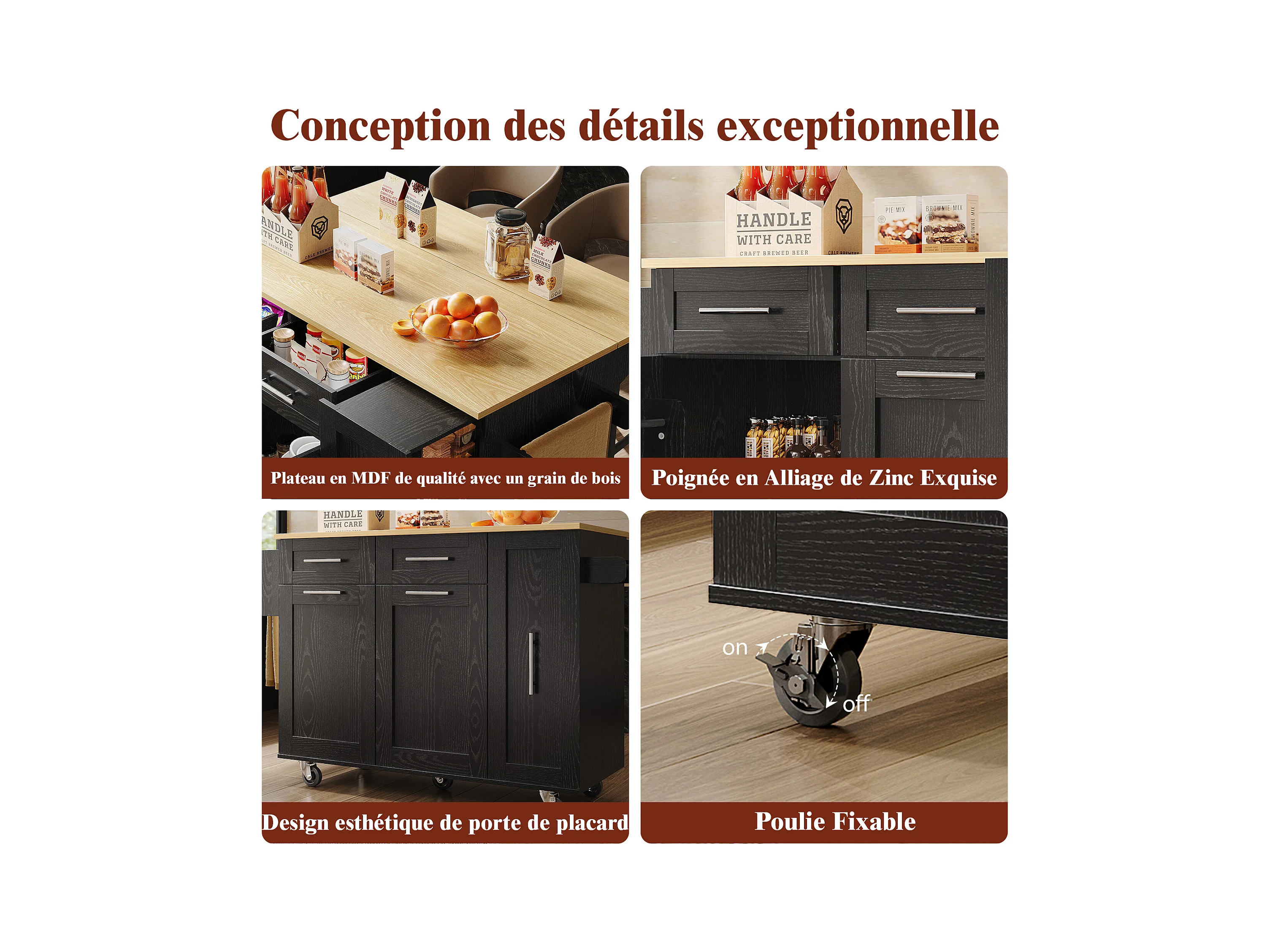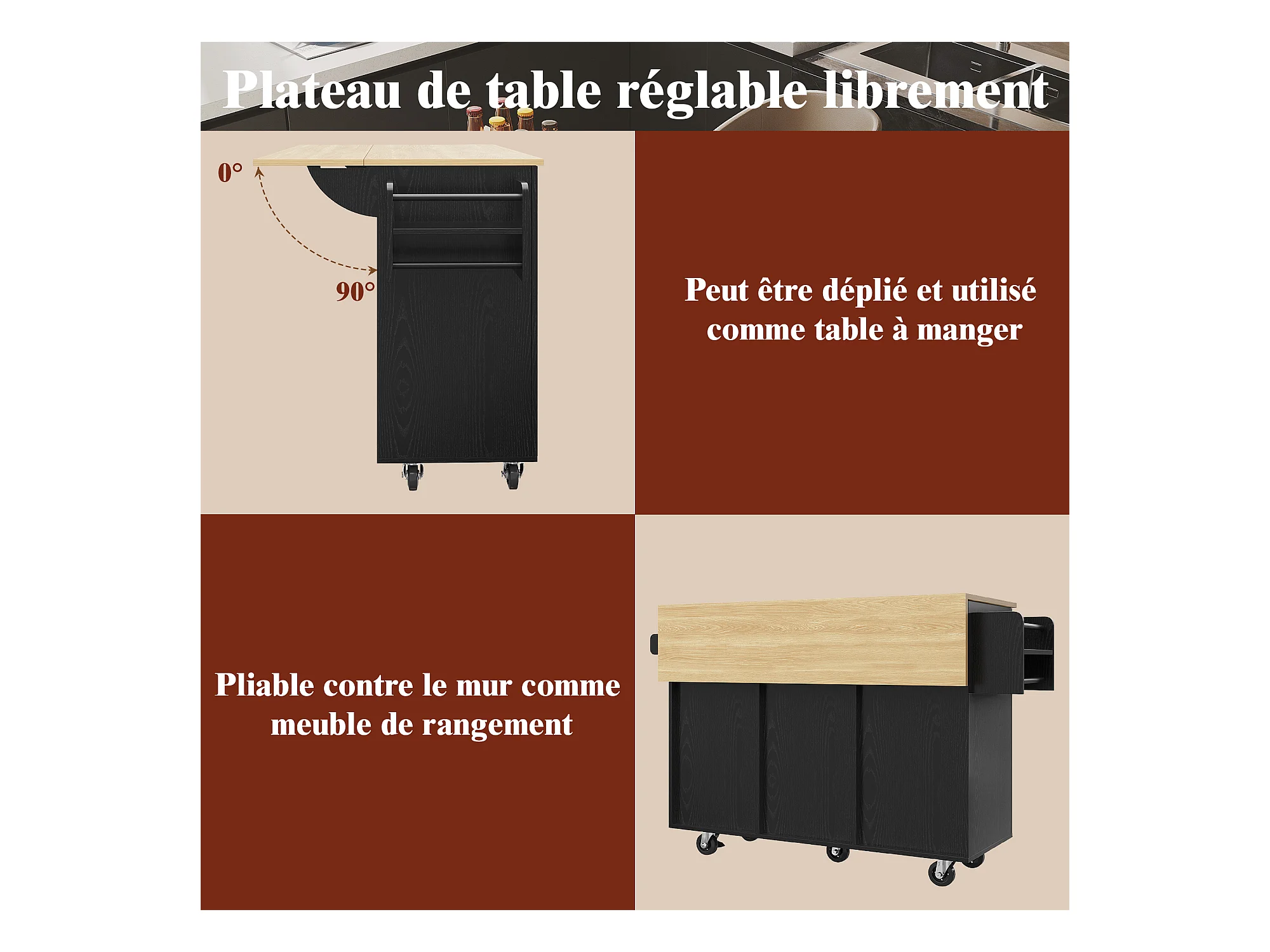 Isla de cocina moderna con estantes plegables, almacenamiento multifuncional, MDF, madera negra y natural (120x30x90 cm)