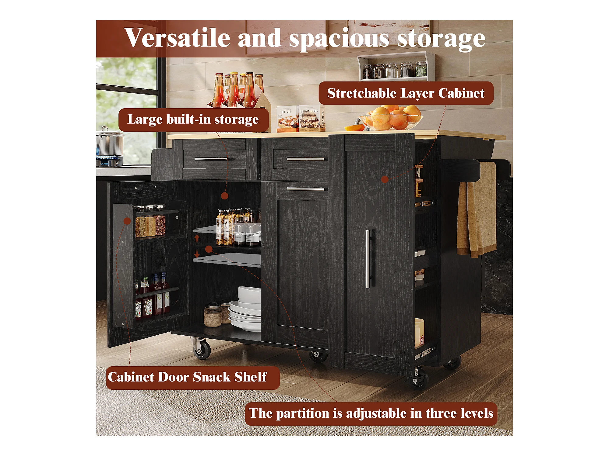 Isla de cocina con encimera, tabiques extraíbles, ruedas y toallero lateral, madera natural, negro (135x46x86,6 cm)