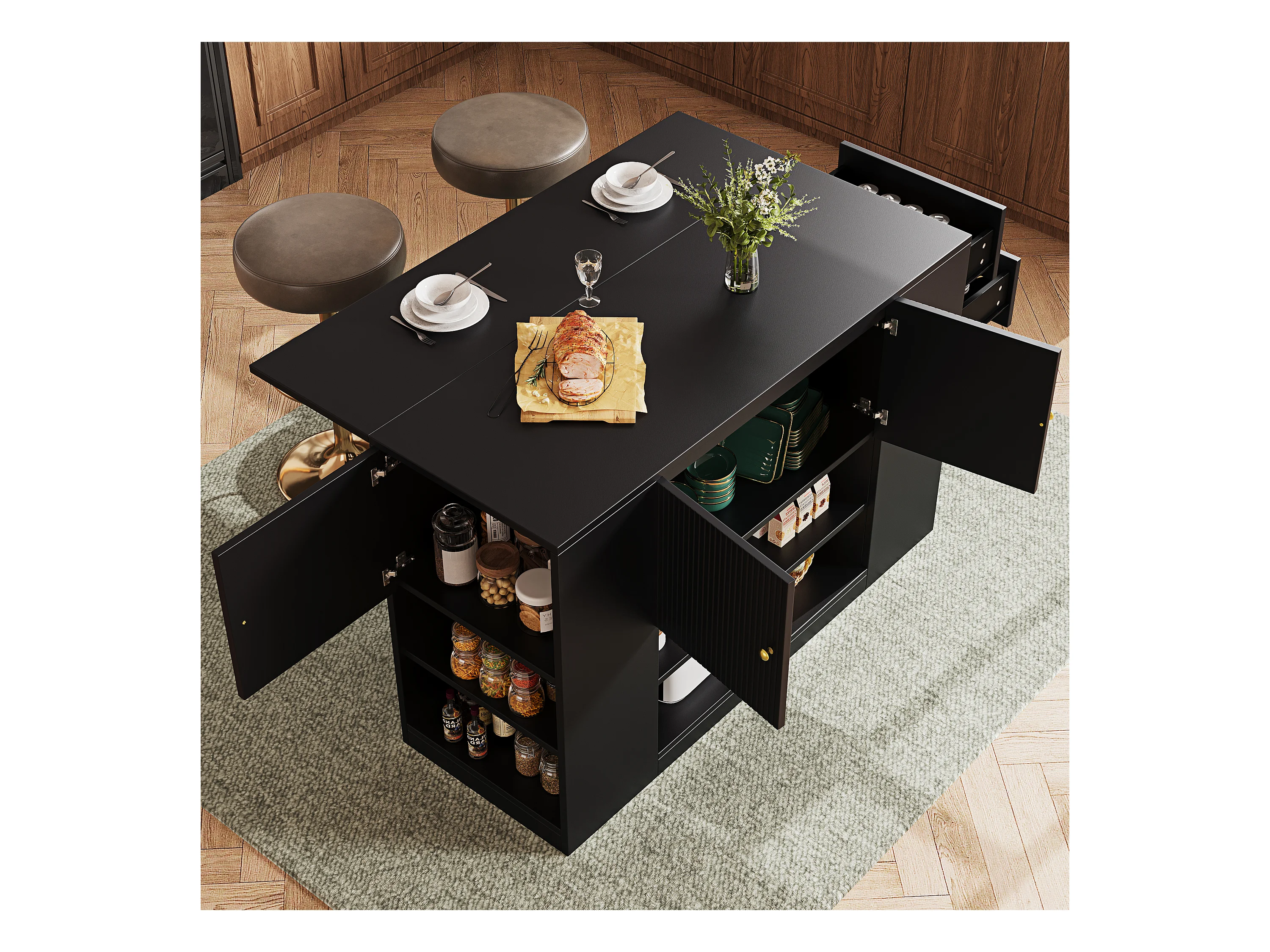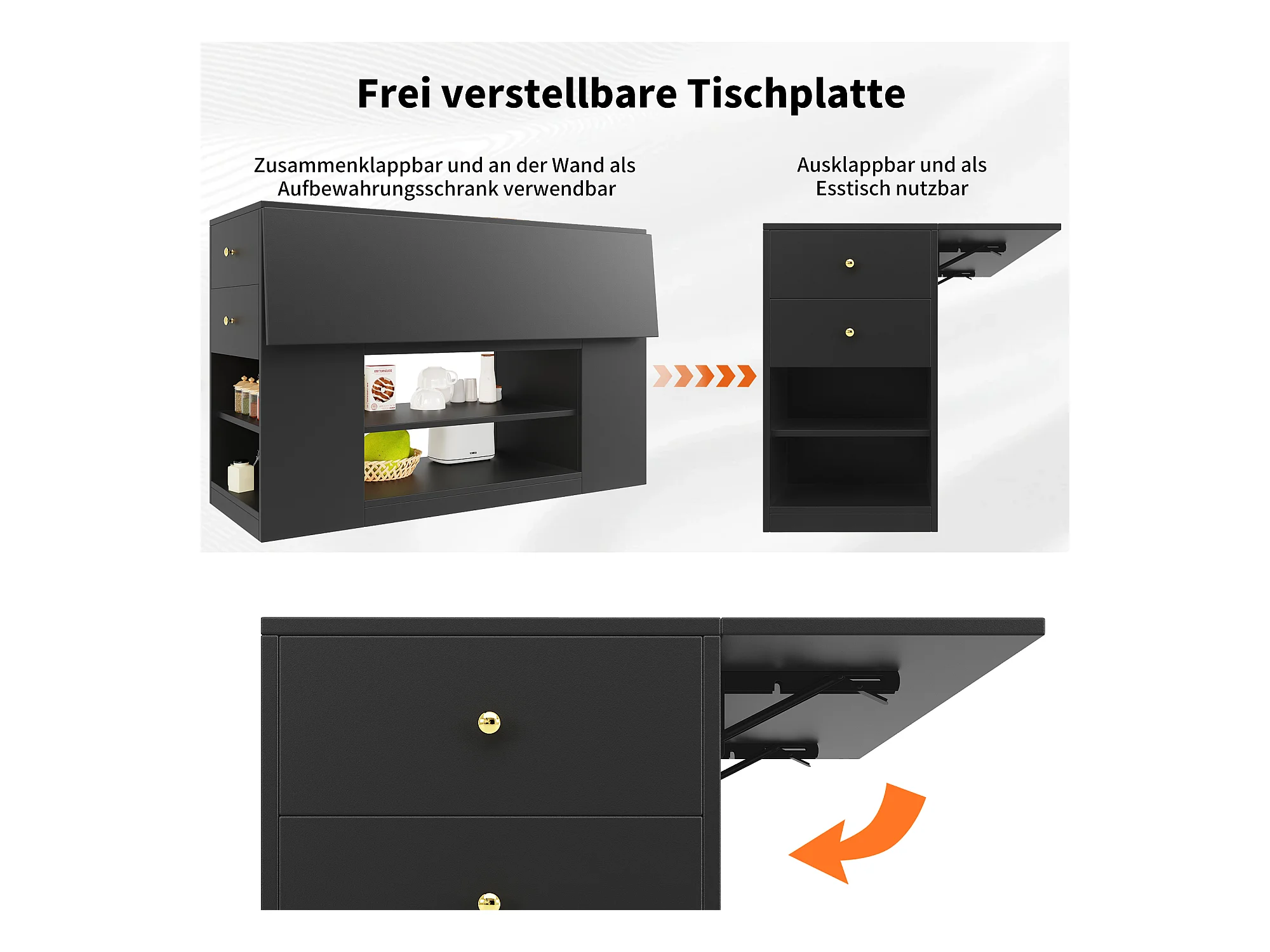 Isla de cocina moderna con almacenaje y encimera abatible, mueble de cocina negro con estantes y cajones (140 x 40 x 90 cm)