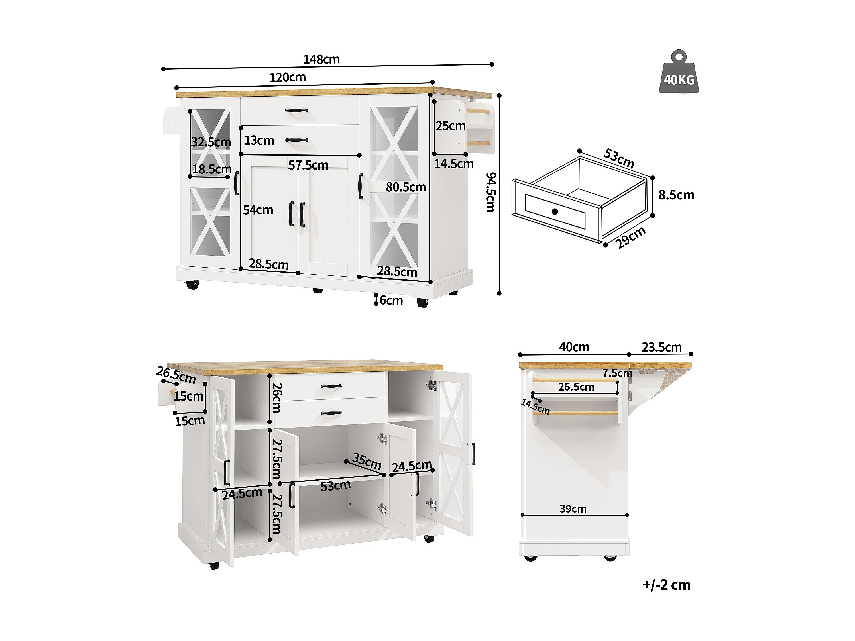 Isla de cocina móvil - 148 x 40 (63,5) x 94,5 cm - con estantes ajustables + 4 puertas + 2 cajones - MDF + metal - blanca