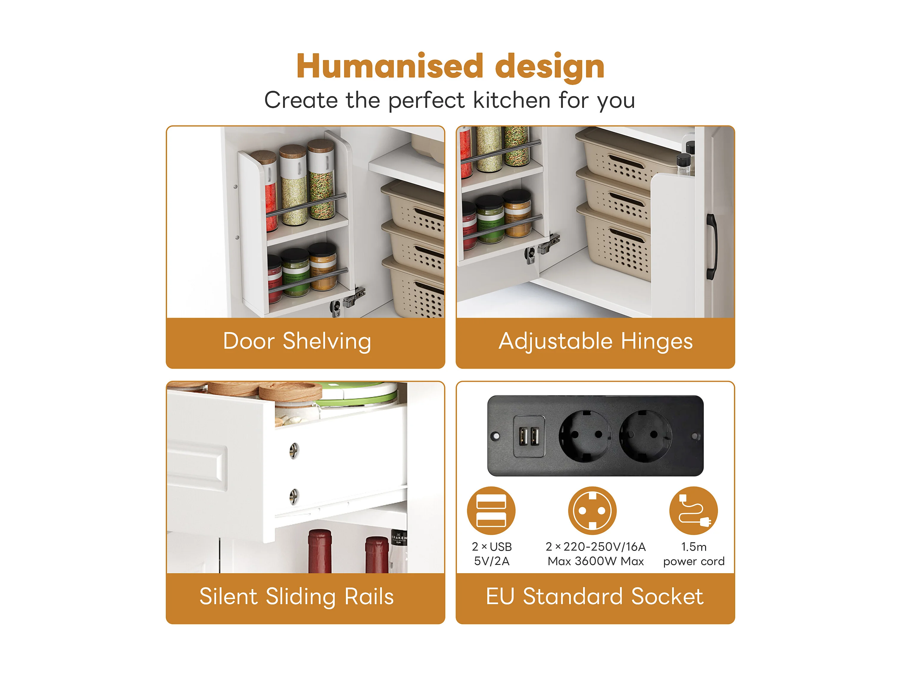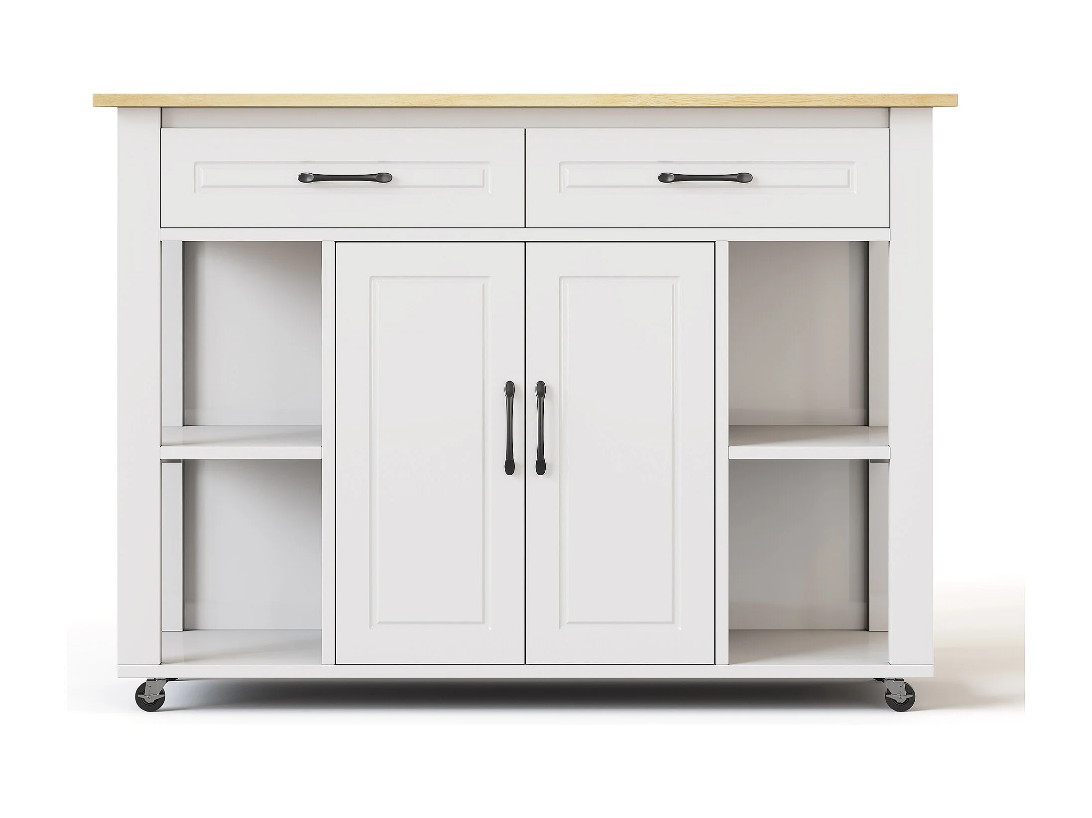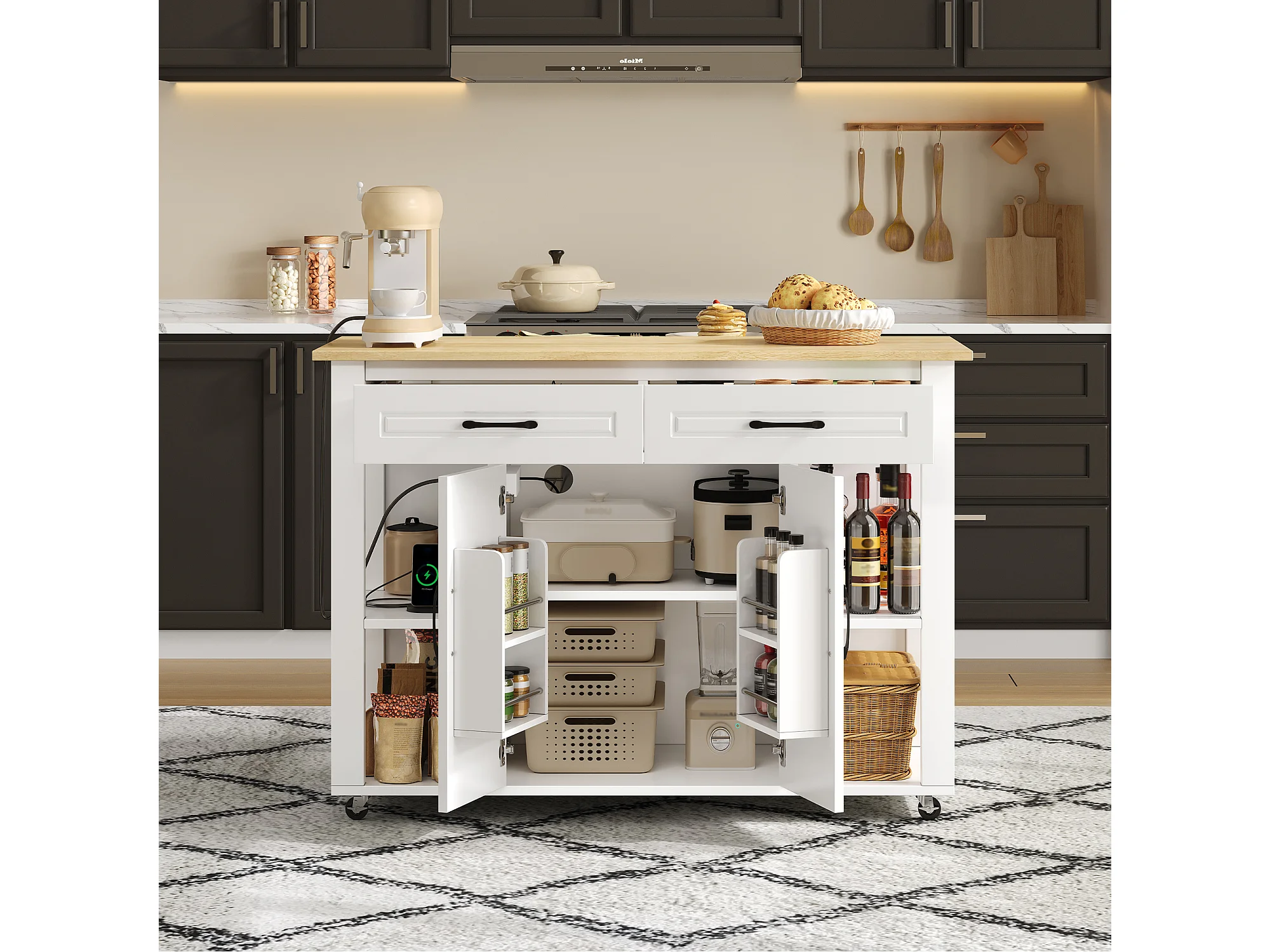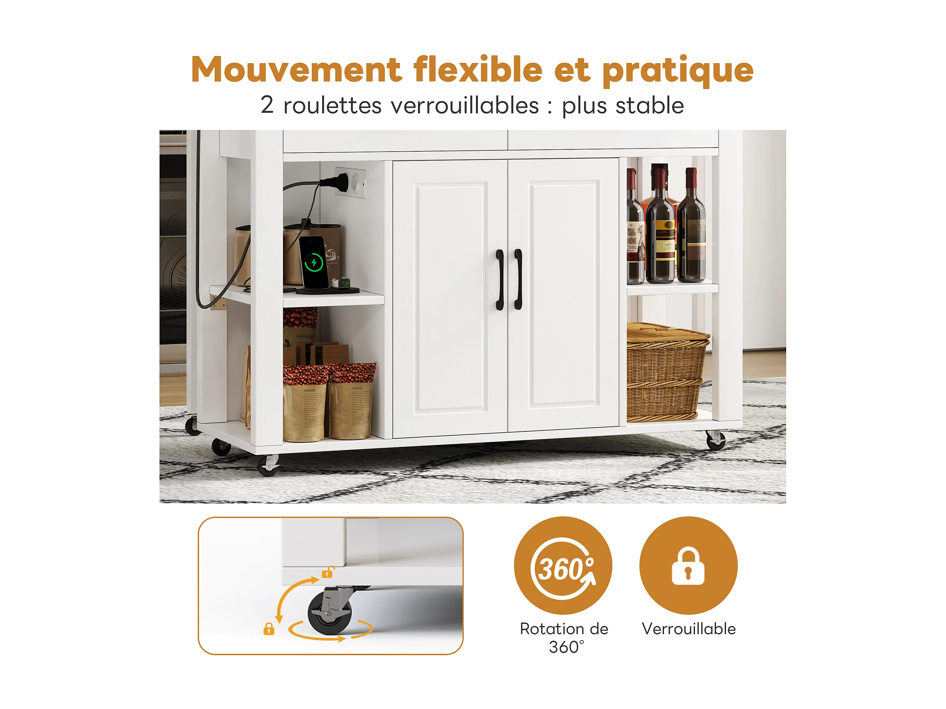 Isla de cocina móvil con 2 cajones y 2 puertas, tomas de corriente - Blanco