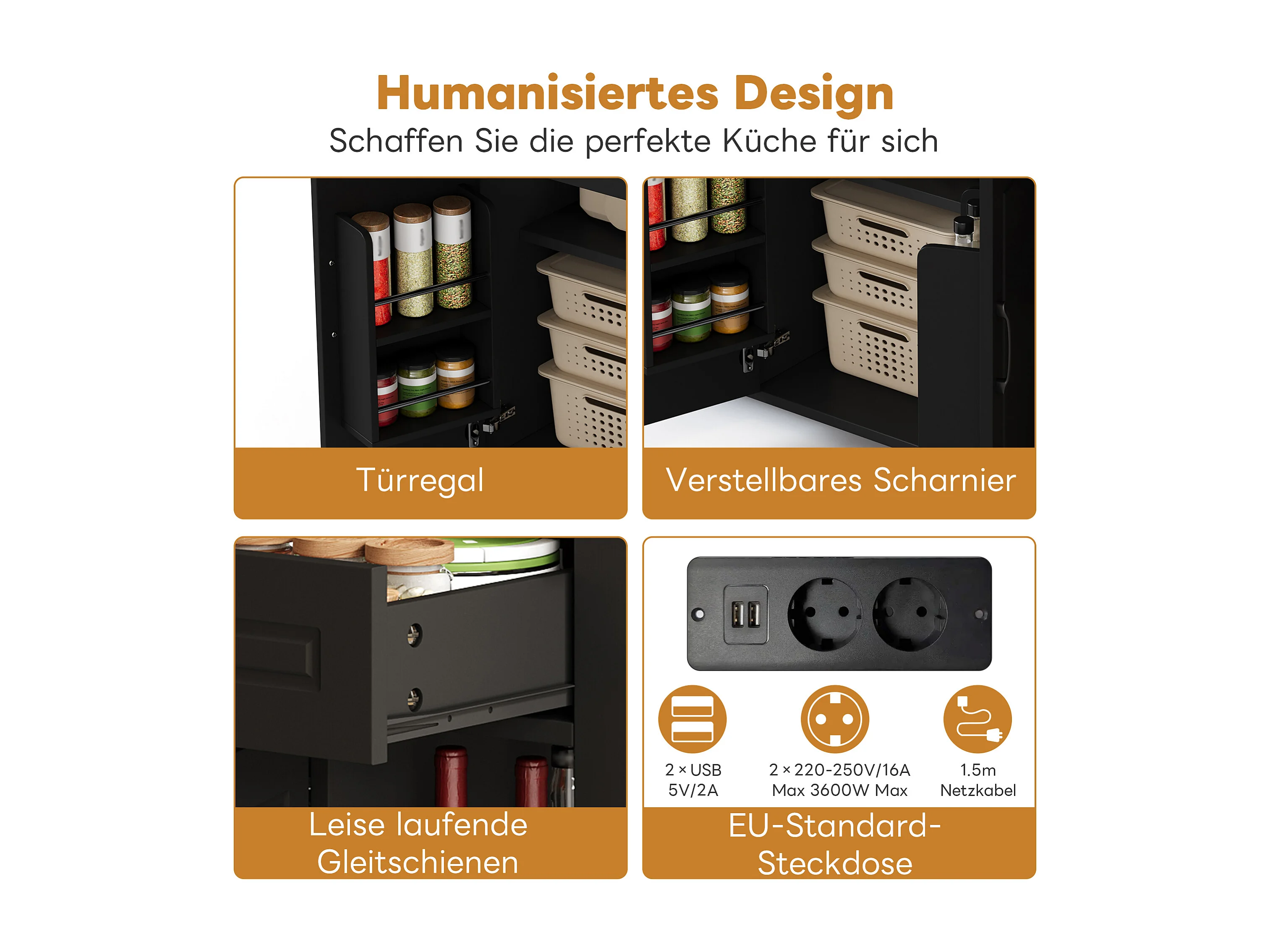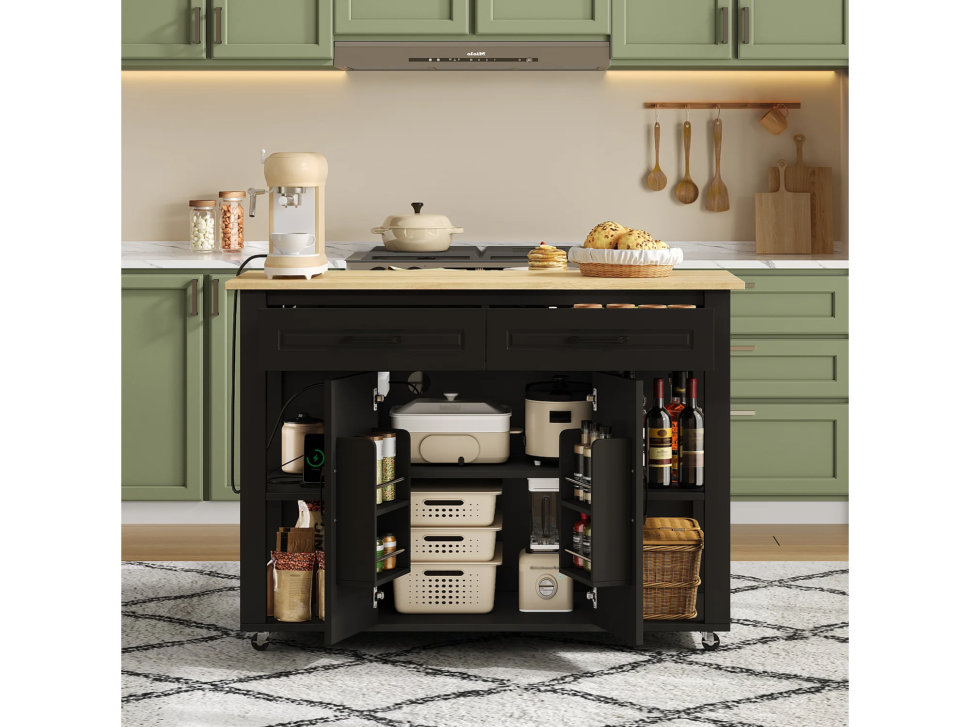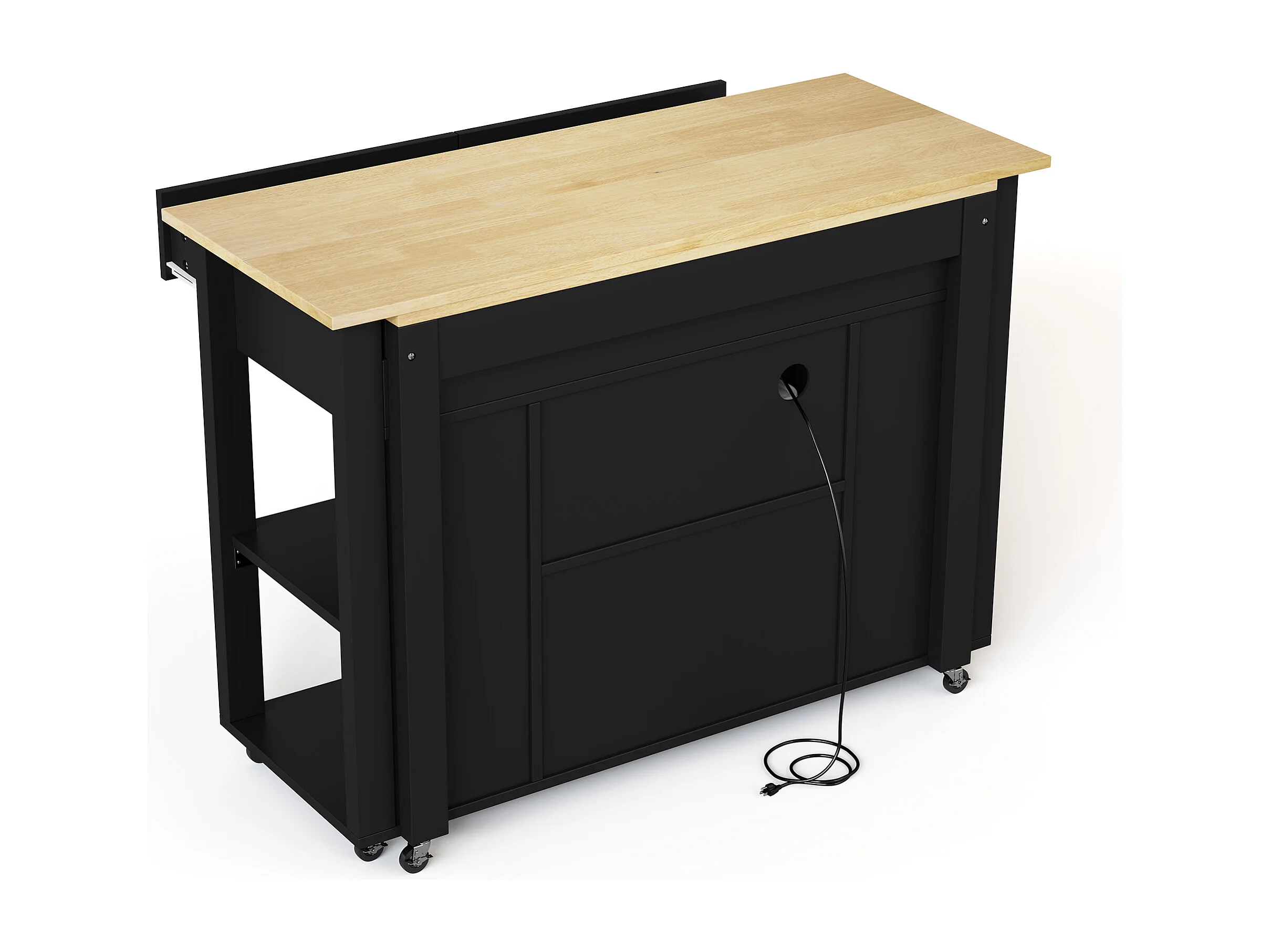 Isla de cocina móvil con 2 cajones y 2 puertas, tomas de corriente - Negro
