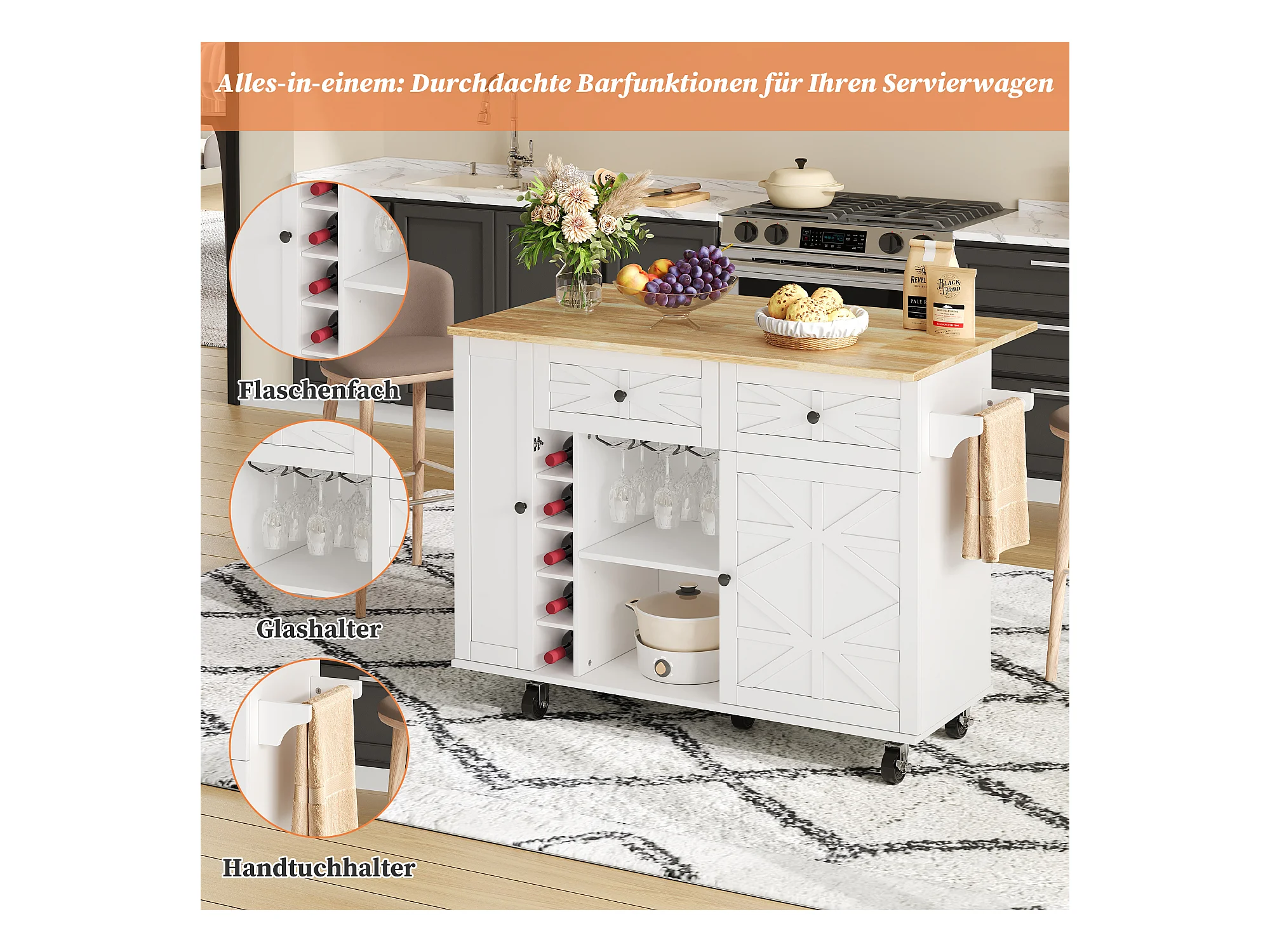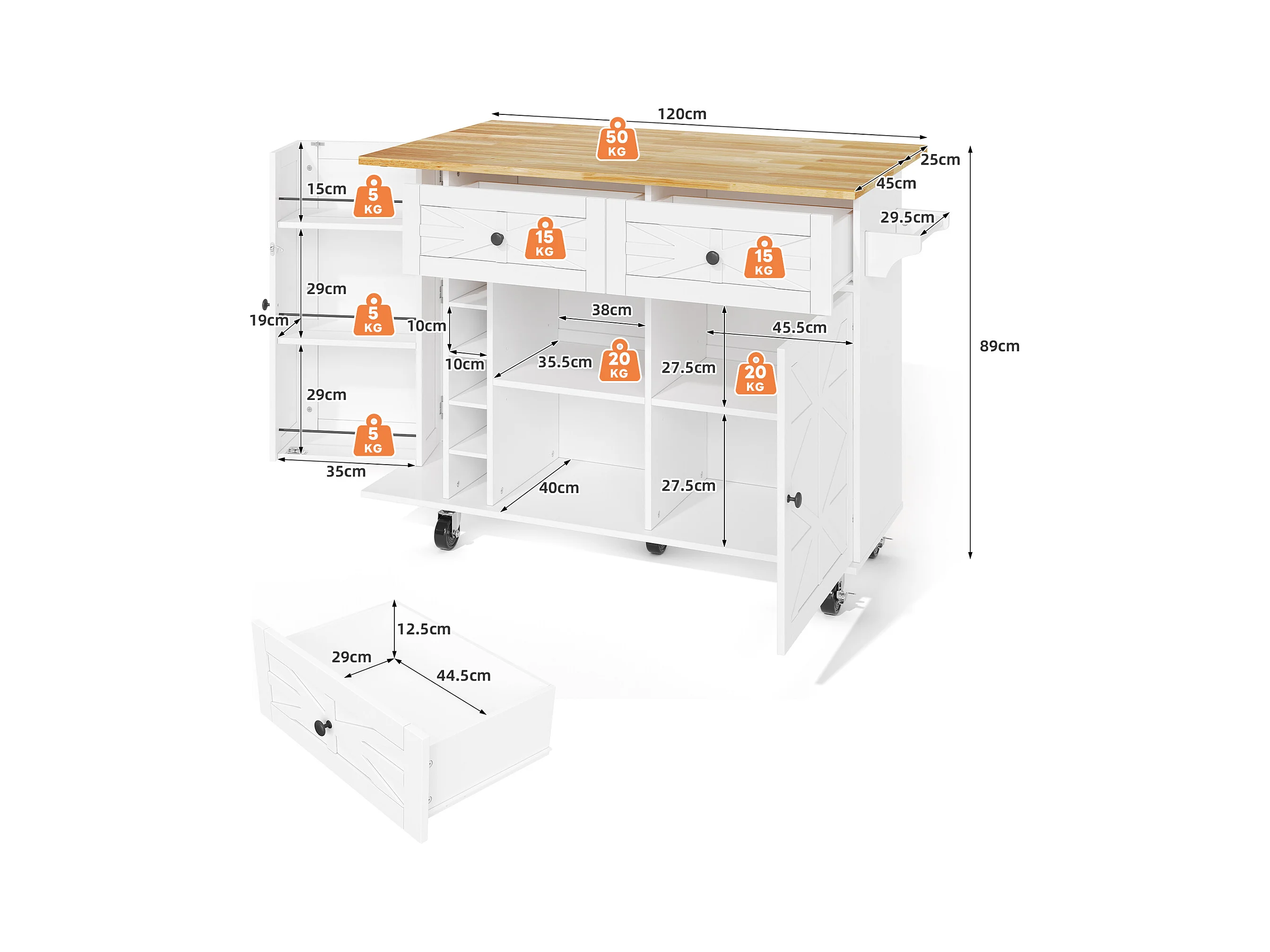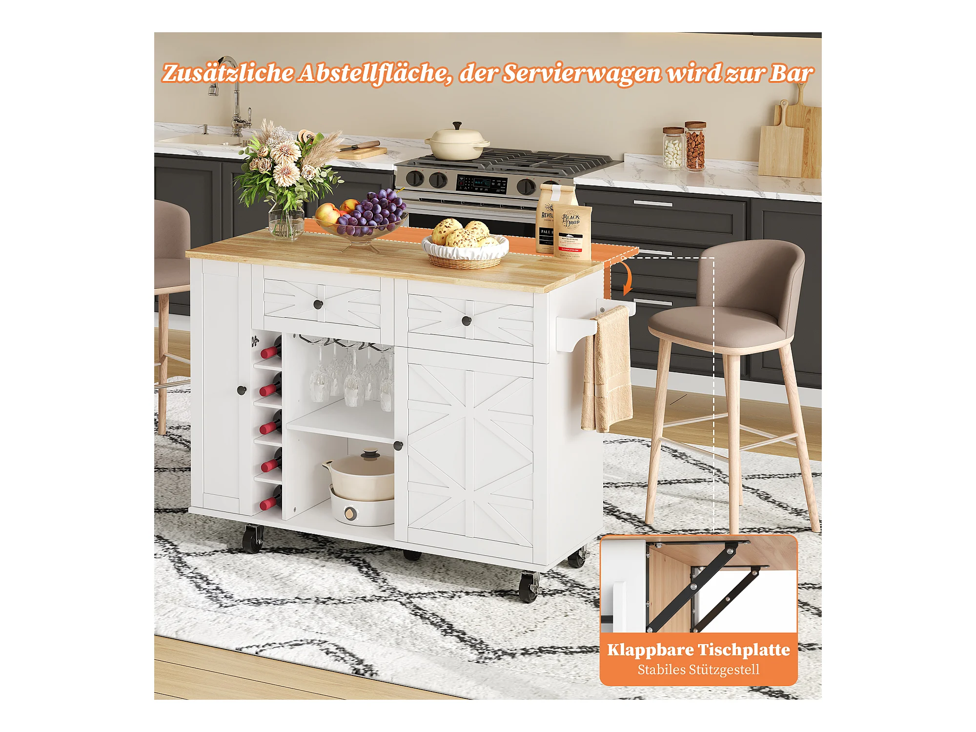 Isla de cocina móvil con encimera abatible - 120 x 45/70 x 89 cm - con 2 puertas + 2 cajones - MDF - blanco