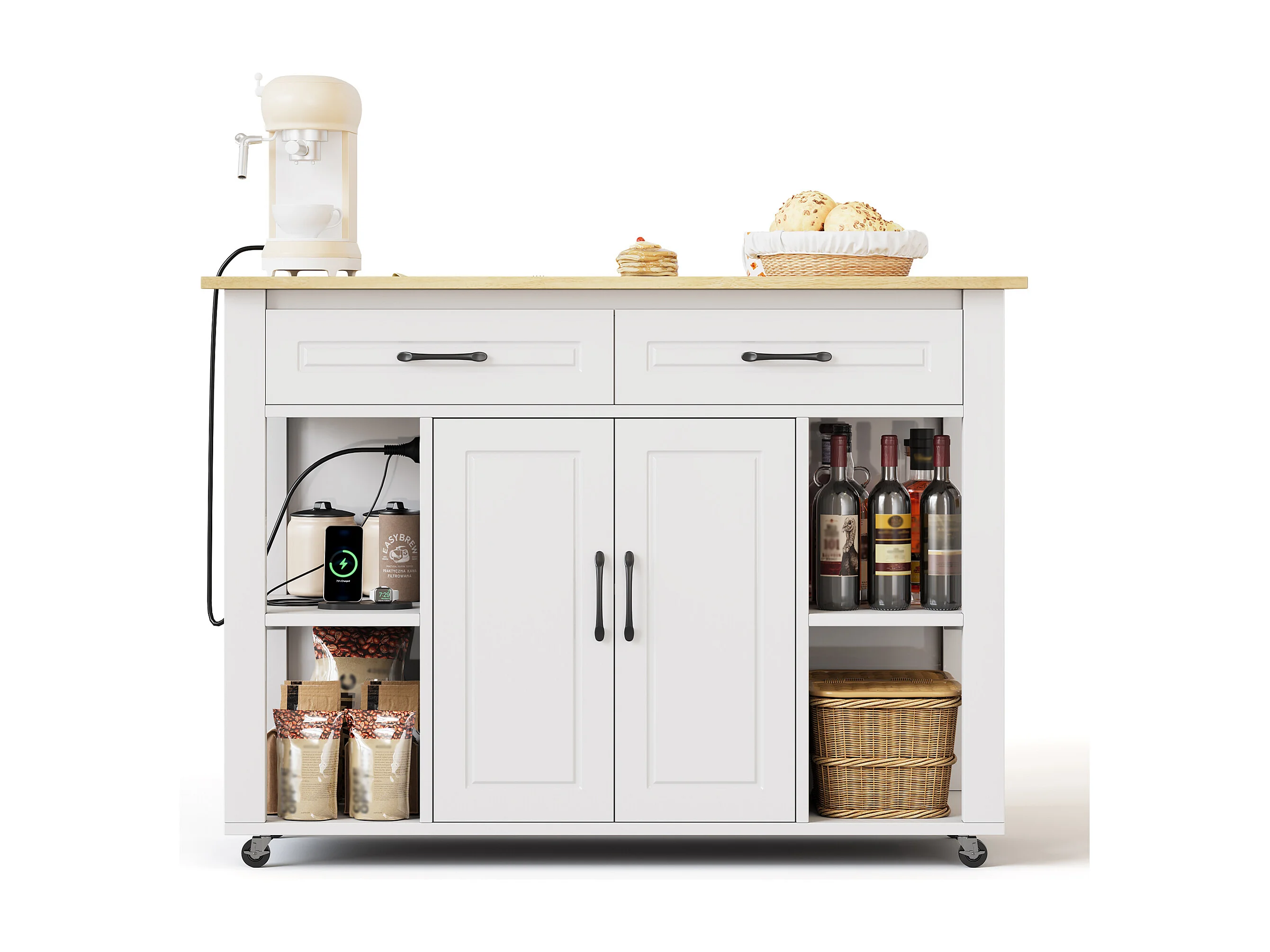 Isla de cocina móvil - encimera extensible - con USB y toallero - con 2 cajones y 2 puertas - MDF - Blanco