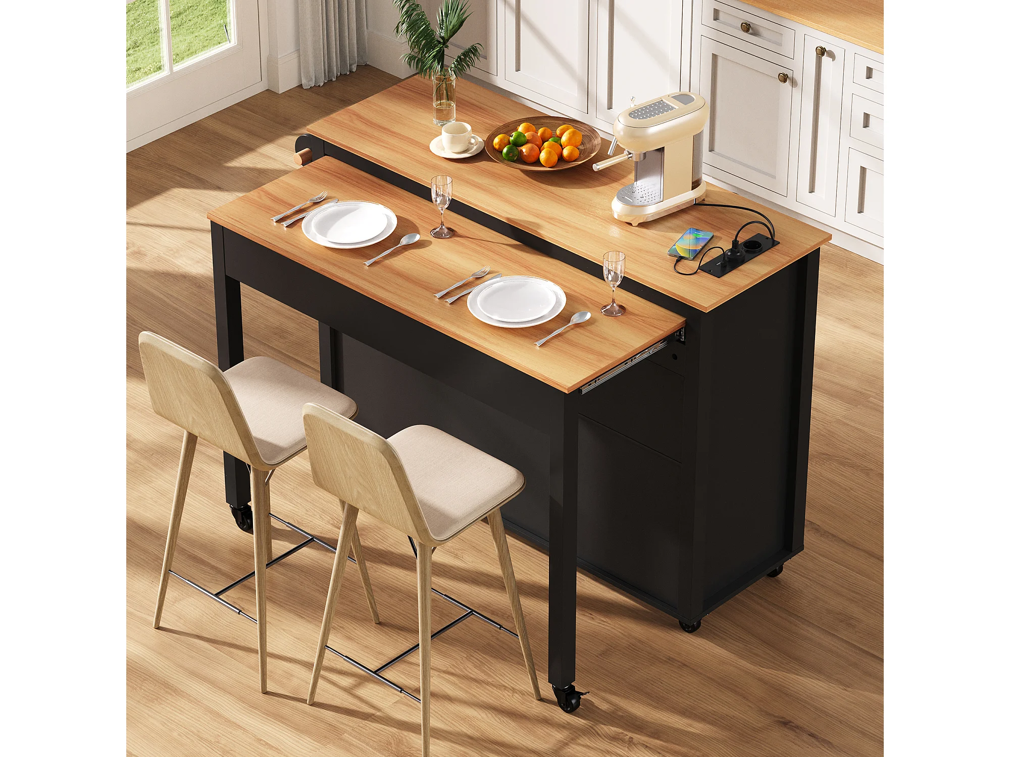 Isla de cocina móvil con mesa de comedor extensible - 100 x 42/70 x 91,5 cm - con puertas + 3 cajones - MDF - negro + natural