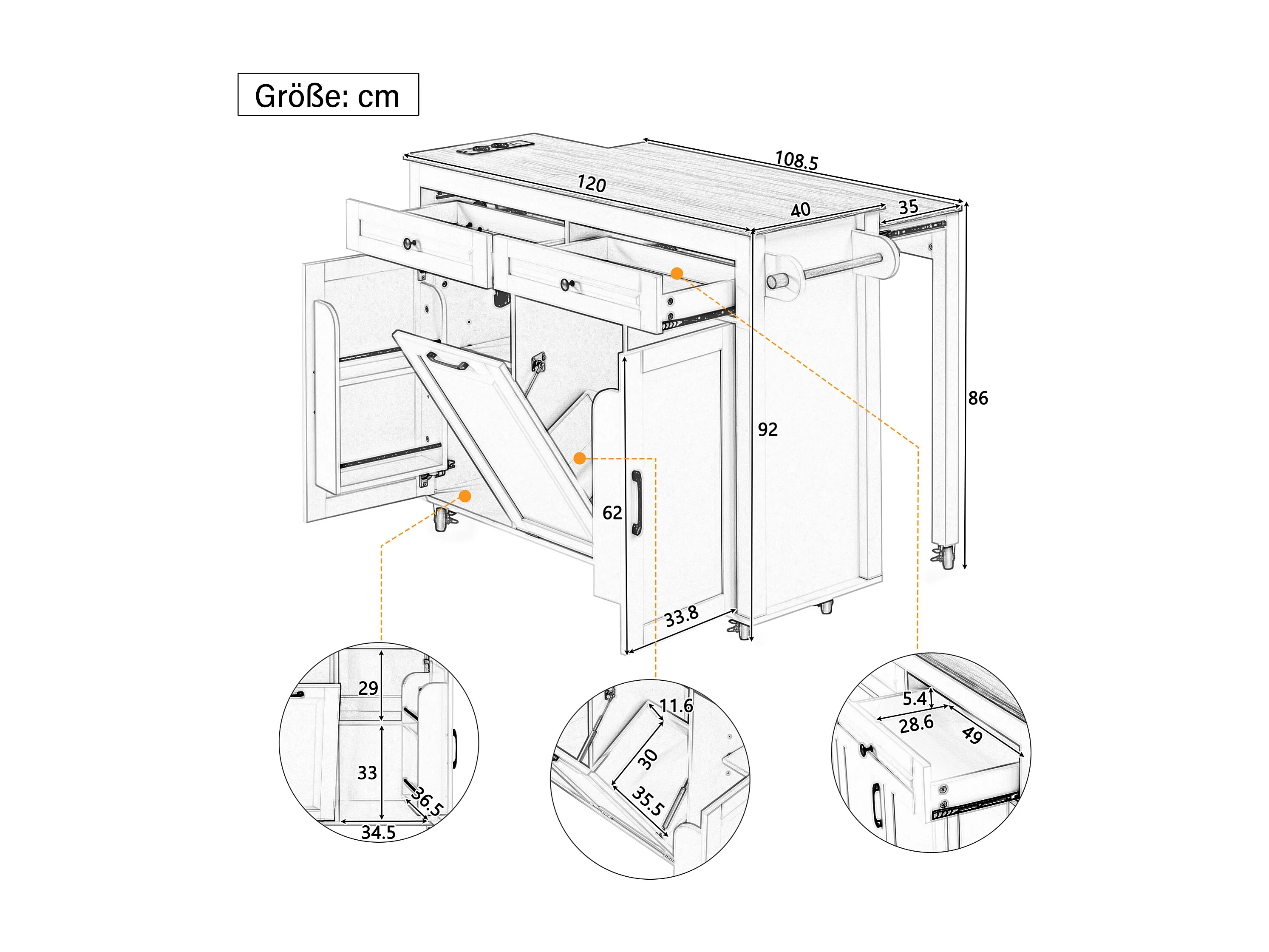 Isla de cocina móvil con ruedas, encimera extensible, almacenaje con toallero y estantes regulables (130x45(75)x92 cm)