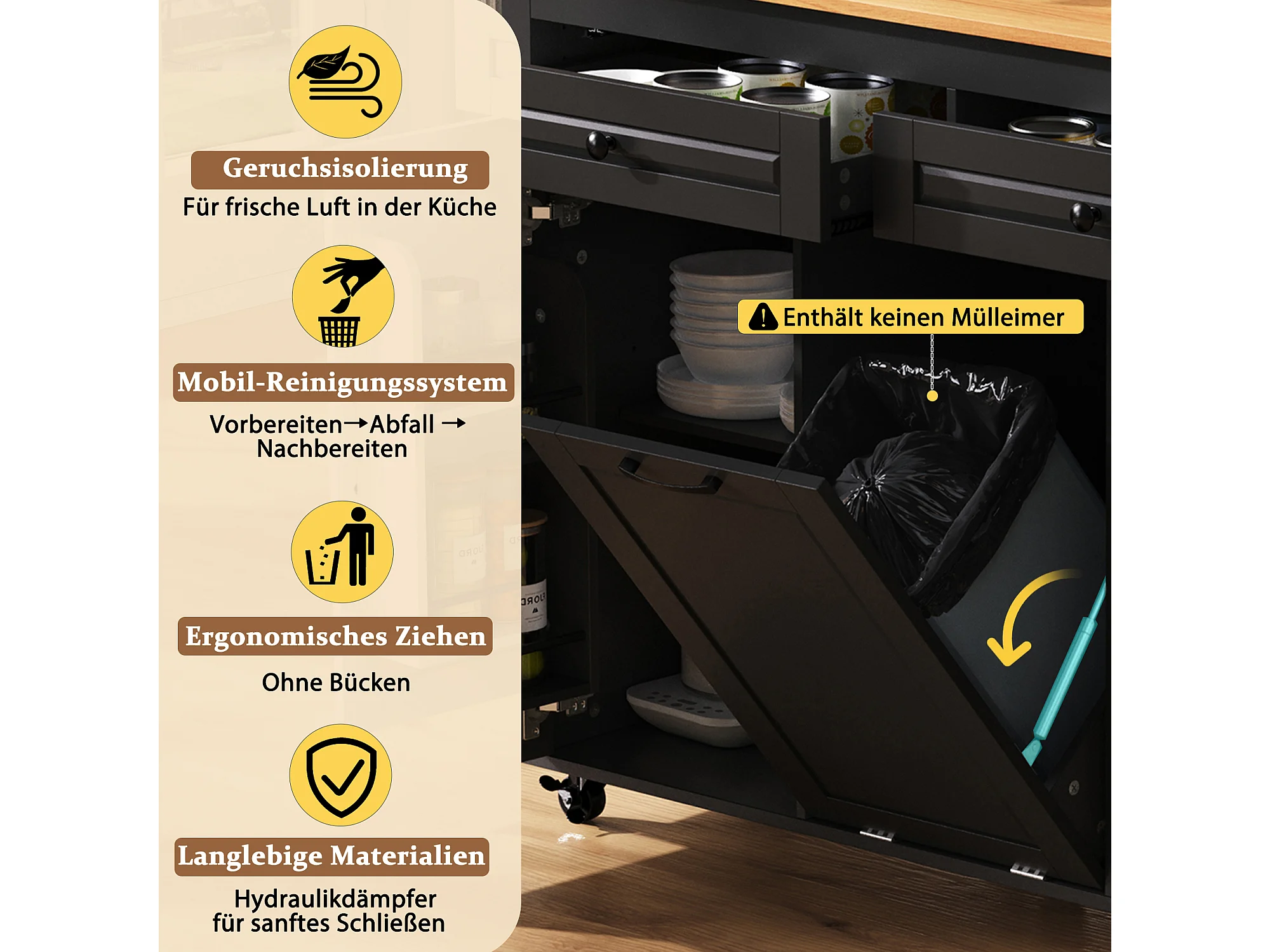 Carrito de cocina móvil moderno, negro, con cajones y armarios, superficie de madera clara (129x46x92 cm)