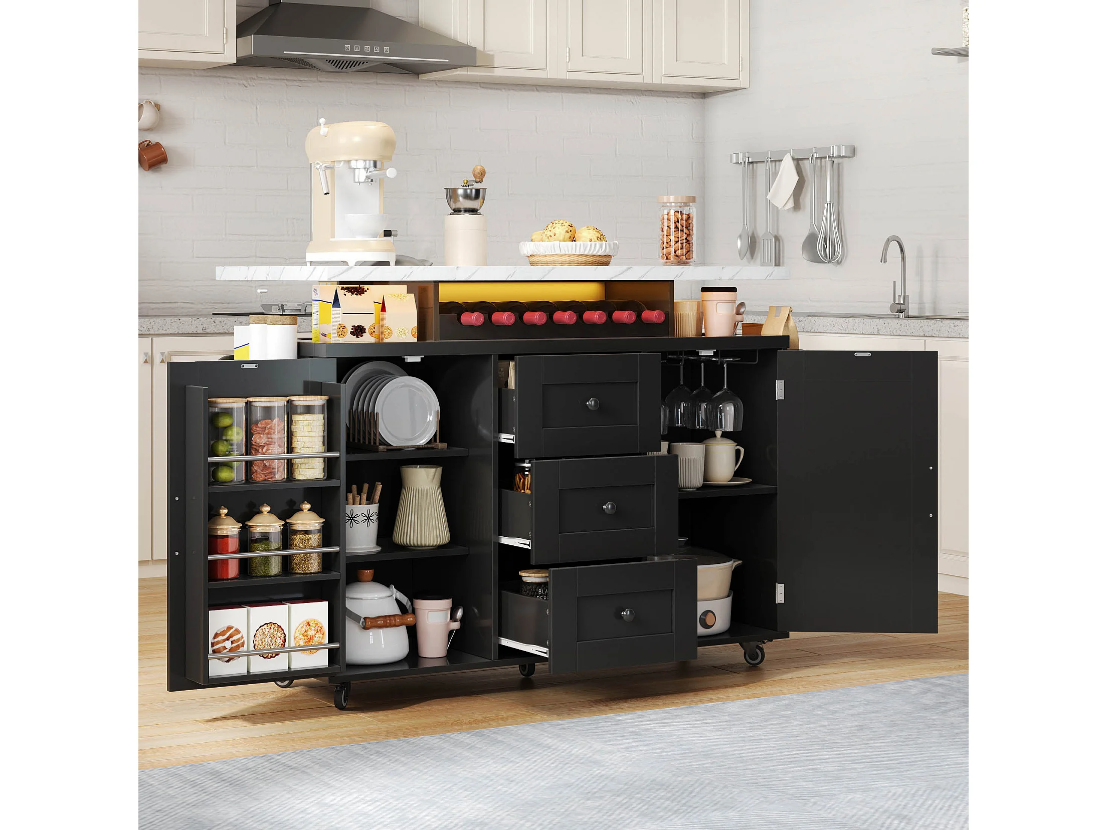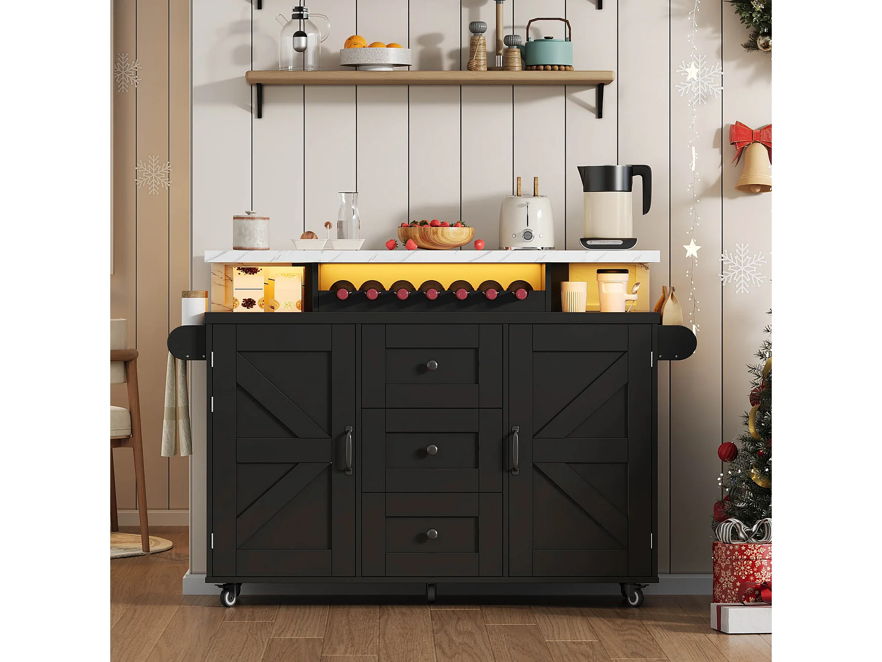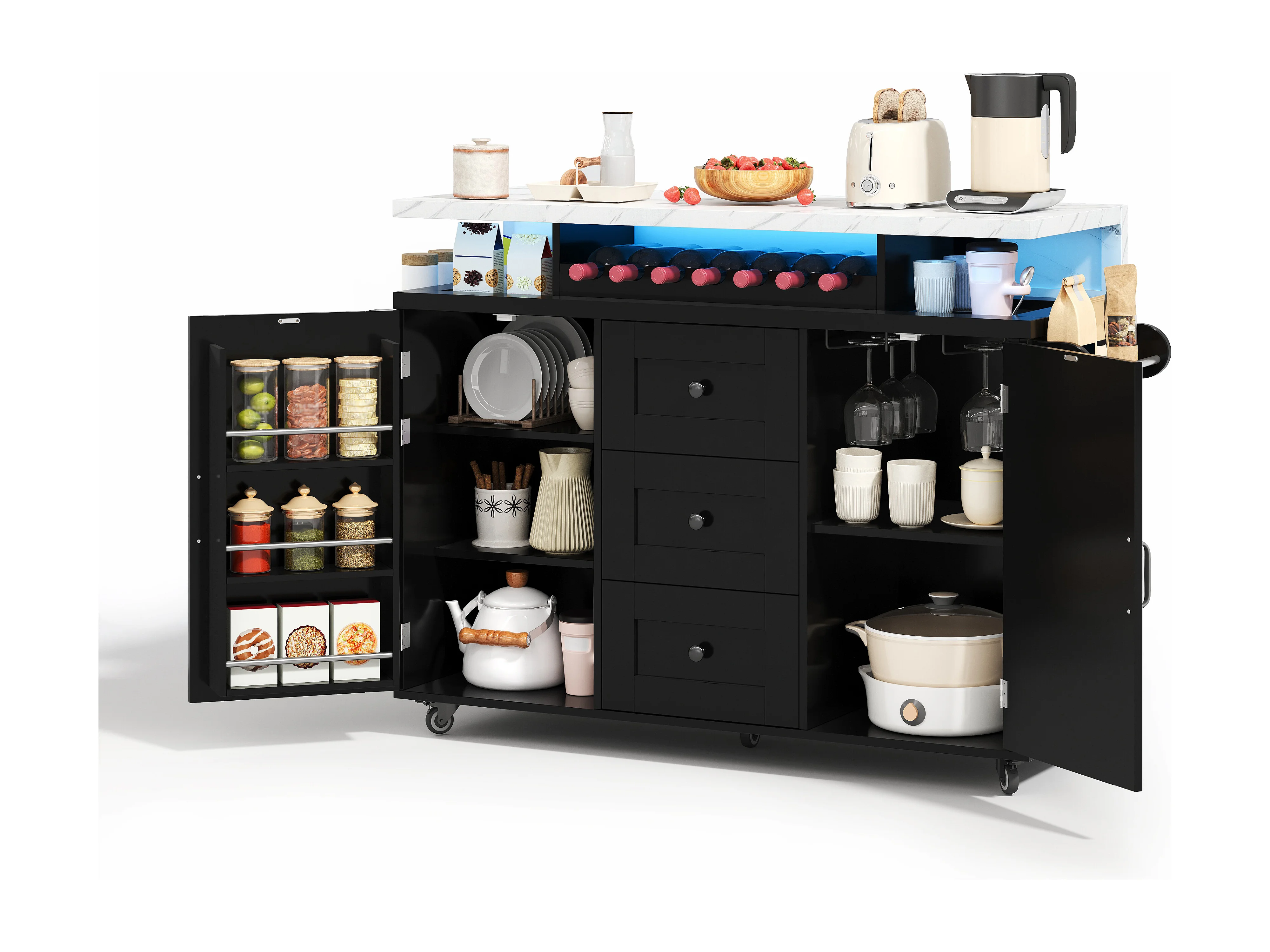 Isla de cocina móvil negra con iluminación LED, 2 puertas y 3 cajones - Encimera con efecto mármol blanco