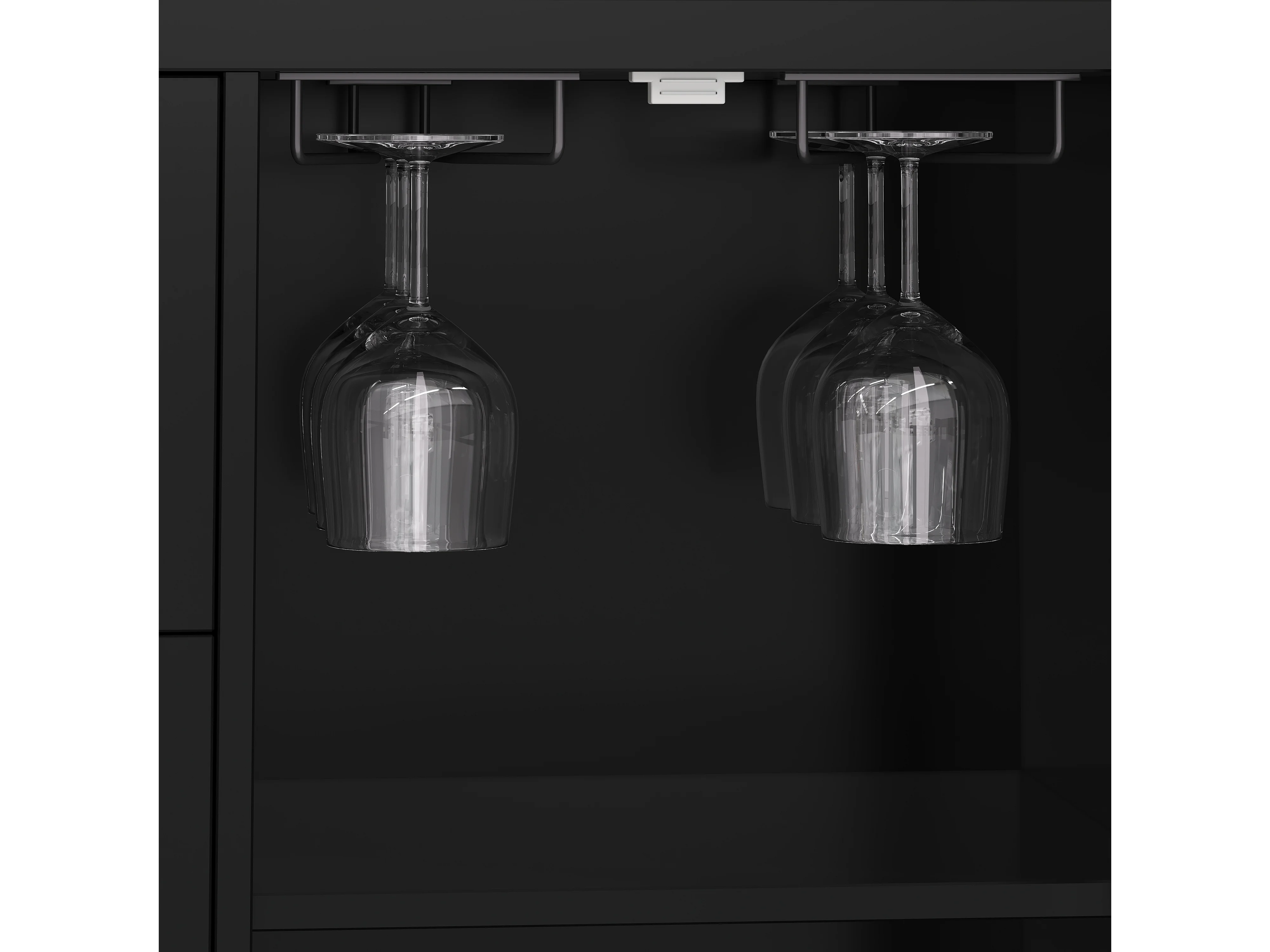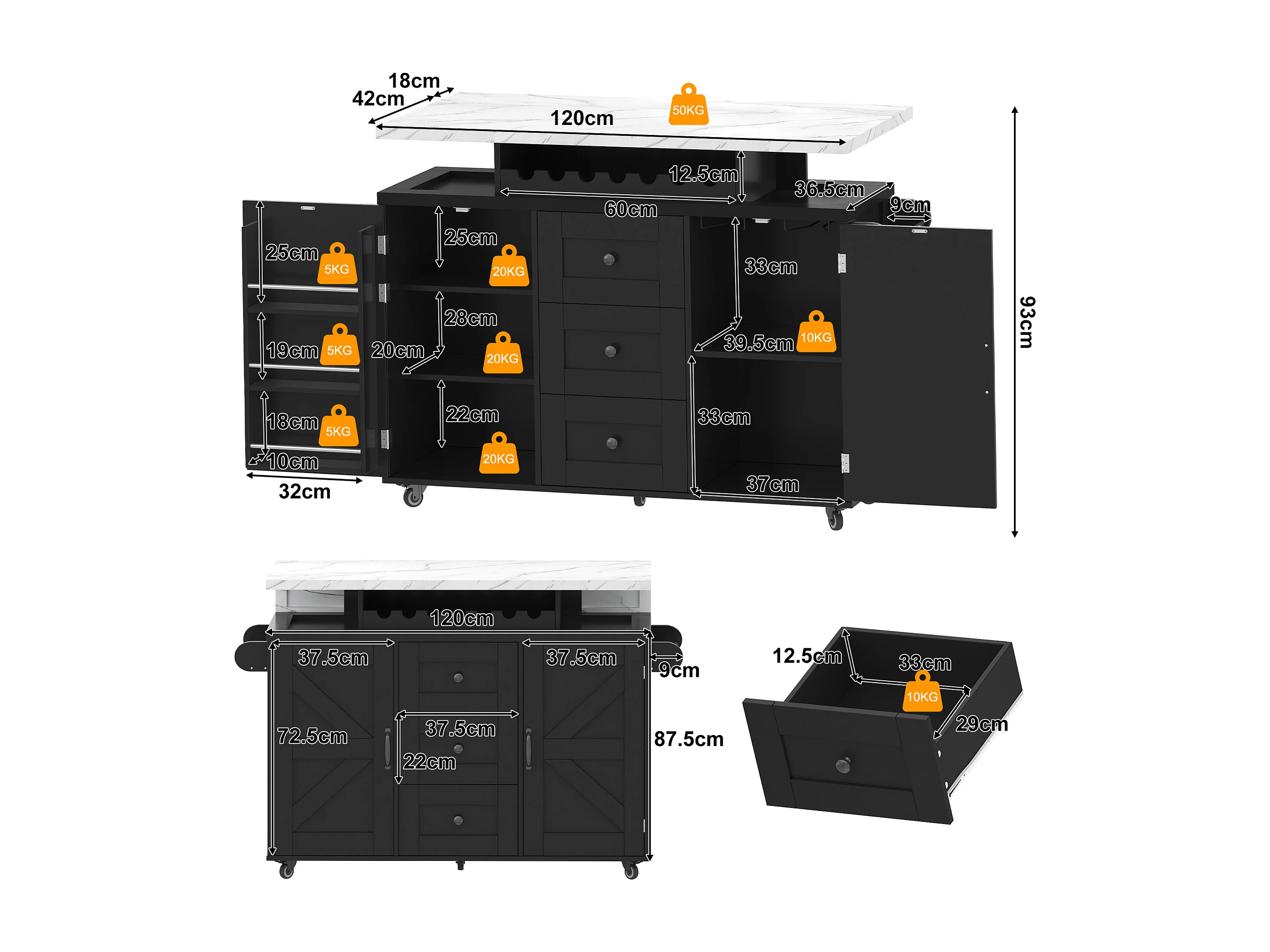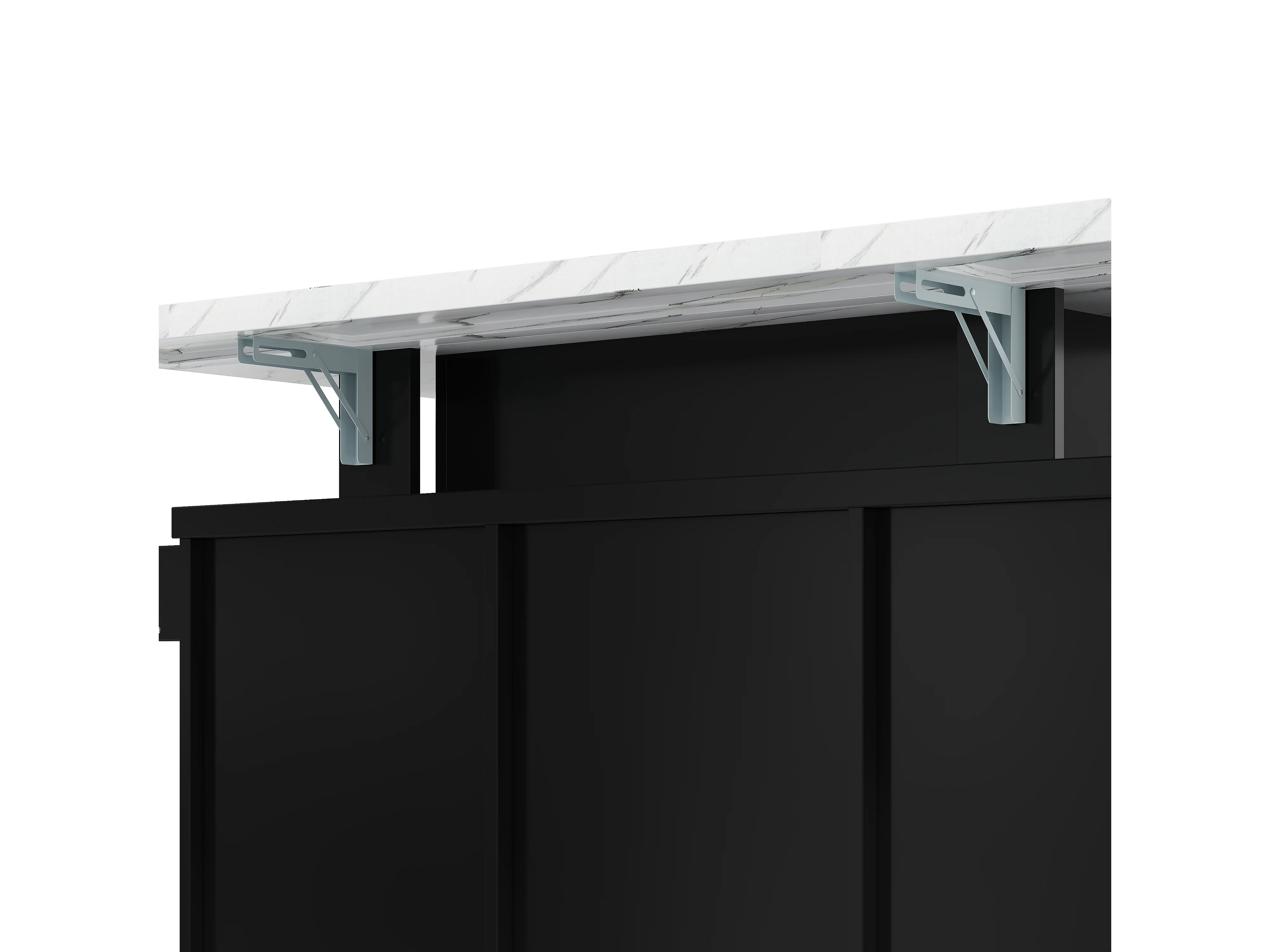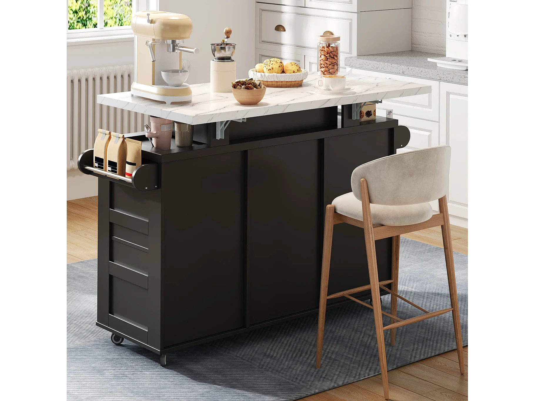 Isla de cocina móvil negra con iluminación LED, 2 puertas y 3 cajones - Encimera con efecto mármol blanco