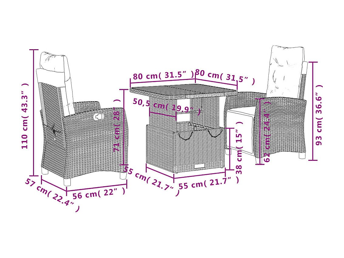 Toby Dean Set comedor de jardín 3 pzas con cojines ratán sintético negro