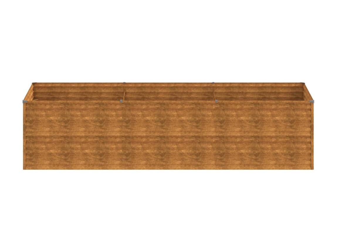 Esta jardinera será una excelente opción para que los entusiastas del bricolaje decoren jardines, balcones o patios. Material duradero: Acero corten, también conocido como acero resistente a la intemperie. Este es anticorrosivo por su propia naturaleza. Desarrolla una capa protectora oxidada contra la corrosión cuando se expone por primera vez a las condiciones atmosféricas. Por lo tanto, no es necesario pintarlo. Esto puede ayudarte a ahorrar en costes de mantenimiento y reparación. El distintivo color marrón del acero corten seguramente llamará la atención. Finalmente, el acero corten es excepcionalmente duradero y resistirá la prueba del tiempo.Amplio espacio: La jardinera arroate es lo suficientemente profunda y ancha para contener una gran cantidad de tierra y brinda un amplio espacio para plantas, verduras, hierbas y flores.Soporte adicional: Los soportes interiores de la jardinera garantizan su solidez y estabilidad.Plegado de borde seguro: El borde de la jardinera tiene un diseño de borde plegado, por lo que no quedan expuestos bordes afilados peligrosos.Función decorativa: La maceta sirve para tus plantas o flores favoritas, por lo que es ideal como decoración para la casa. Información útil:Cuando recibas este producto, aún no estará oxidado y tendrá un color metálico normal, pero se oxidará con el tiempo. Puedes acelerar el proceso de oxidación pulverizándolo con agua jabonosa y agua salada. Para que no se te manche la ropa, evita el contacto con la capa de óxido en desarrollo.