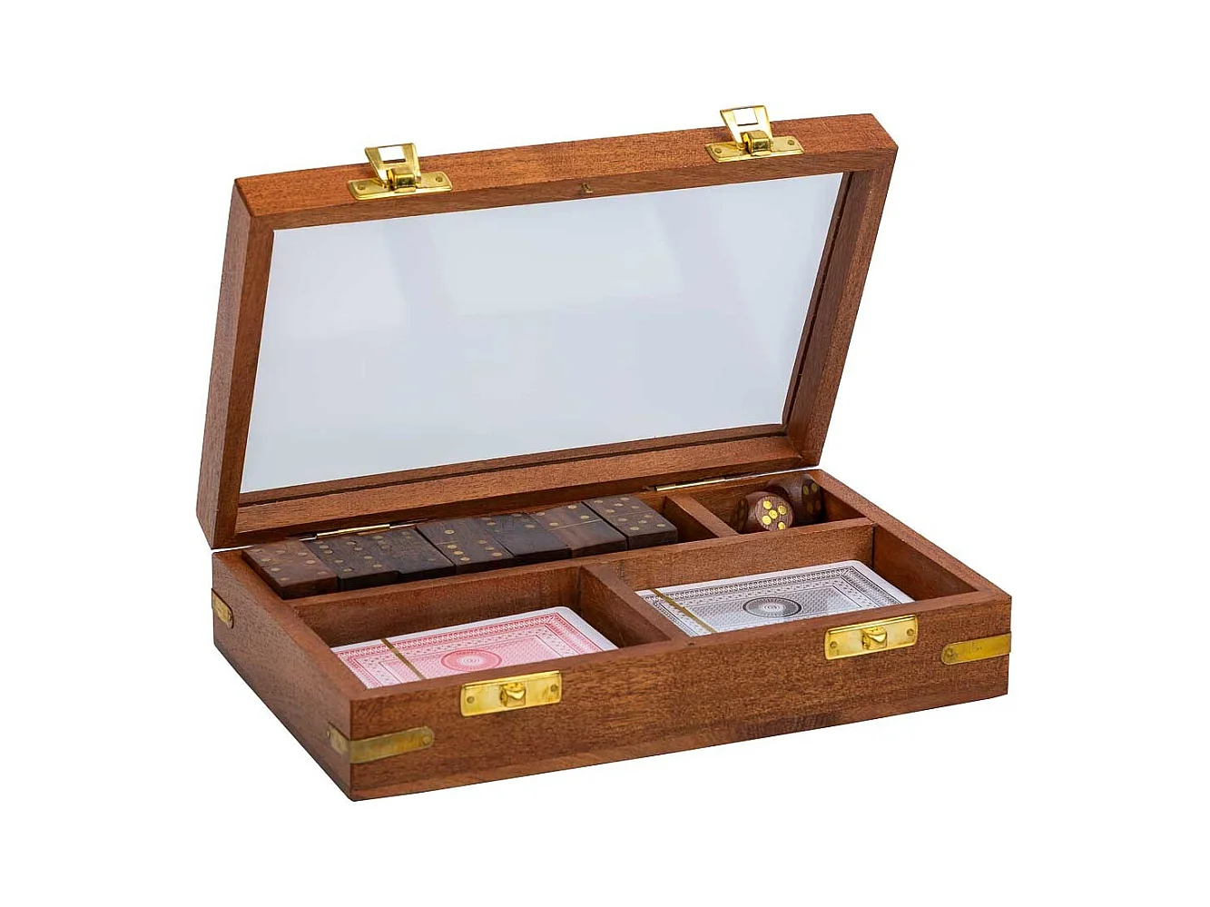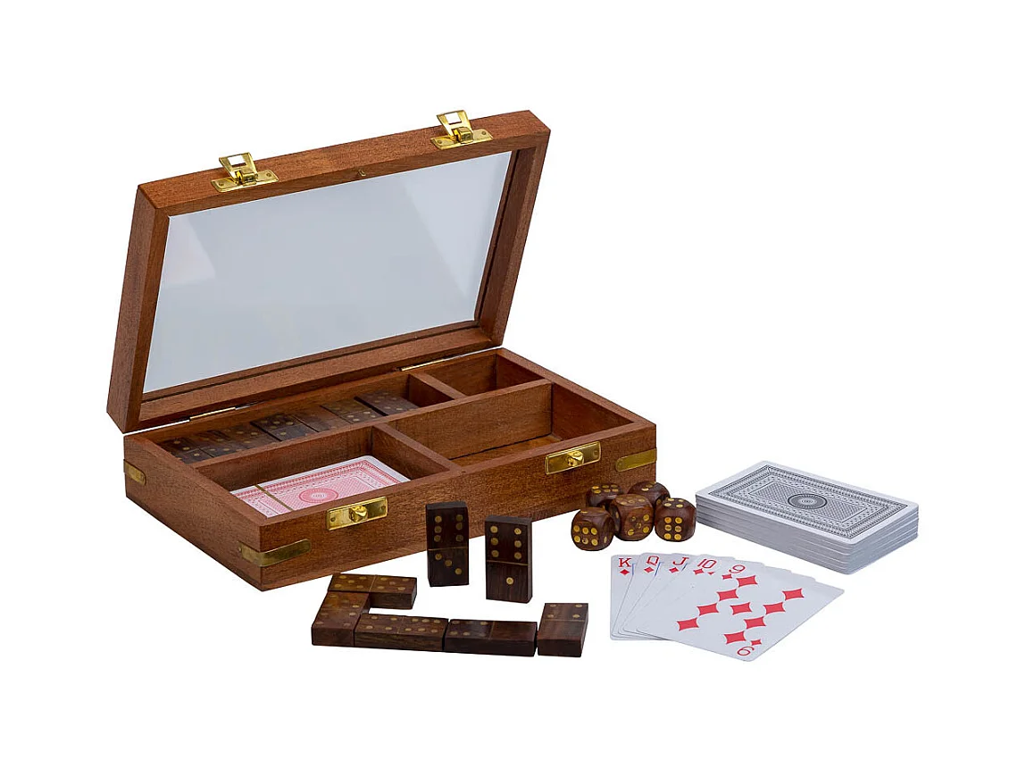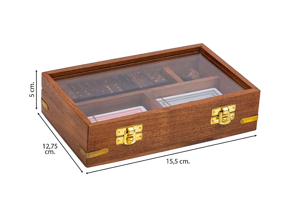 Juego 3/1 (dados+Dominó+cartas) en caja de madera marrón 15.5x12.75x5