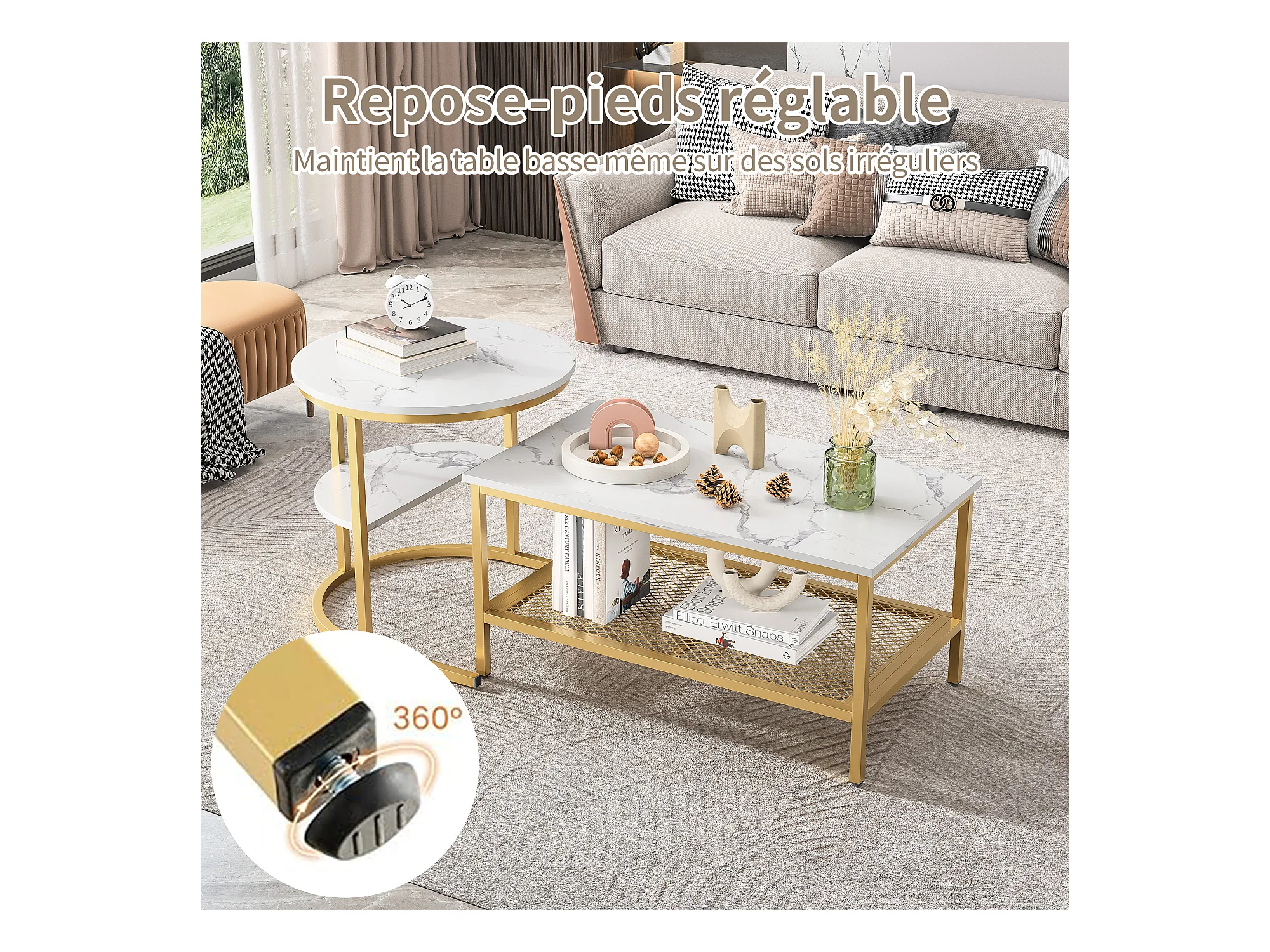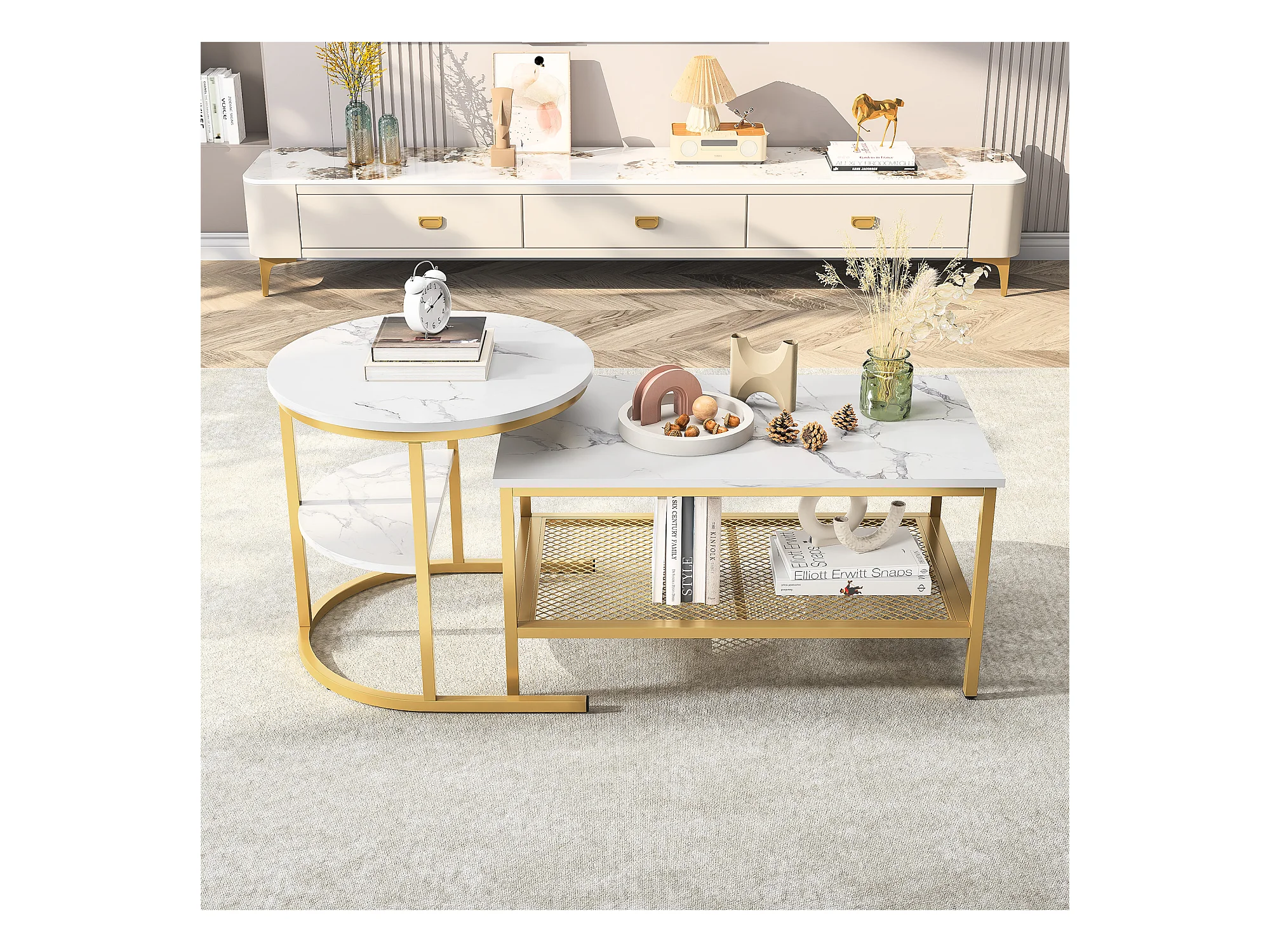 Juego de 2 mesas auxiliares de mármol con espacio de almacenamiento, dorado, metal.