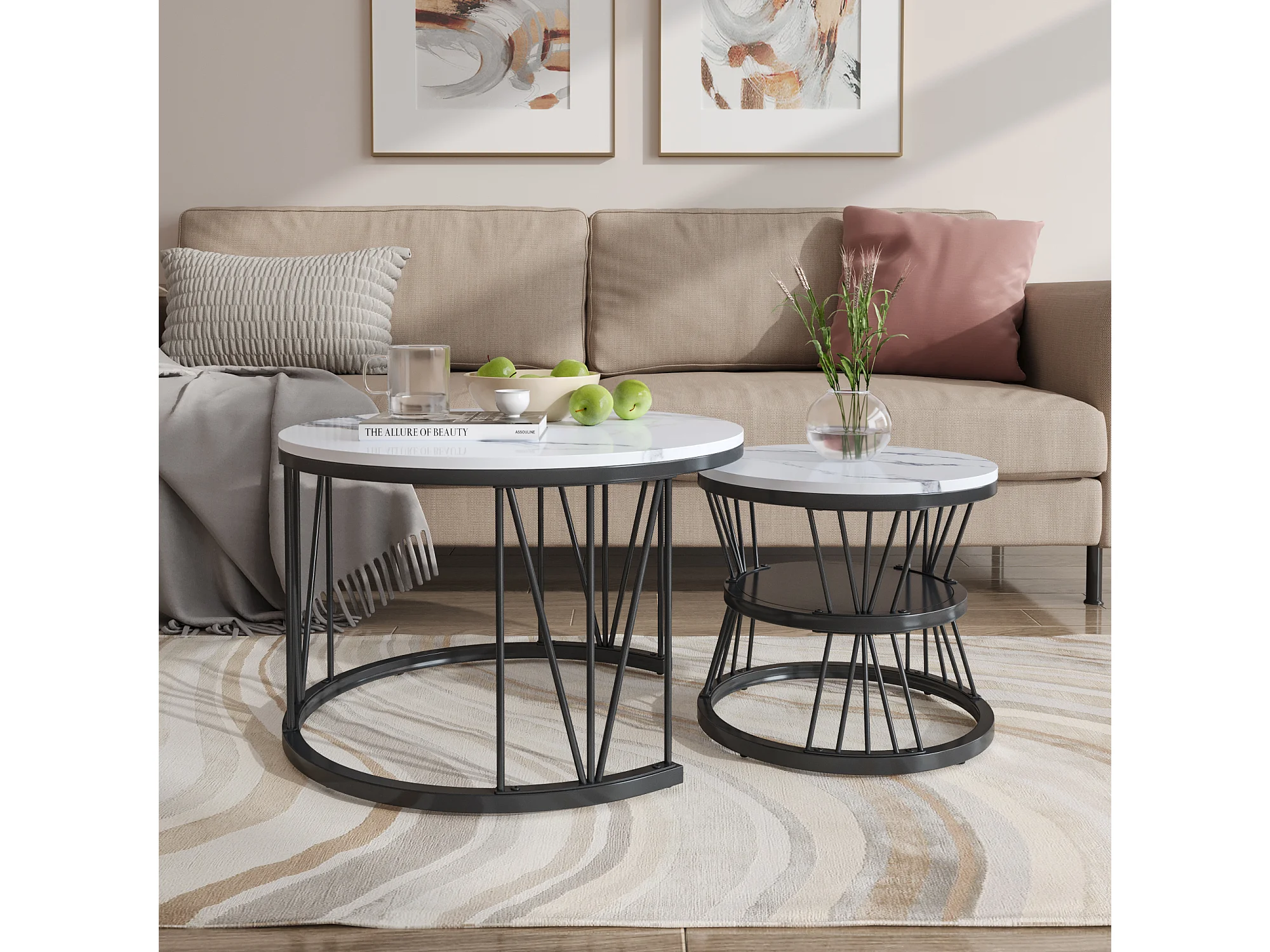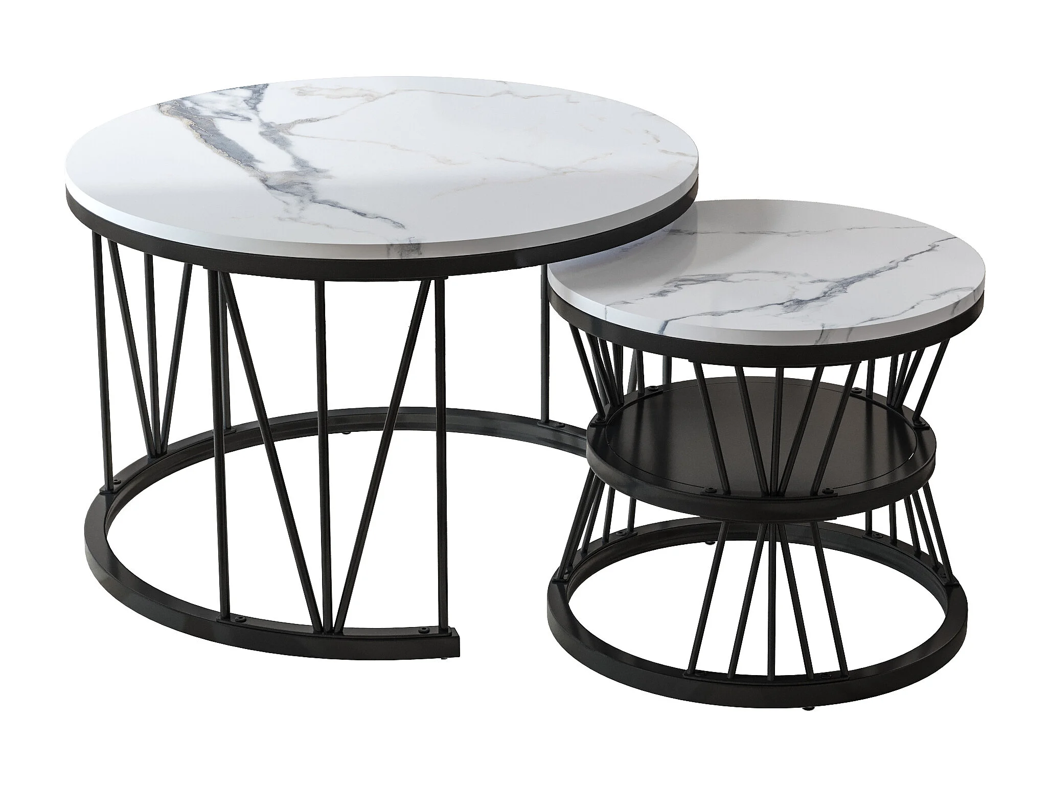 Juego de 2 mesas de centro redondas - Base en forma de V - Estructura de metal negro - Tapa con textura de mármol blanco