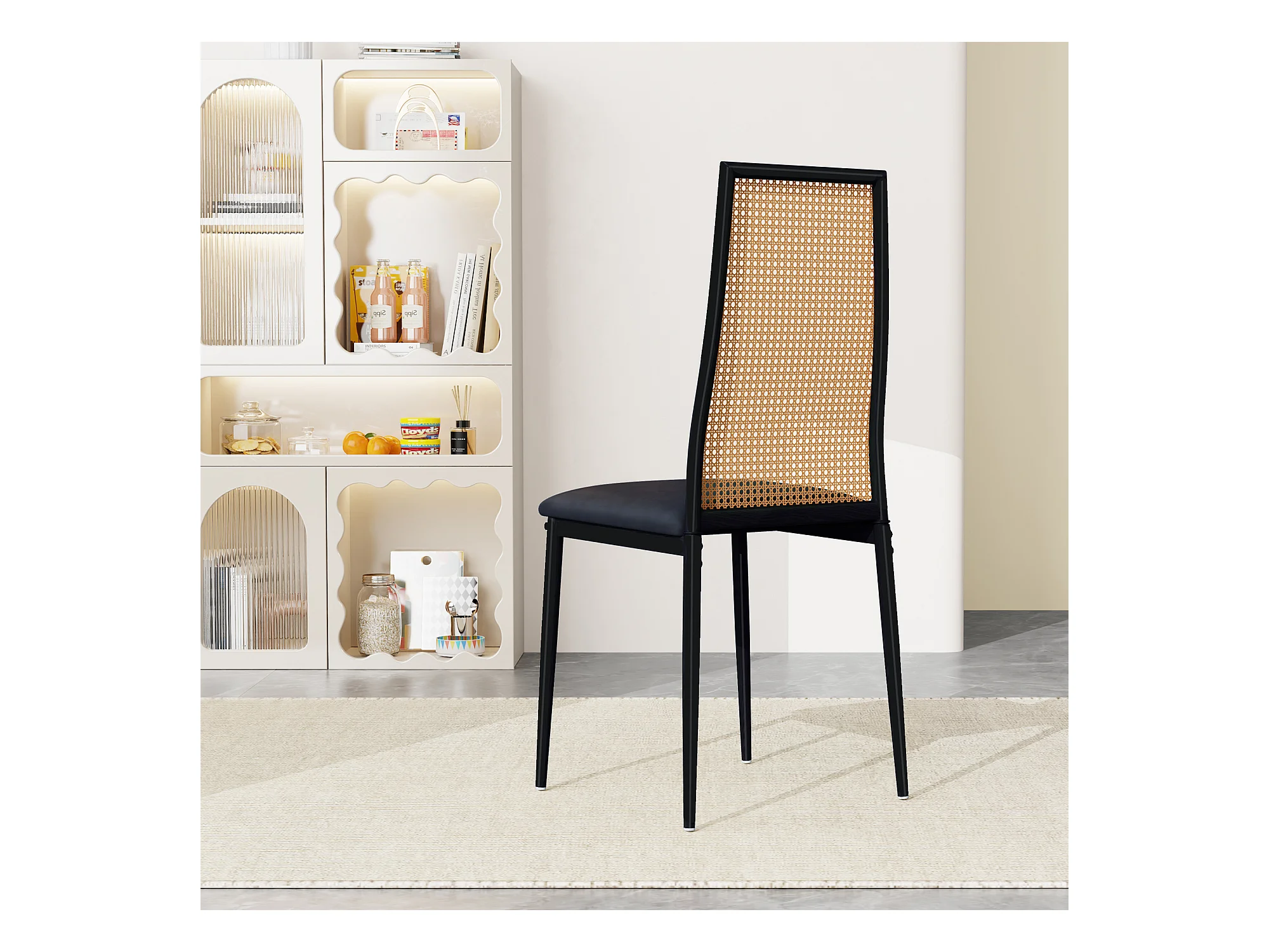 Juego de 2 sillas de comedor de ratán tapizadas sin brazos con patas de metal, color negro