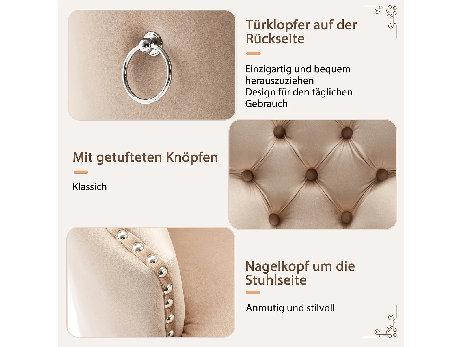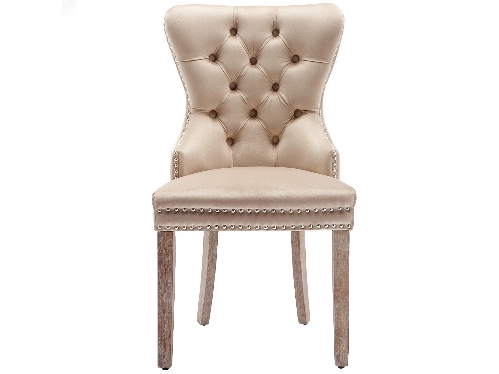 Juego de 2 sillas de comedor - Detalles remachados - Patas de madera maciza - Terciopelo - Beige