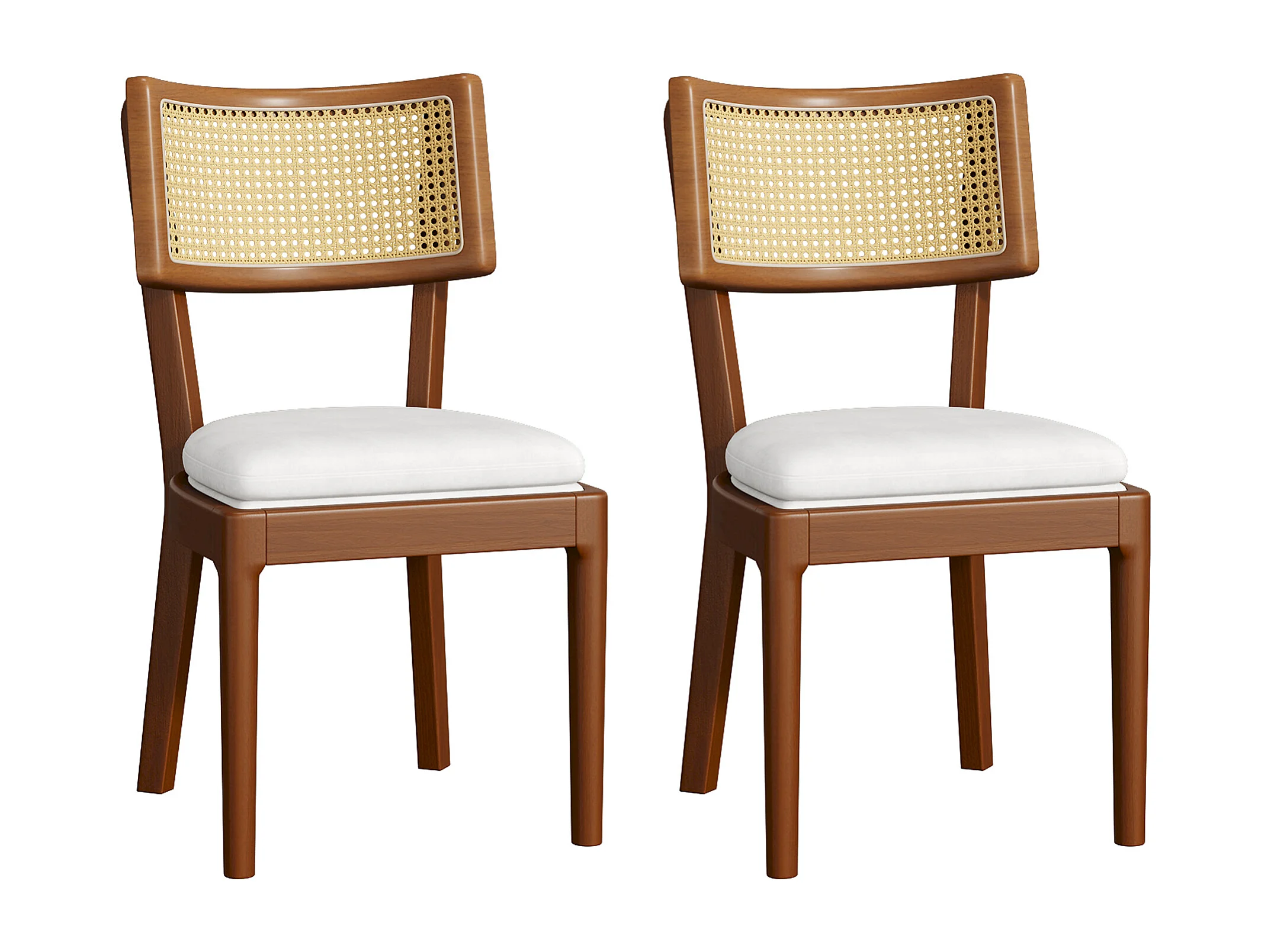Lote de 2 sillas de comedor - Respaldo de ratán - Cojín de asiento de lino - Madera maciza - Marrón