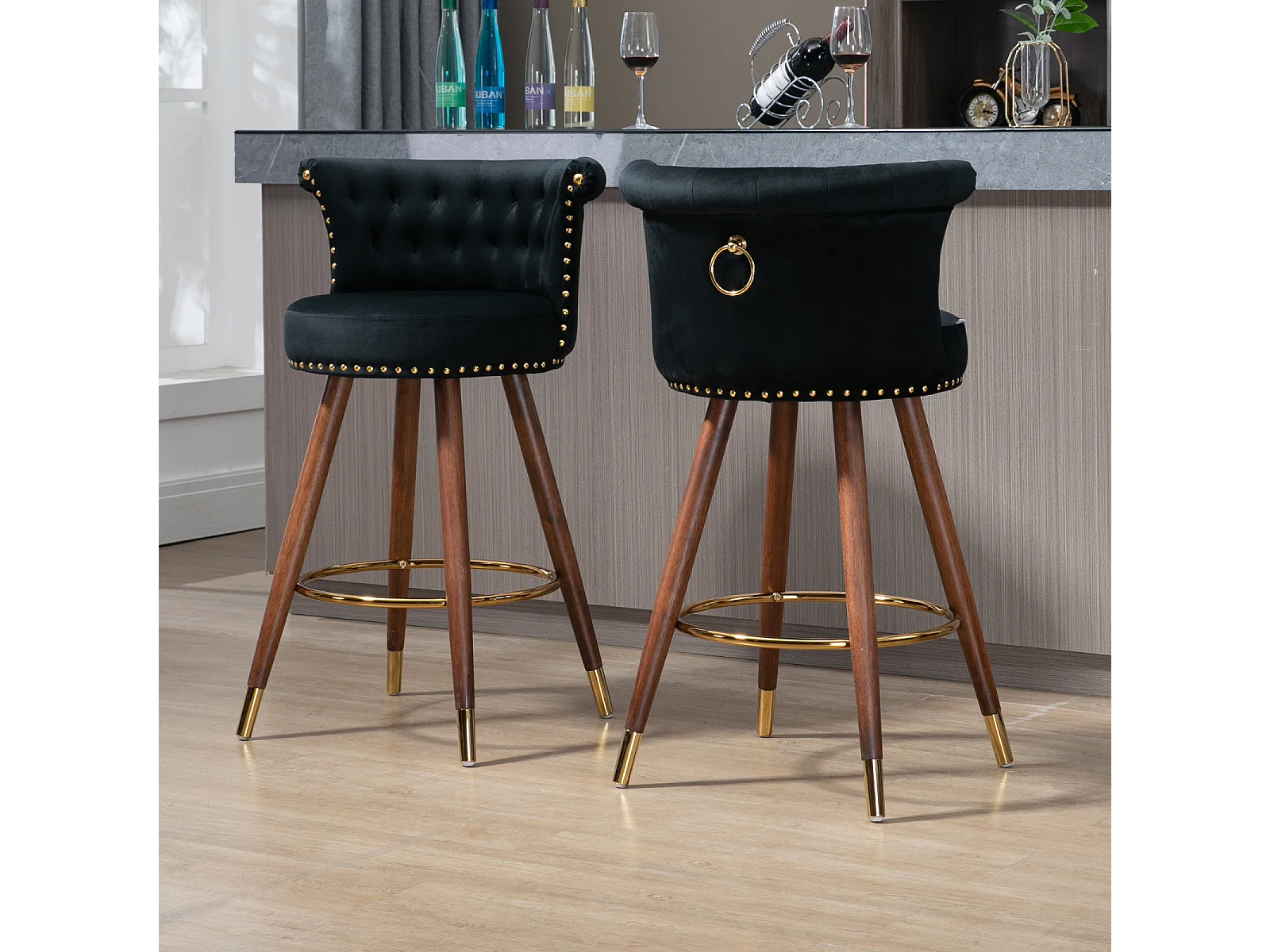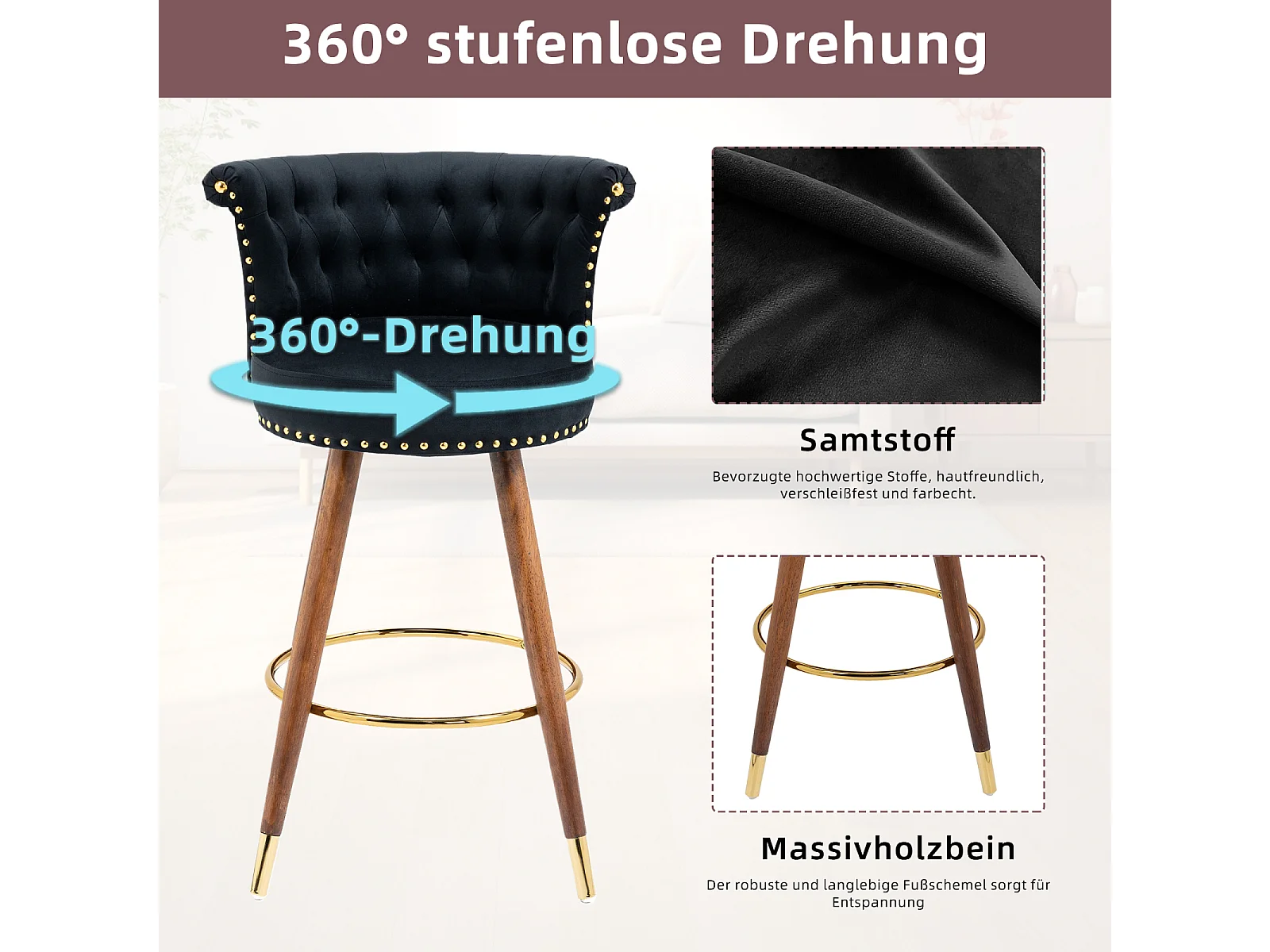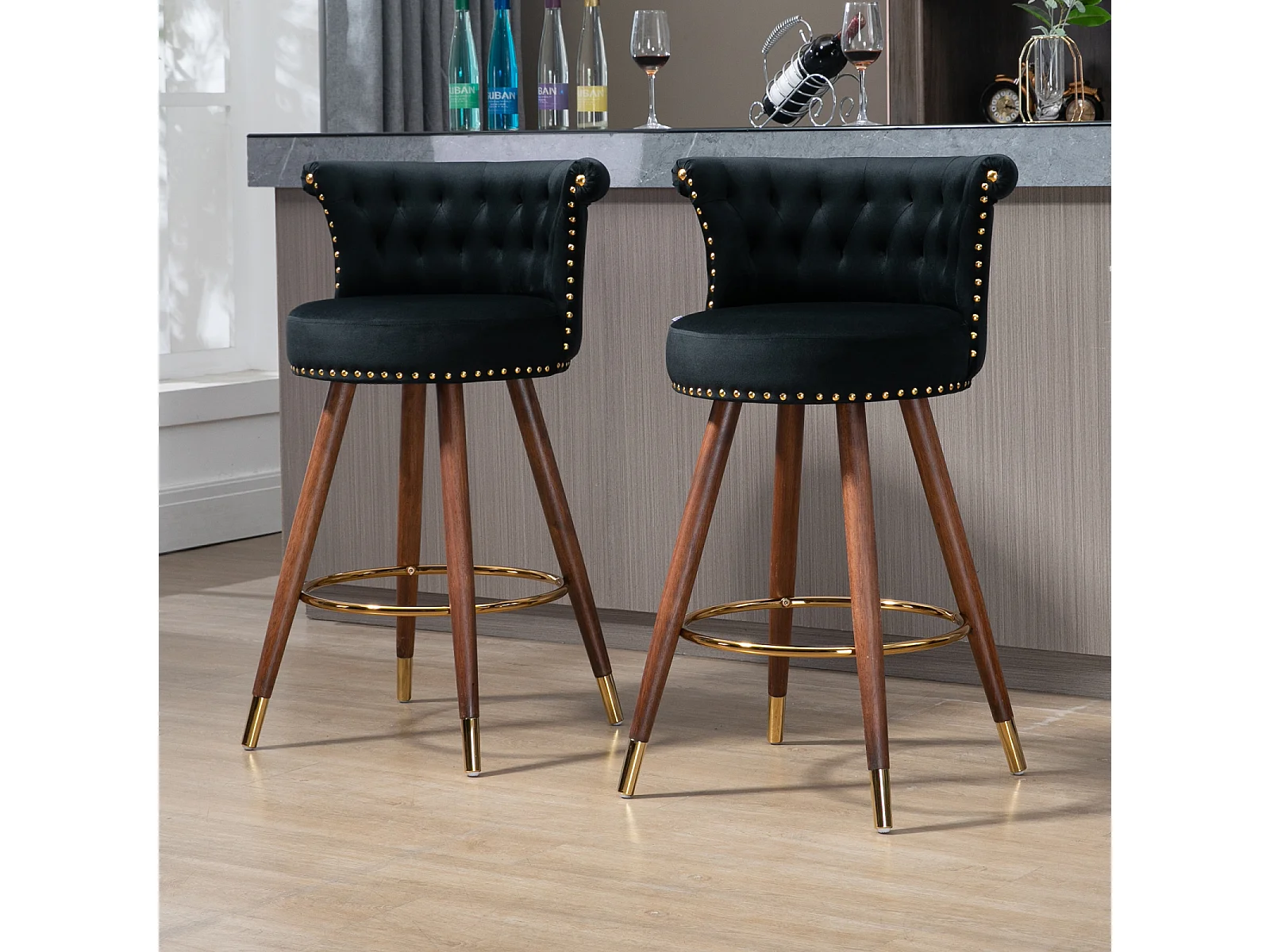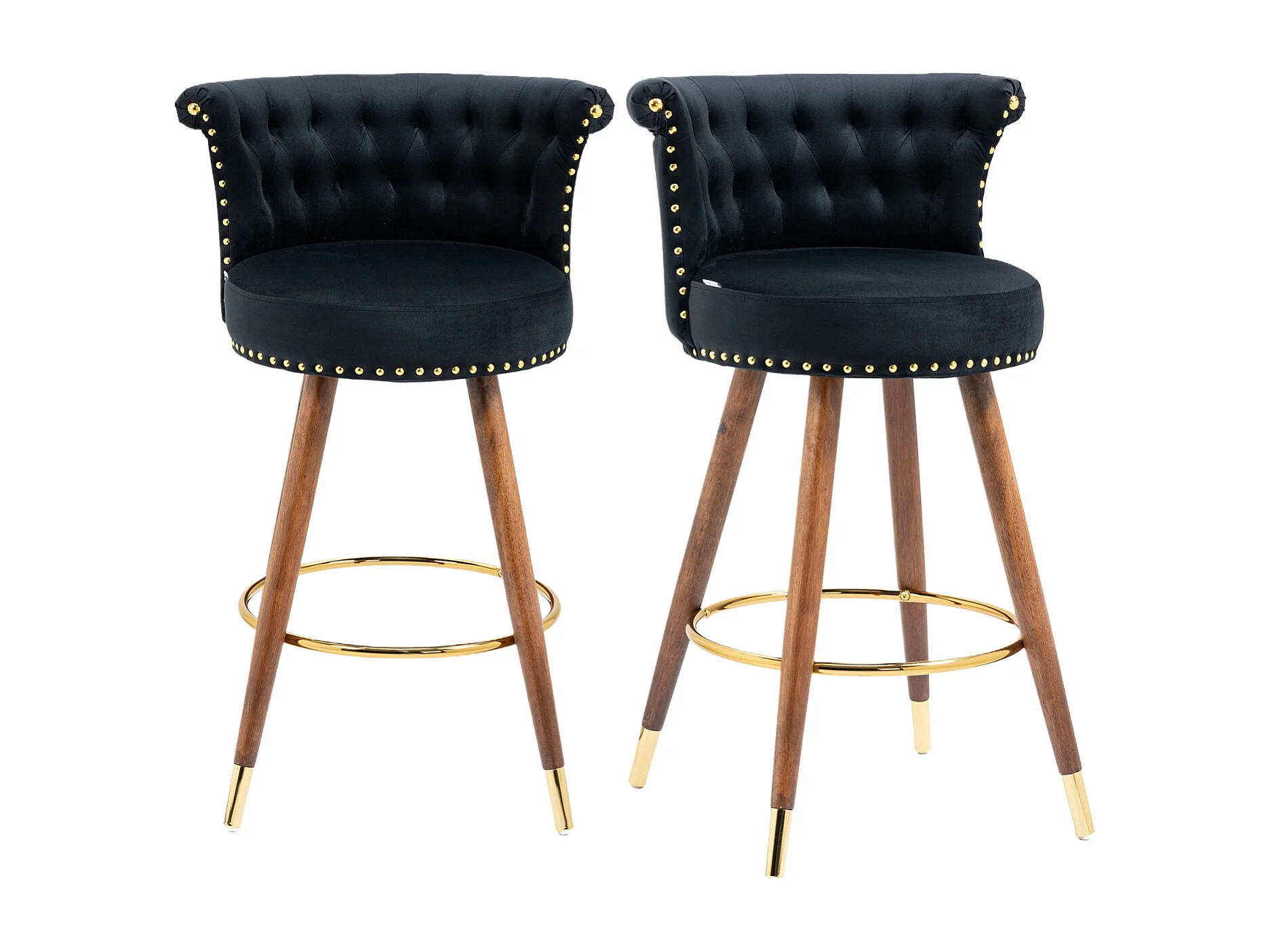 Juego de 2 taburetes de bar giratorios 55,5x51x95,5cm, con respaldo y reposapiés, altura fija 360 grados, color negro
