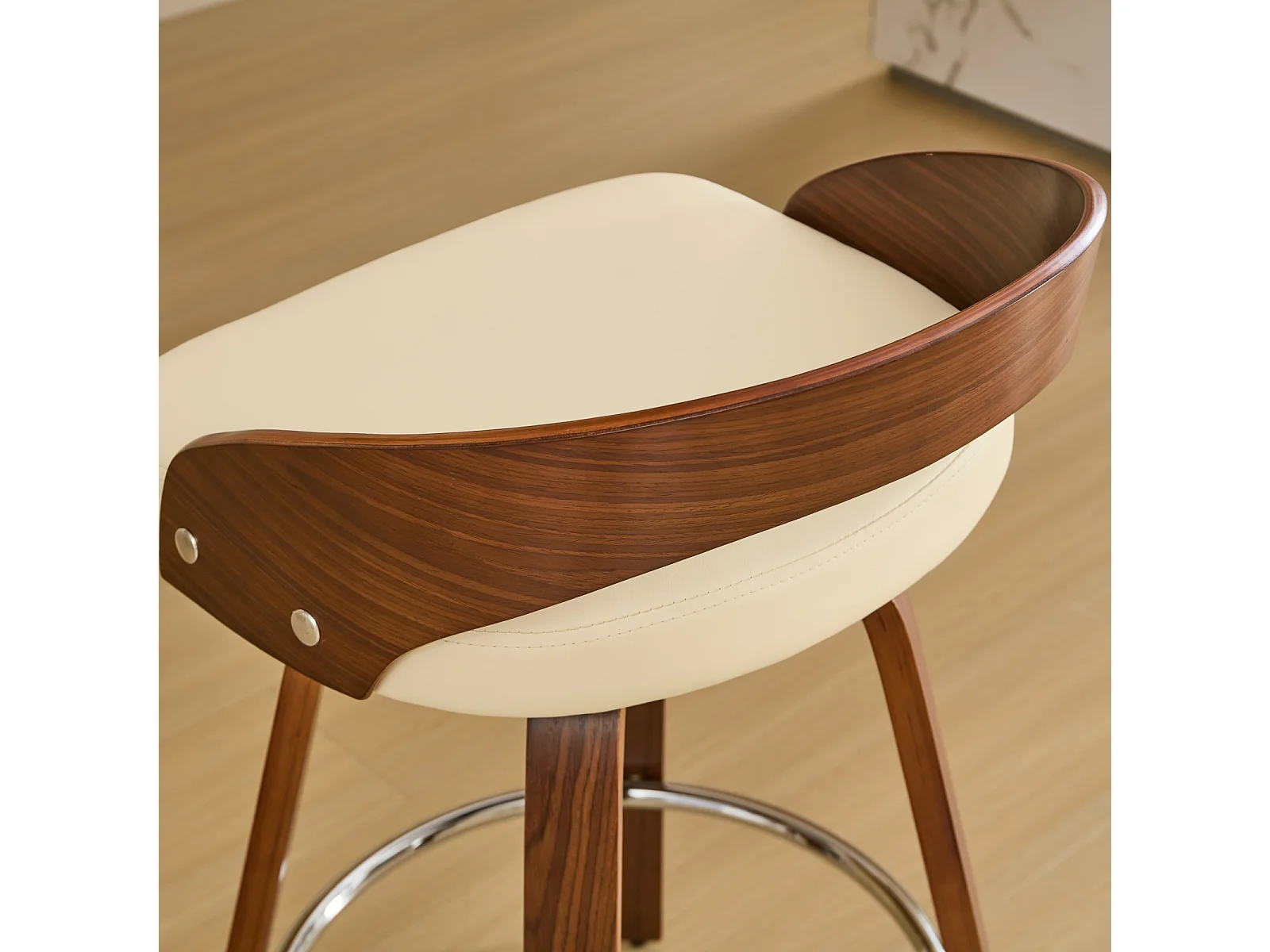 Juego de 2 taburetes de bar giratorios en PU con respaldo bajo - Beige y madera oscura