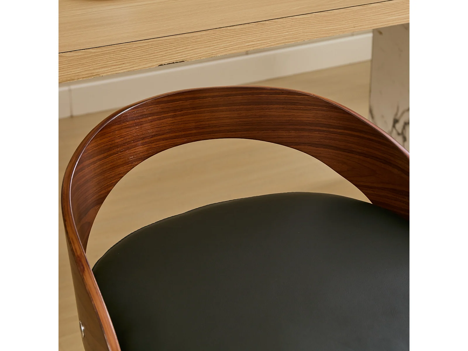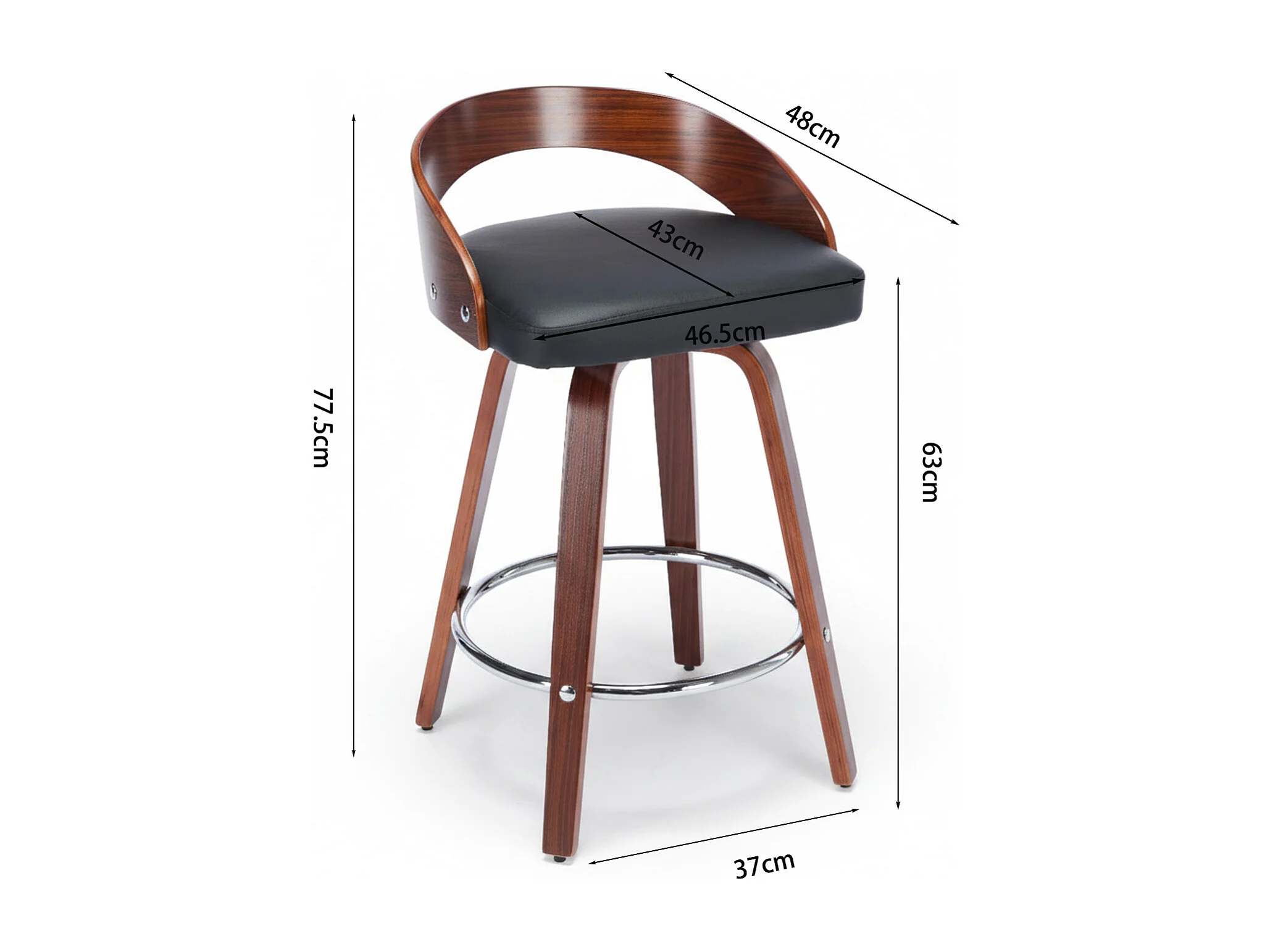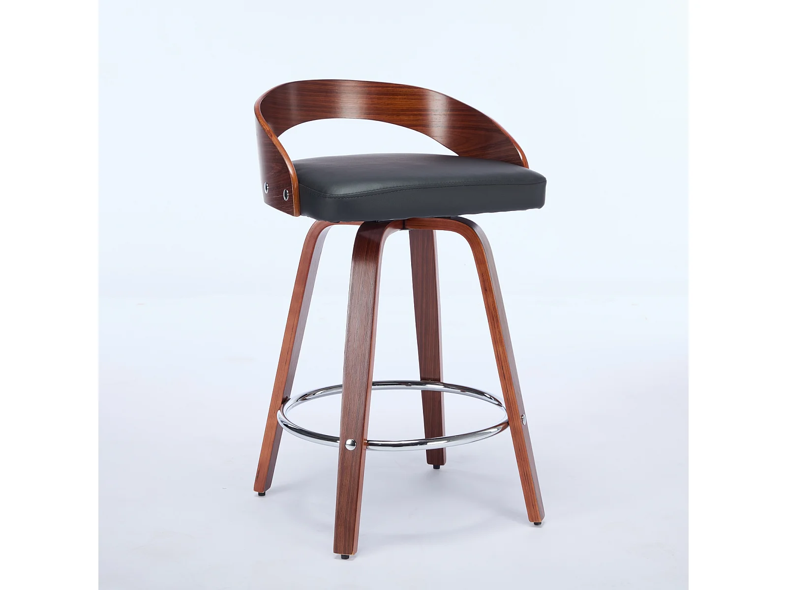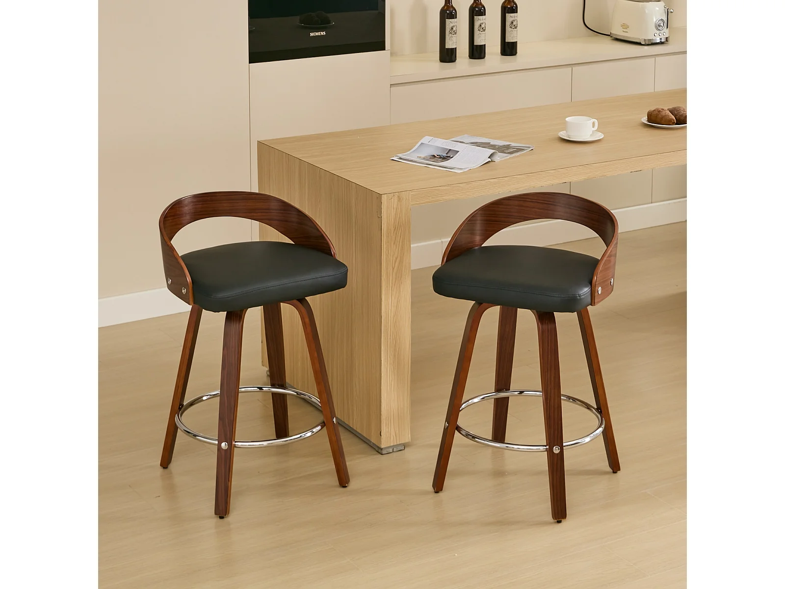 Juego de 2 taburetes de bar giratorios en PU con respaldo bajo - Negro y madera oscura