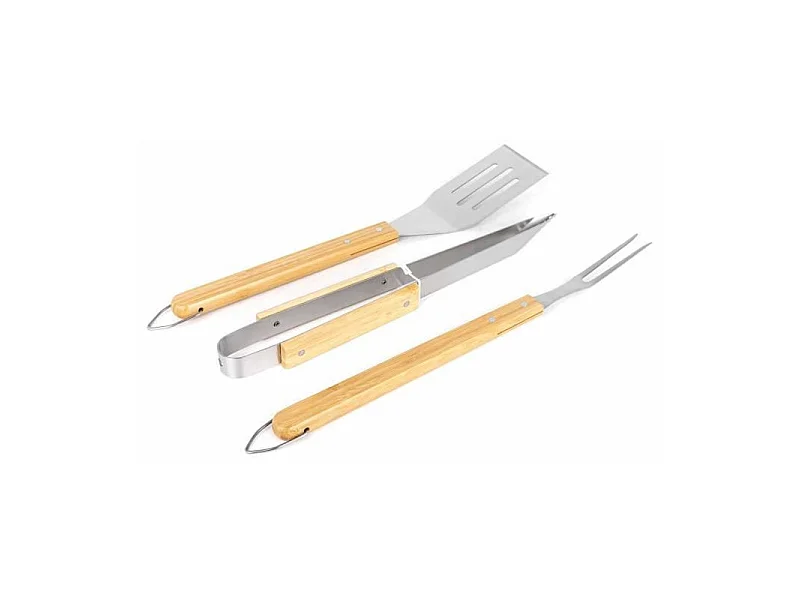 Juego de 3 accesorios de acero inoxidable con asas de bambú para barbacoa y parrilla