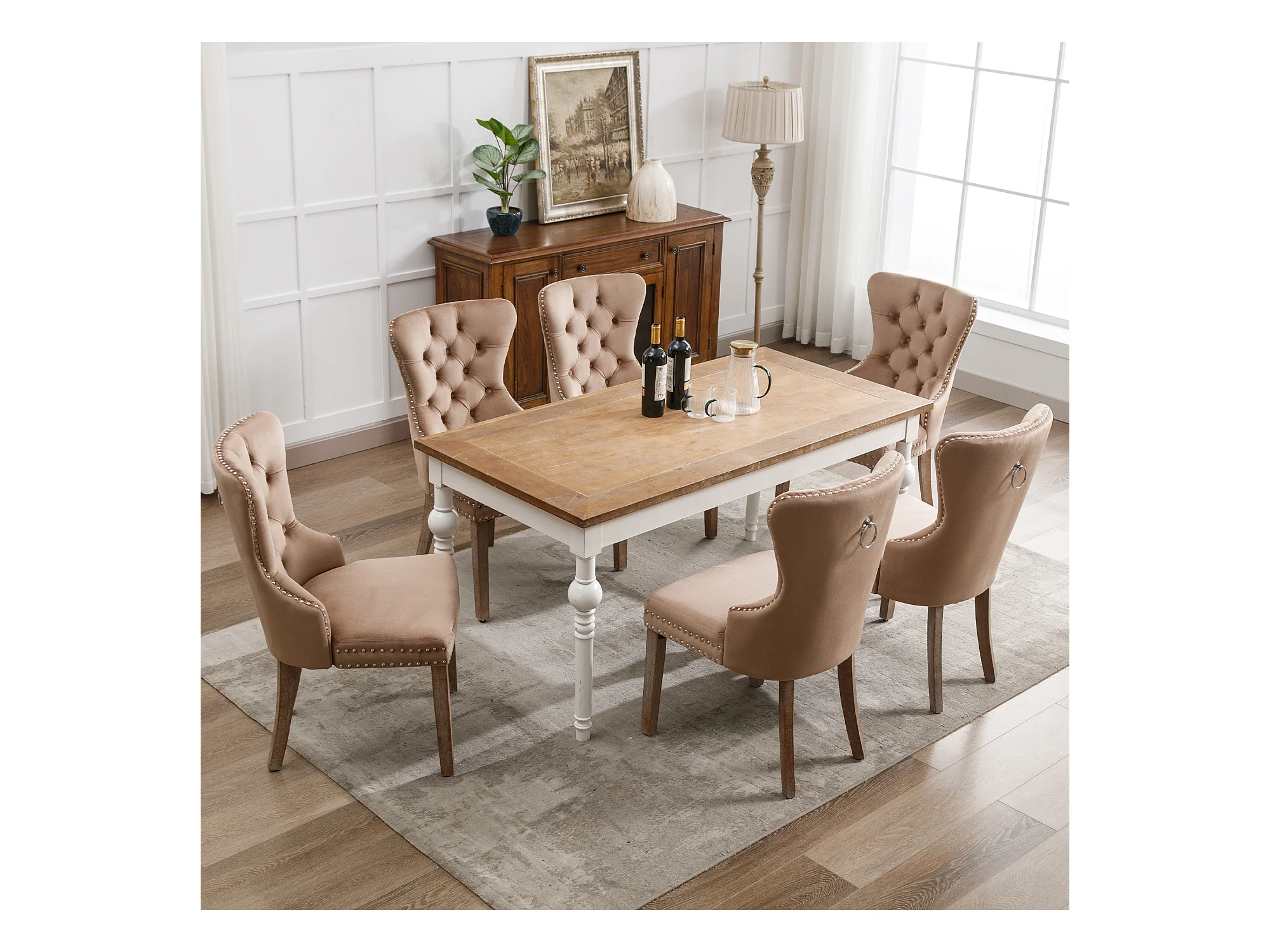 Silla de comedor de terciopelo con patas de madera maciza y reposapiés ajustable, decoración de uñas marrón café, juego de 6