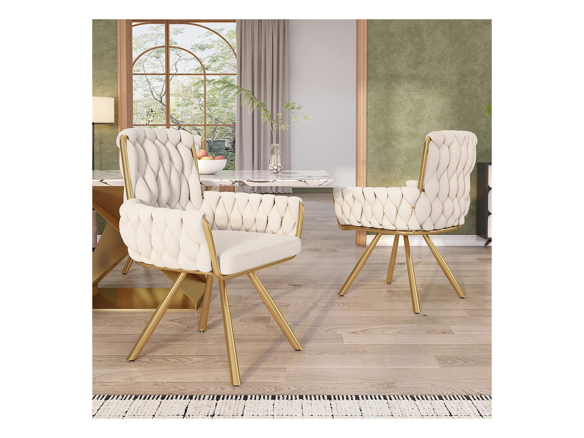 Juego de 6 sillas de terciopelo - 83 x 53 x 57 cm - Cuatro patas de metal dorado - Con reposabrazos y patas ajustables - Beige