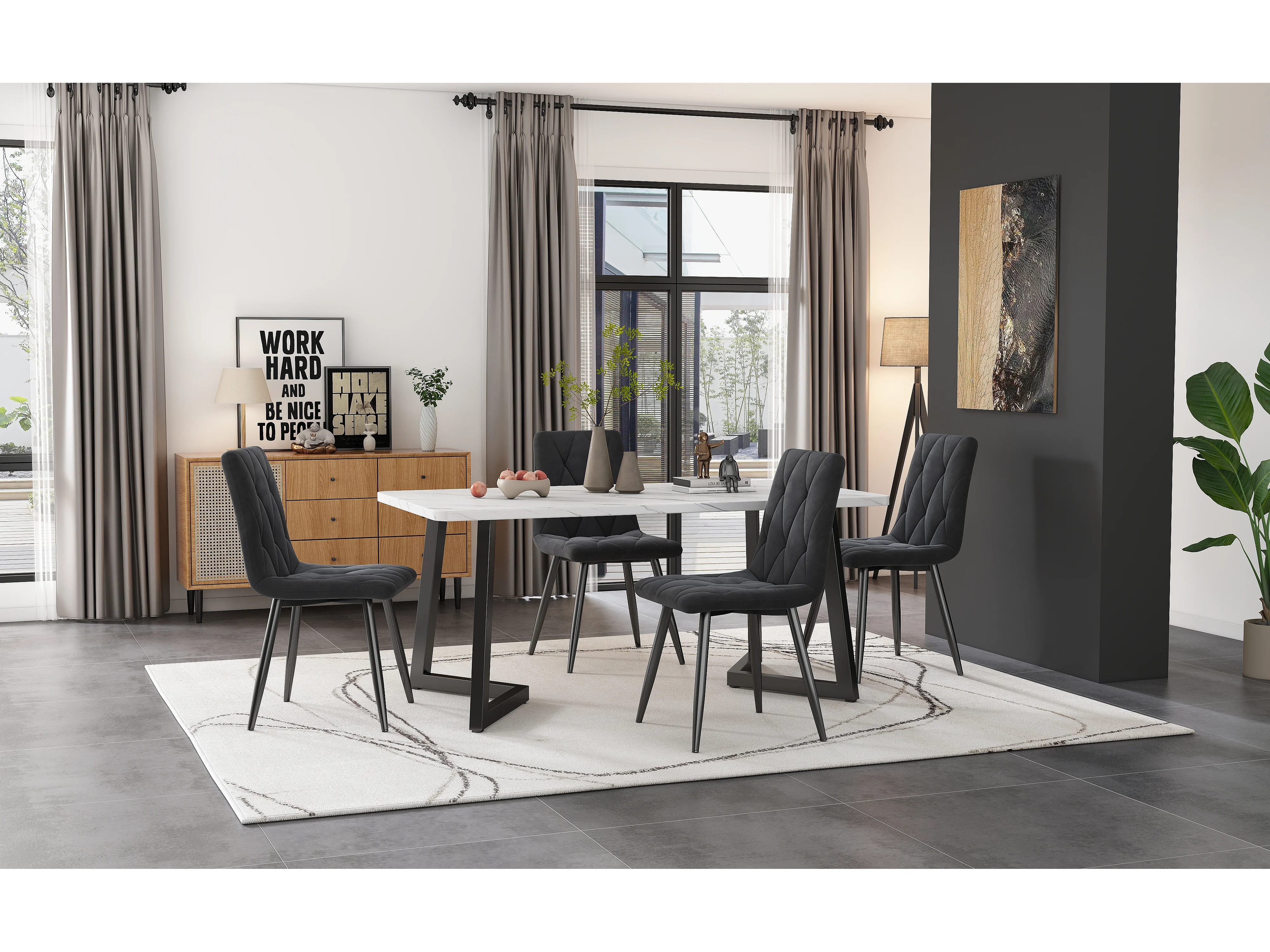 Conjunto de comedor, mesa 140×80×75cm con 4 sillas con patas regulables, MDF+metal+terciopelo, blanco+negro+dorado