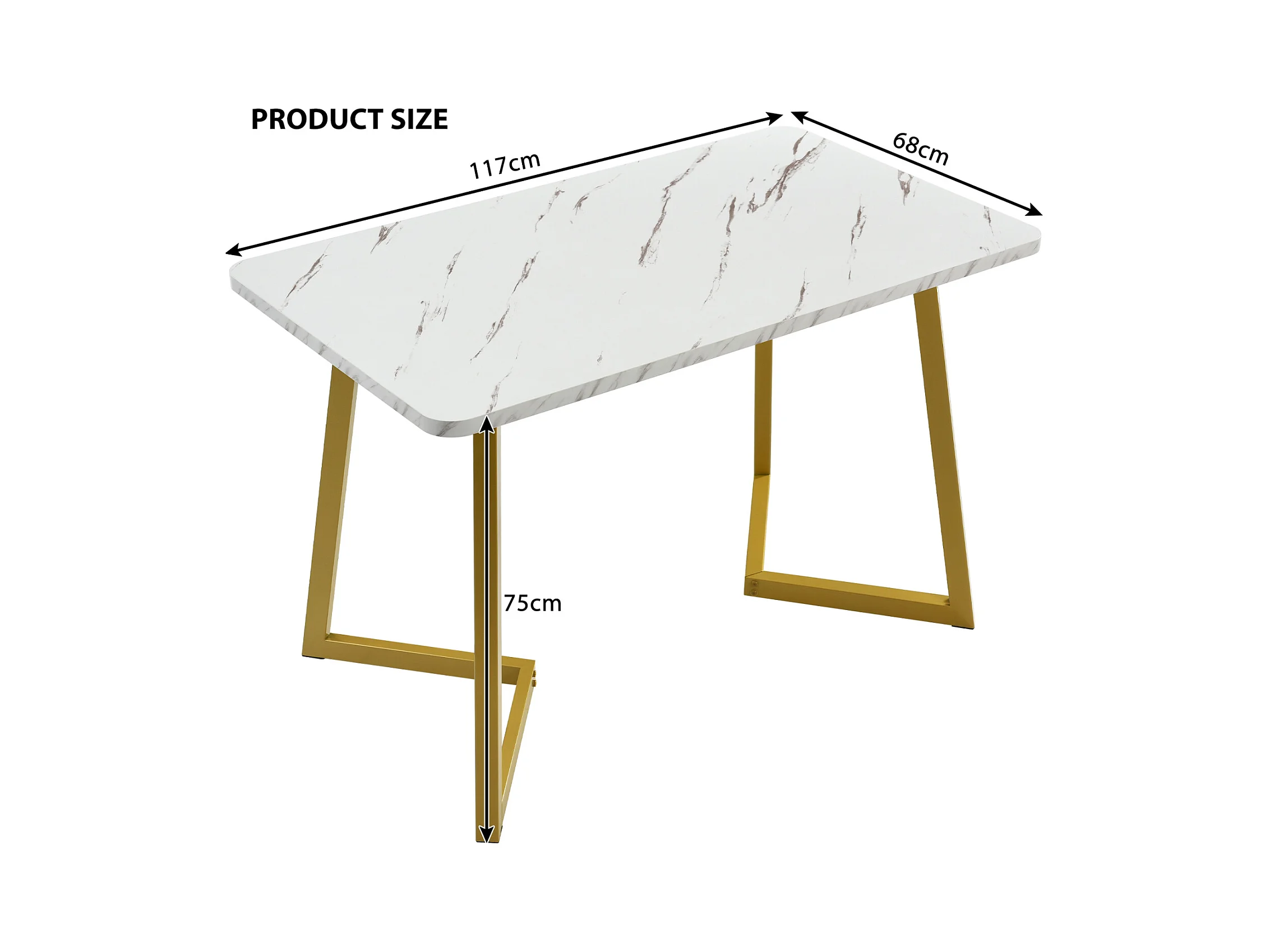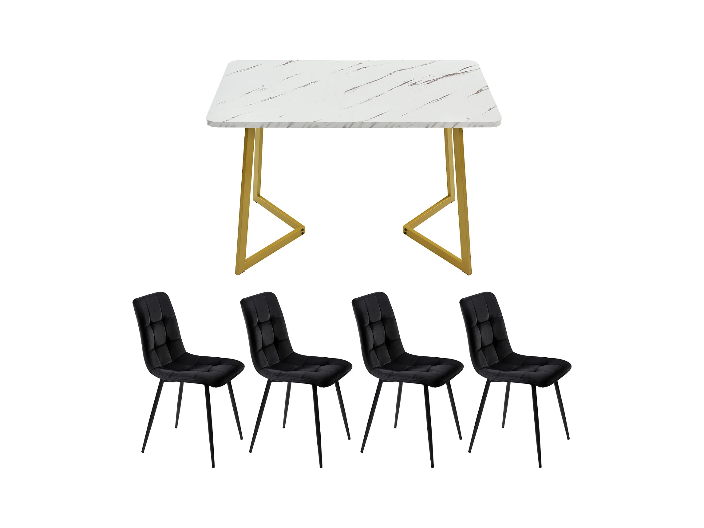 Conjunto de comedor de 5 piezas: mesa de 140×80 cm con tablero de MDF blanco y patas de metal dorado + 4 sillas de terciopelo negro, diseño moderno.